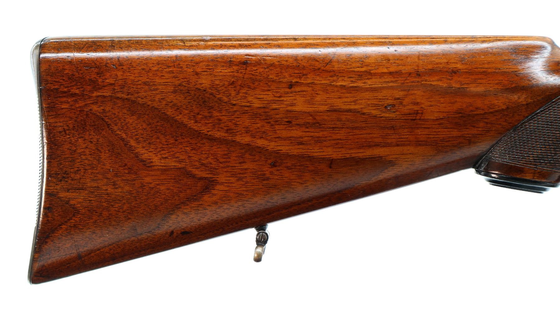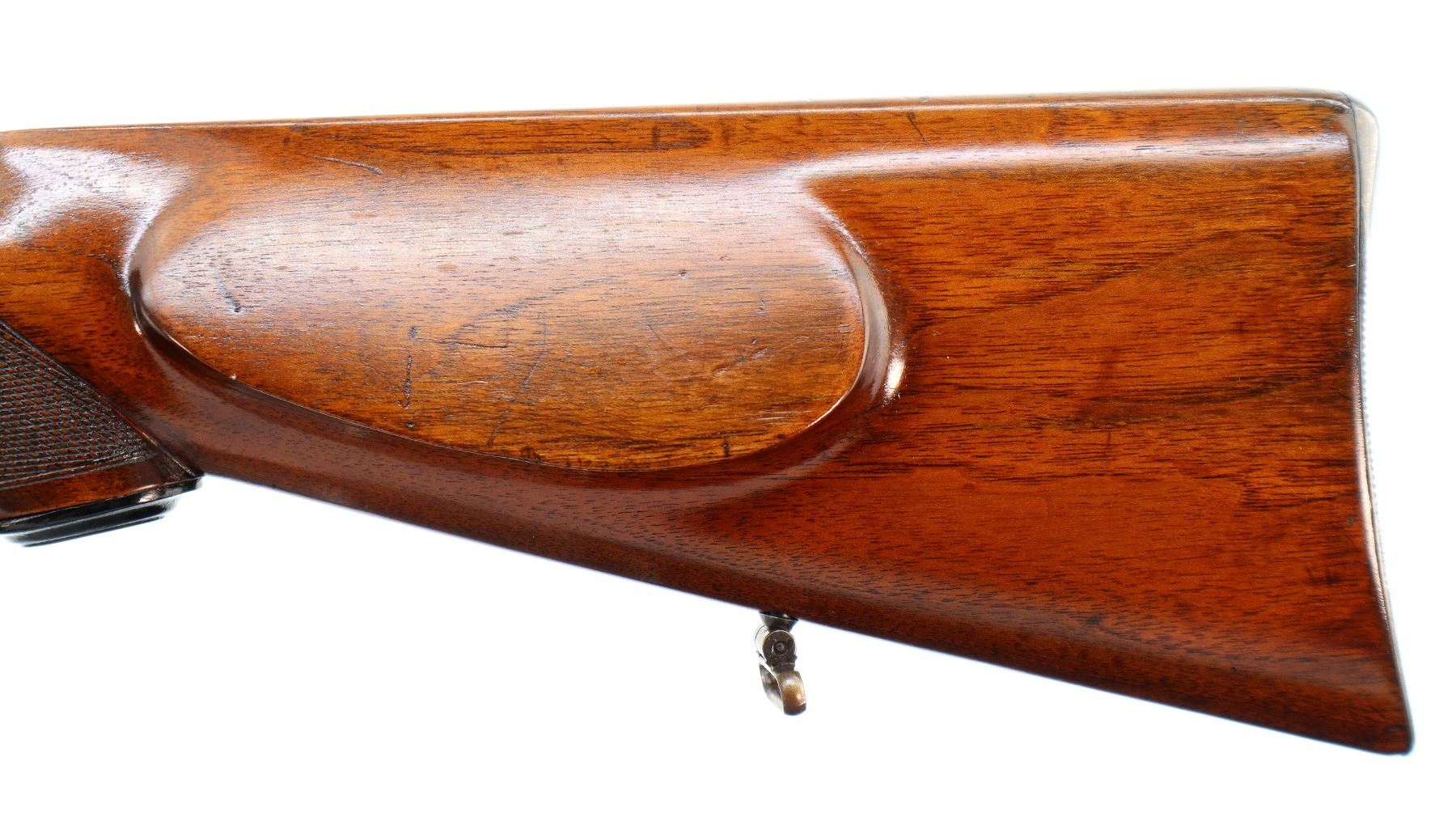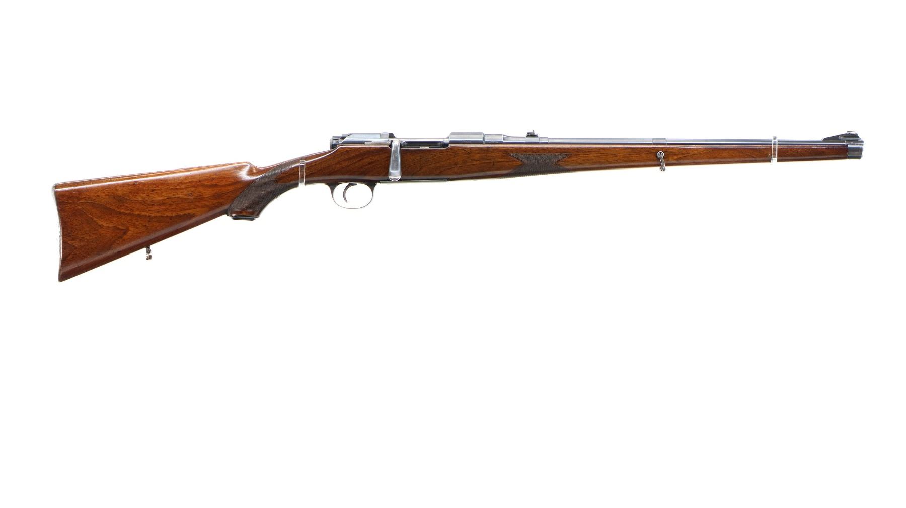 Main Description: Blade front sight with ramp, adjustable u notched rear sight with one fixed and one folding leaf, blued finish, butter knife bolt handle. One piece full length Mannlicher stock, checkered forearm and pistol grip, European cheek rest, grooved steel butt plate with trap, grip cap, sling swivels, steel nose cap.