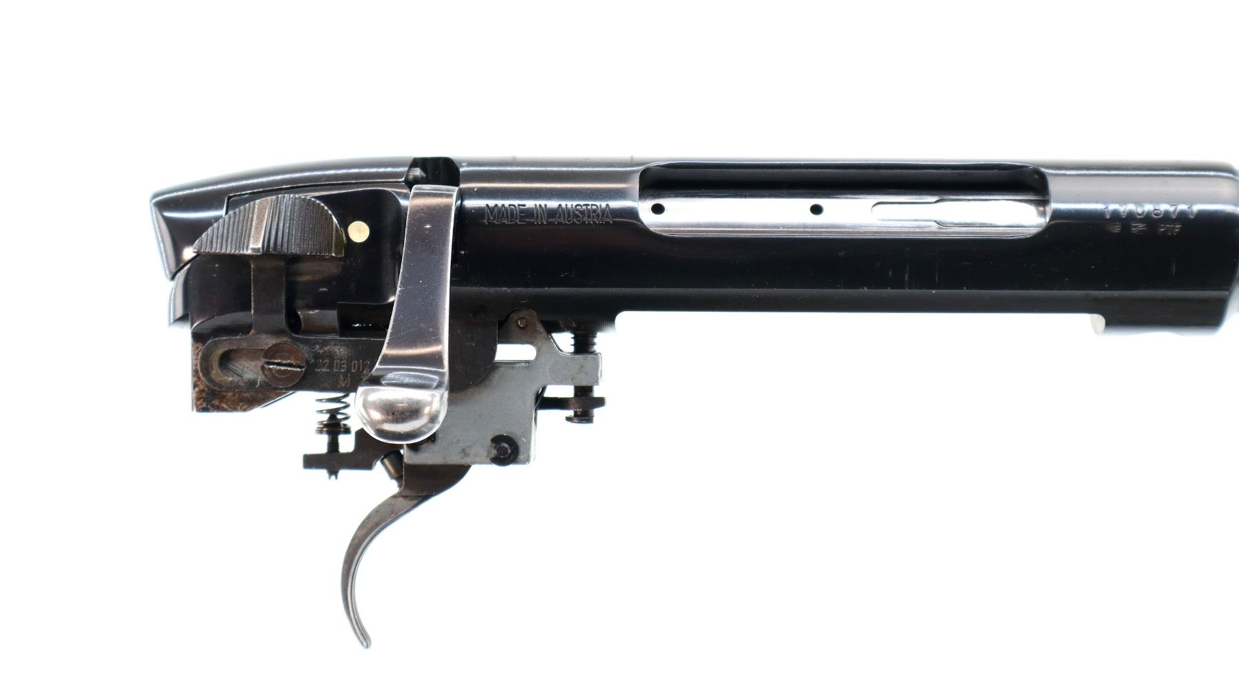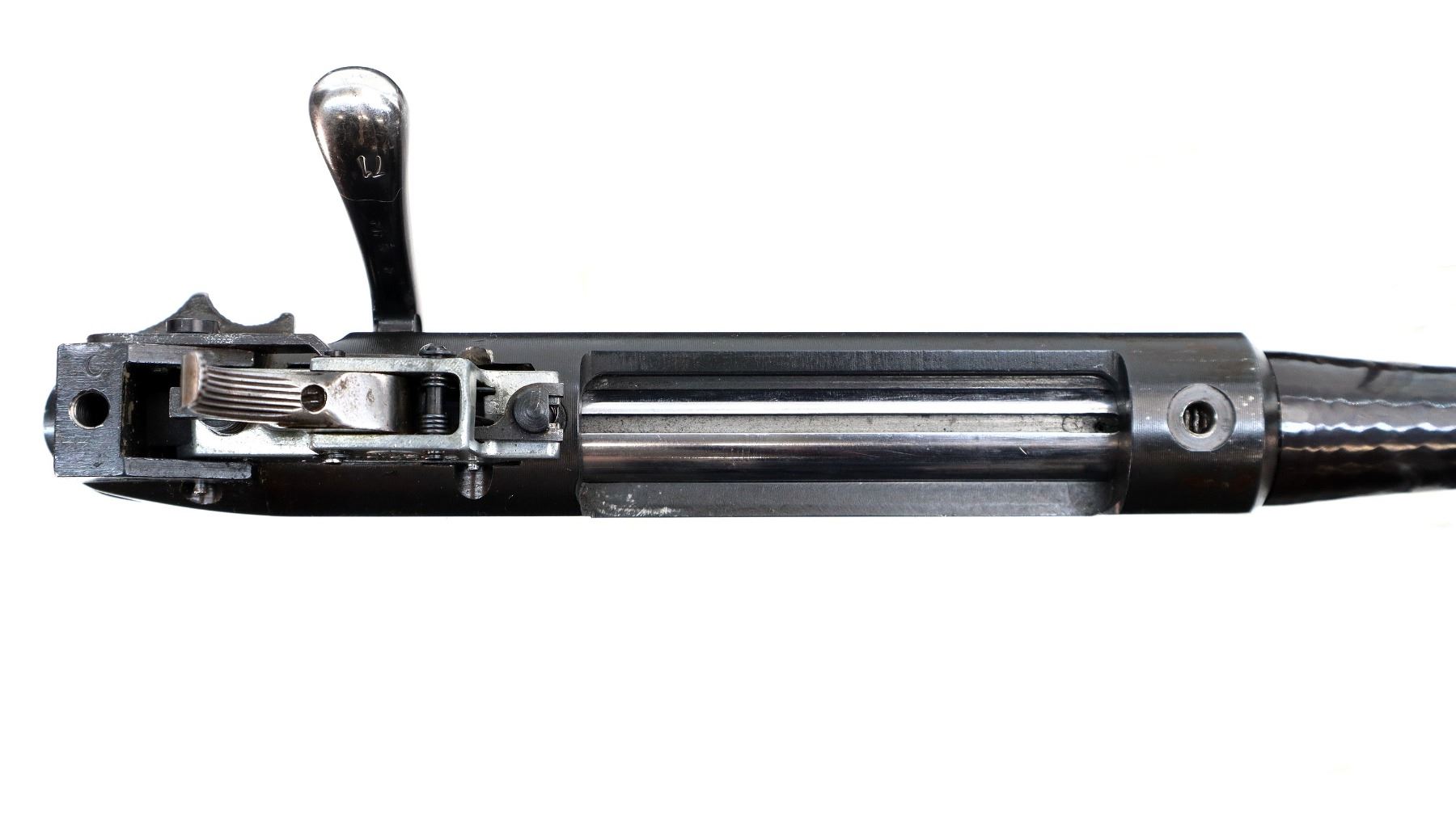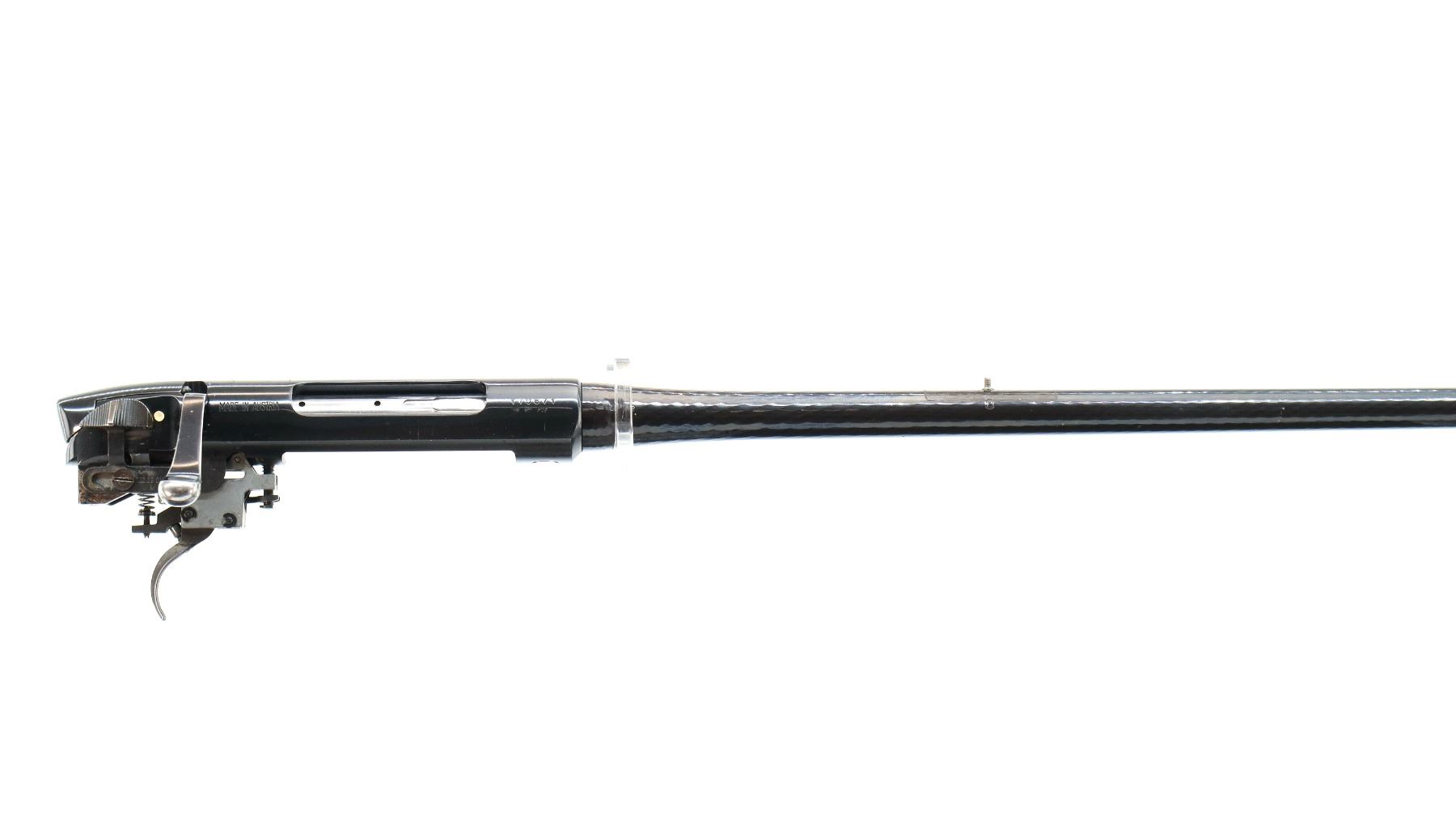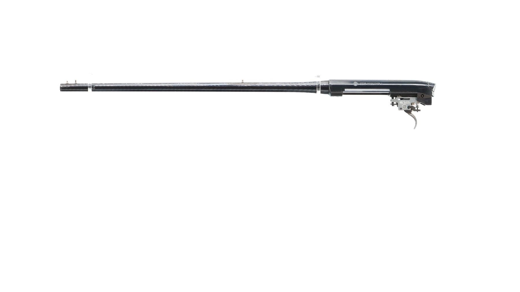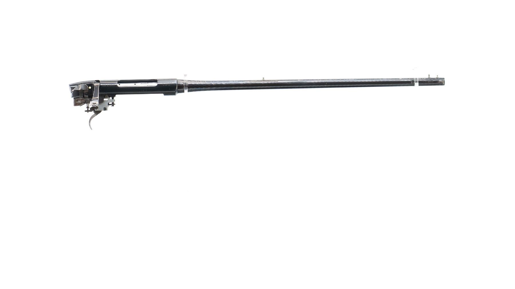 Main Description: Missing front and rear sights, threaded studs present, polished blued finish, hammer forged barrel, receiver drilled and tapped with no plug screws installed, includes bolt and adjustable trigger mech assemblies. Missing all other parts and the stock.