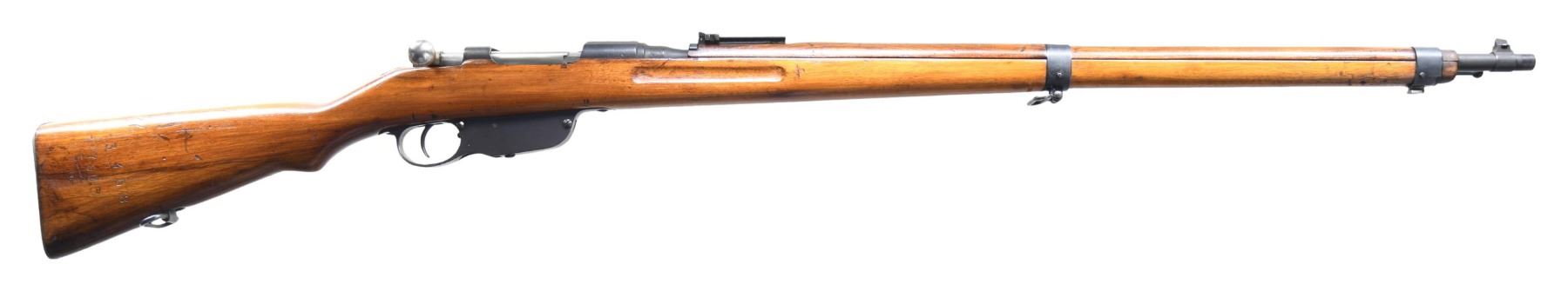 Cal. 8x56R. S# 3458k. Bbl. 31". Blade front sight. Ladder rear sight graduated to 2600m. Matching numbers on receiver, bbl. stock, front band & electro pencil matching bolt. Bulgarian reworked M95 rifle. Bbl. has "S" marking for 8x56 ammo & faint Austrian acceptance that appears to be 1917. Receiver top has "Steyr M 95" marking. Arsenal rework blue finish. Hardwood stock set with bottom mounted sling swivels. CONDITION: stock set has arsenal rework finish with scattered dings, handling marks & scratches. Metal retains 95% arsenal rework blue with some blued over pitting, scattered light oxidation & edge wear. Action functions properly when hand cycled. Good bore with scattered frosting & light pitting but strong rifling. (25-2195/MJC). CURIO. $200-300.