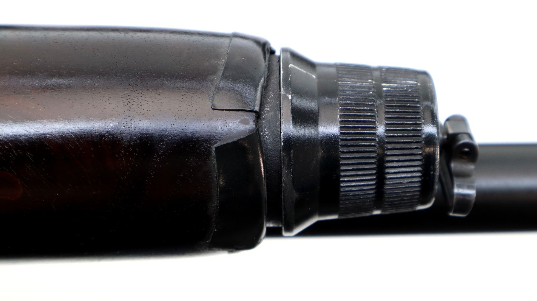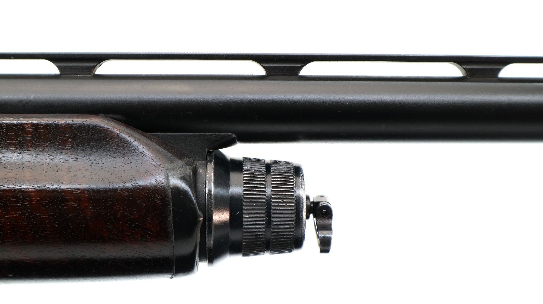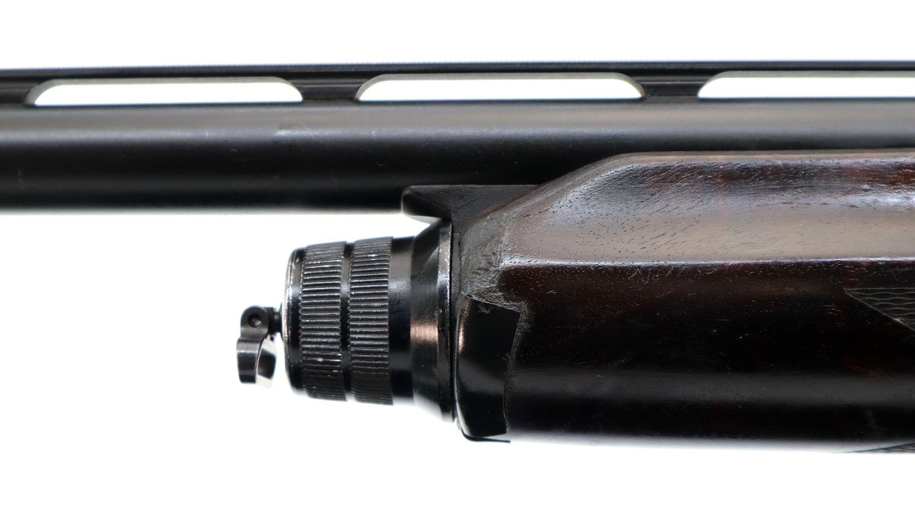 Main Description: White front bead, Parkerized vent rib barrel with two holes at the rear, black alloy receiver, includes bolt and trigger mech assembly. One piece checkered wood forearm, damaged at the front, missing complete butt stock assembly, has a front sling swivel.