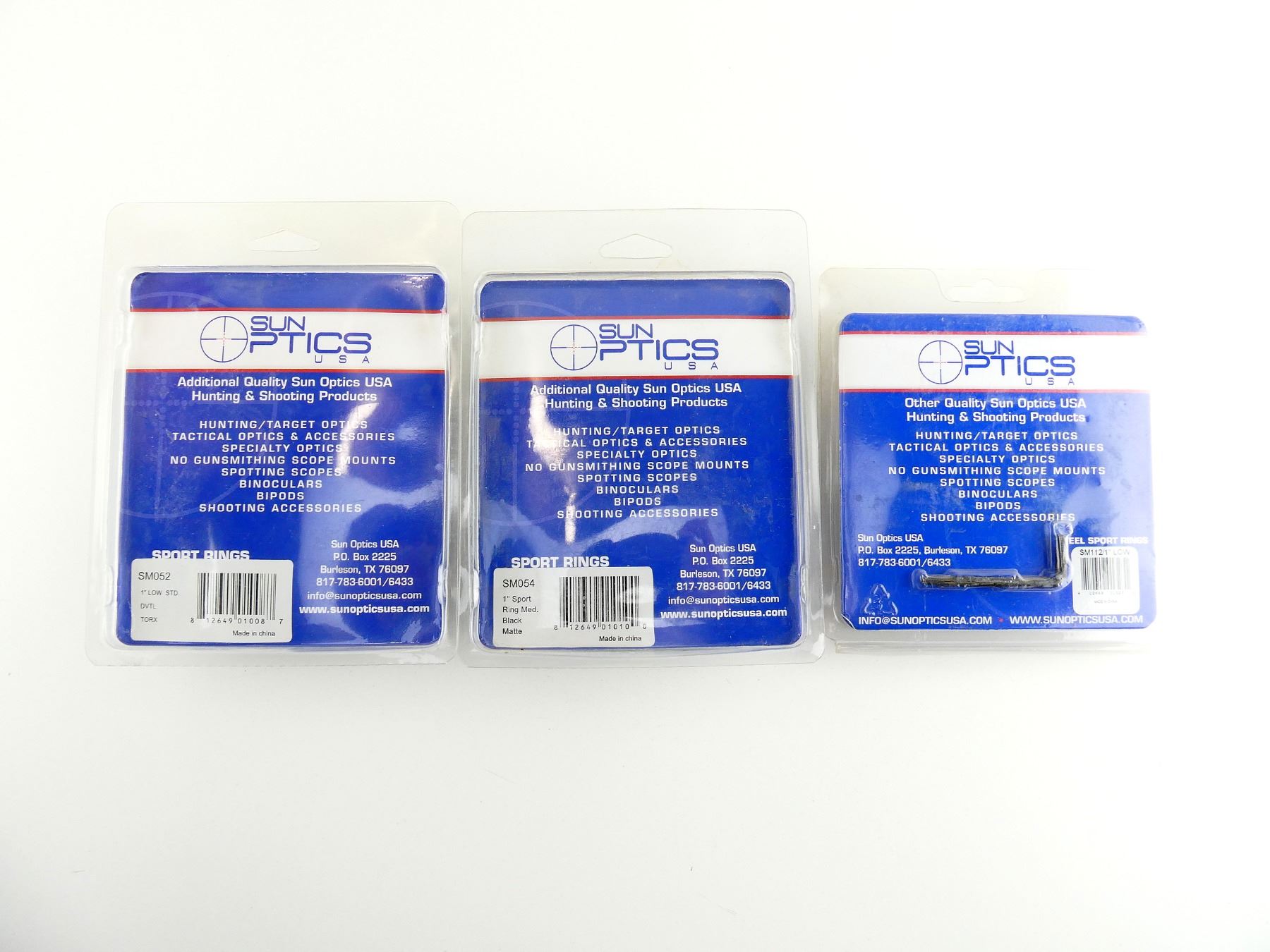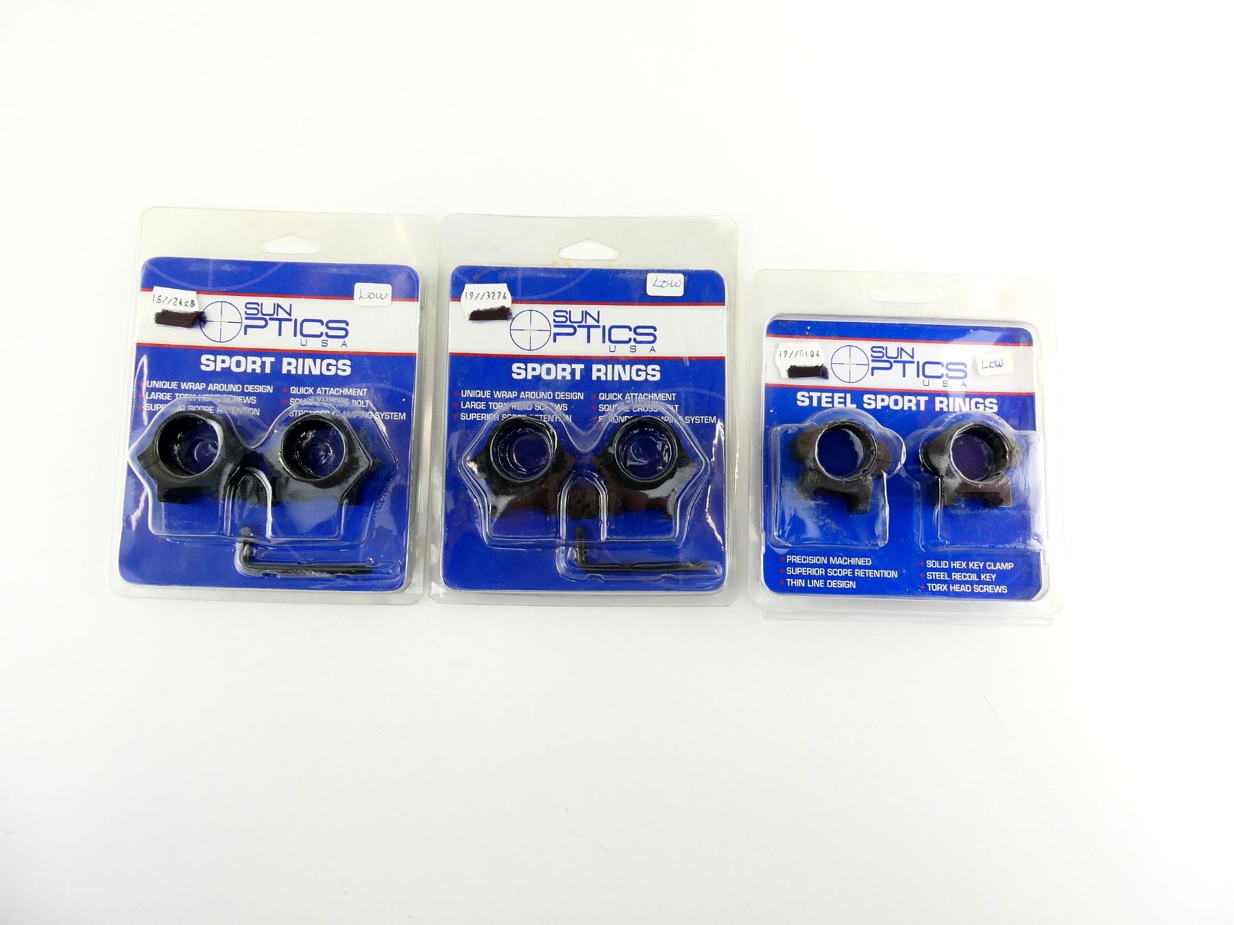 LOT INCLUDES; (1) LOW STEEL SPORTS RINGS, 1" DIAMETER, ITEM #: SM112, APPEAR NEW OLD STOCK, IN ORIGINAL PACKAGING, (1) LOW SPORT RINGS, 1" DIAMETER, ITEM #: SM052, APPEAR NEW OLD STOCK, IN ORIGINAL PACKAGING & (1) MED SPORT RINGS, 1" DIAMETER, ITEM #: SM054, APPEAR NEW OLD STOCK, IN ORIGINAL PACKAGING. MAY REQUIRE FITTING. SEE PHOTOS.