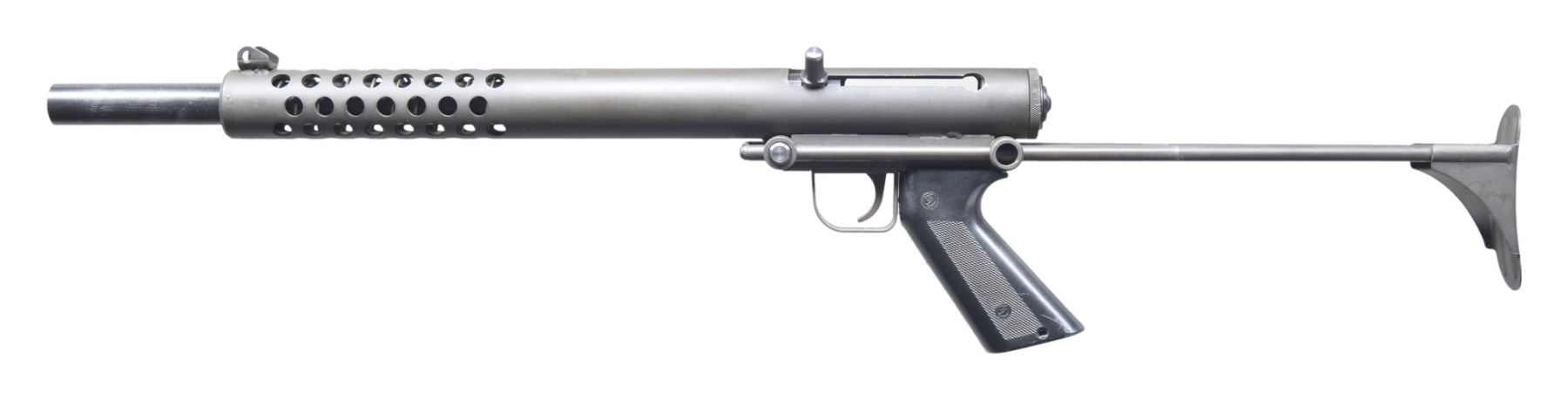 Cal. 12 Ga. S# AF10507. Bbl. 18". Mfg. 1987-1990. An extremely interesting single shot shotgun that is quite unique in its method of operation. It is a single shot, open bolt shotgun with a fixed firing pin. Upon depressing the trigger, the barrel slams to the rear where the chamber meets the fixed firing pin, causing it to fire. While the recoil is a bit stout, and it is slow to operate, they have become collectors items due to the unique design, combined w/ the fact that less than 1500 were ever manufactured, 35 years ago. Typical Cobray / SWD dark gray parkerized finish. Dual rod collapsible shoulder stock. Ventilated barrel shroud. Black plastic pistol grip. w/ Cobray logo on both sides. CONDITION: Finish remains complete & consistent w/ very little sign of prior use. Finish thinning on barrel in areas of mechanical intervention. End cap / firing pin & area around chamber illustrates some light patina. Fire control mechanism appears to function correctly when cycled by hand. (25-2228/JZ). MODERN. $300-500.