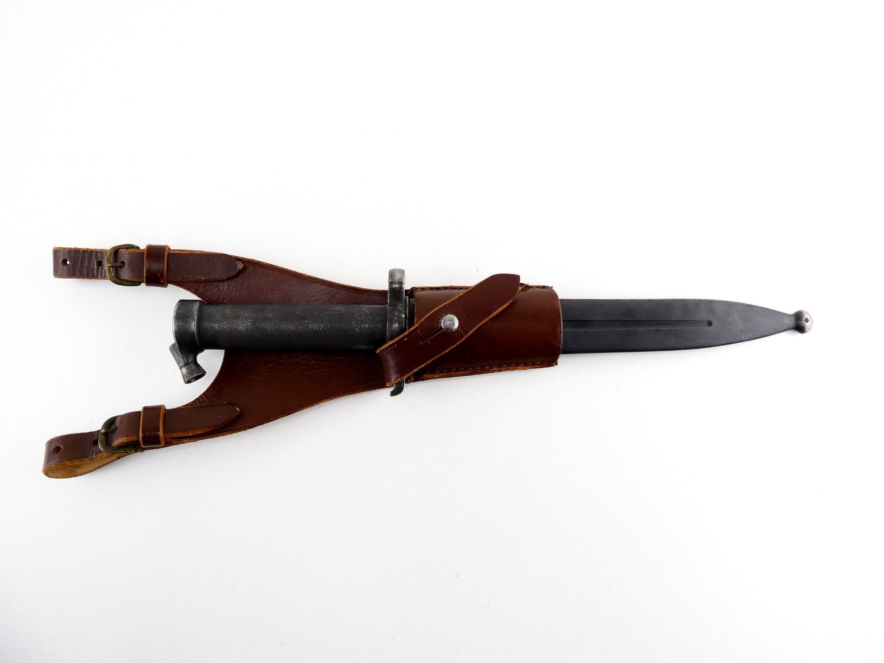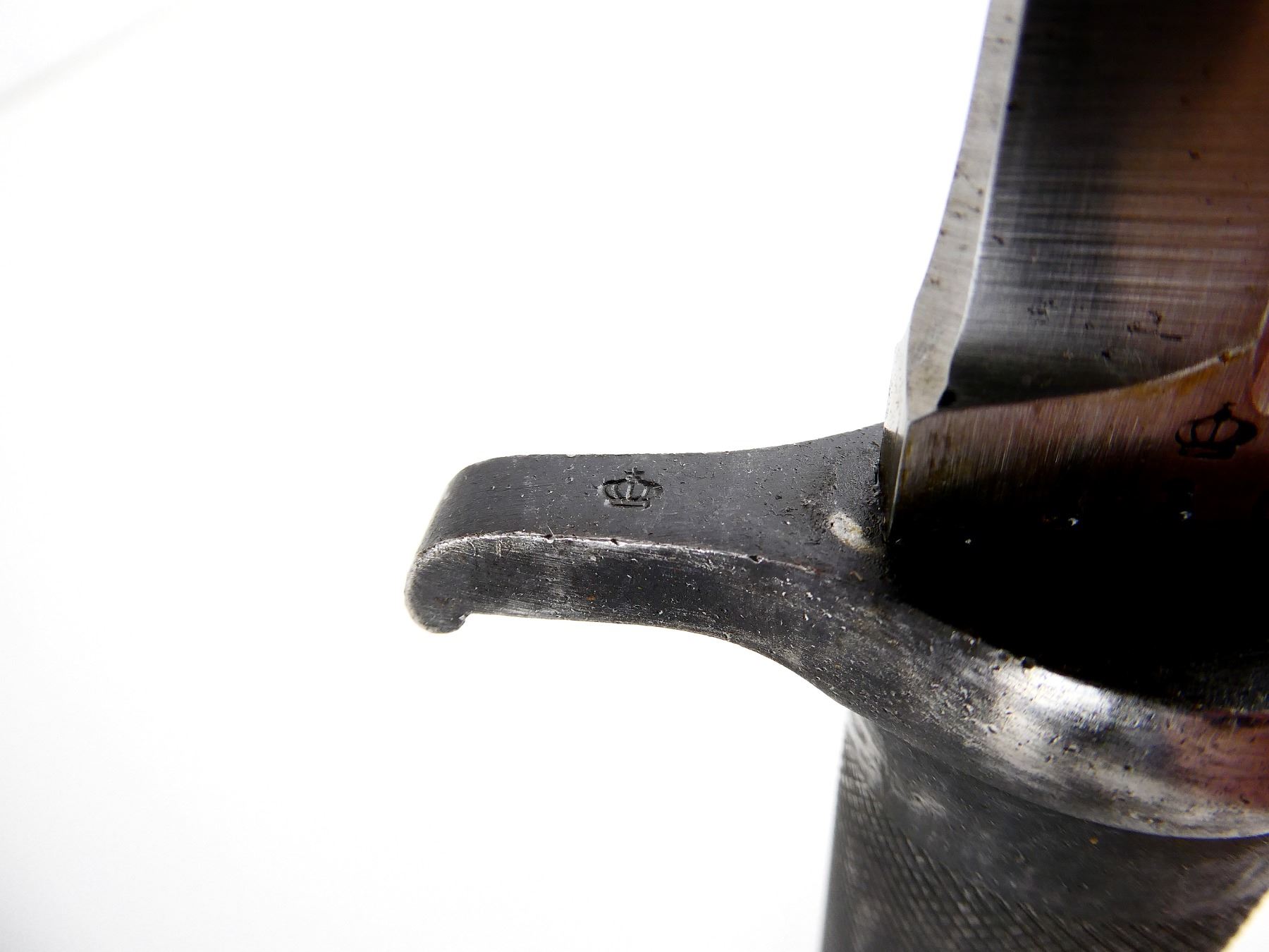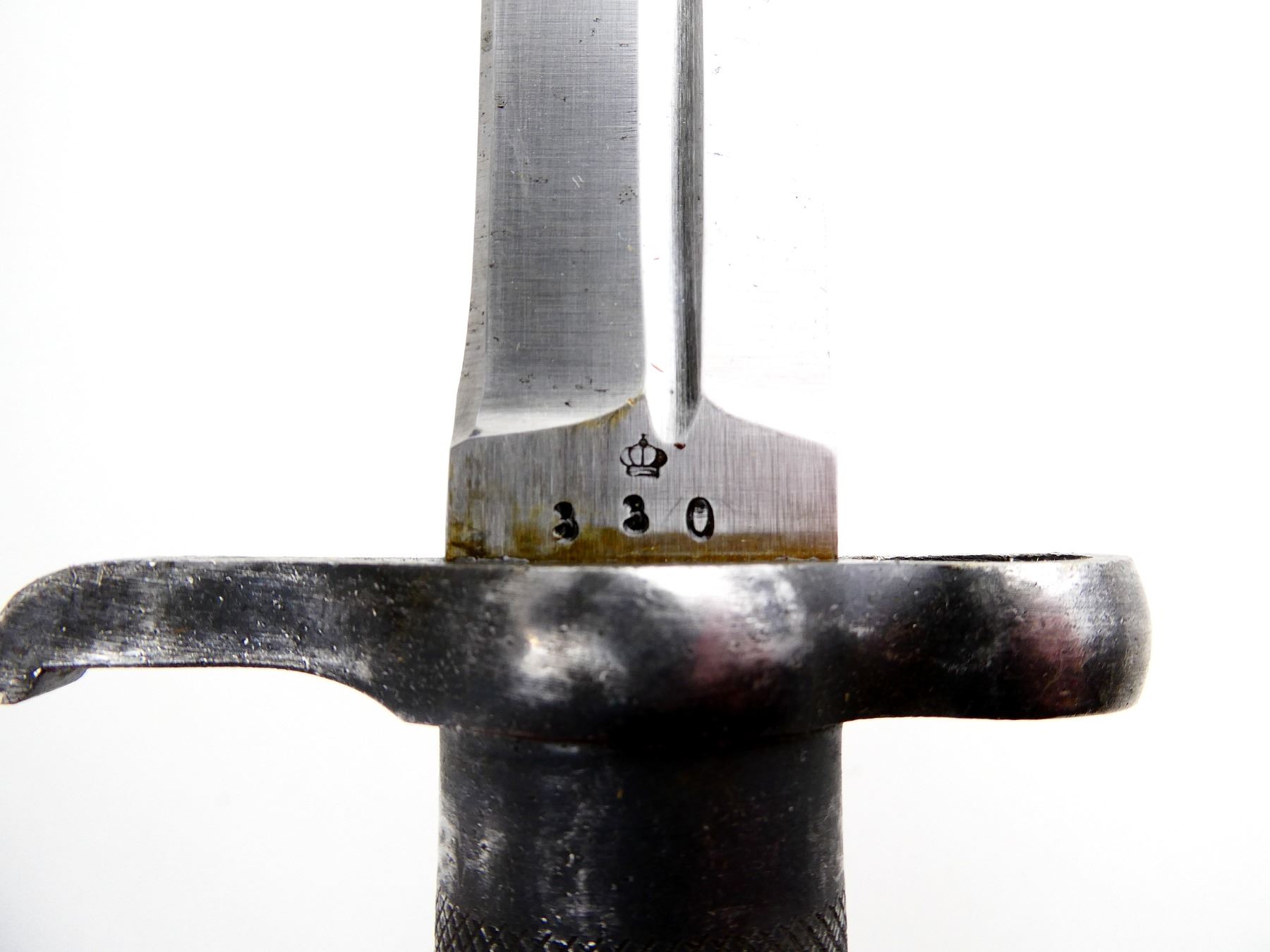 (1) FITS 6.5MM M1896, M1938 SHORT & AG42B LJUNGMAN SELF-LOADING RIFLES, RICASSO MARKED: "EJ" CROWN OVER ANCHOR "AB", OTHER SIDE MARKED: CROWN OVER "330", CROSS-PIECE MARKED: "EJ" CROWN OVER ANCHOR "AB" WITH CROWN PROOF MARK, METAL GRIP/POMMEL, NO VISIBLE MARKINGS, STEEL SCABBARD, THROAT MARKED: CROWN OVER "C", "968", BALL TIP MARKED: CROWN PROOF MARK, "184", BROWN LEATHER FROG MARKED WITH THREE CROWNS, BLADE APPROX. 8 3/8" & OVERALL LENGTH APPROX. 13.25". SEE PHOTOS.