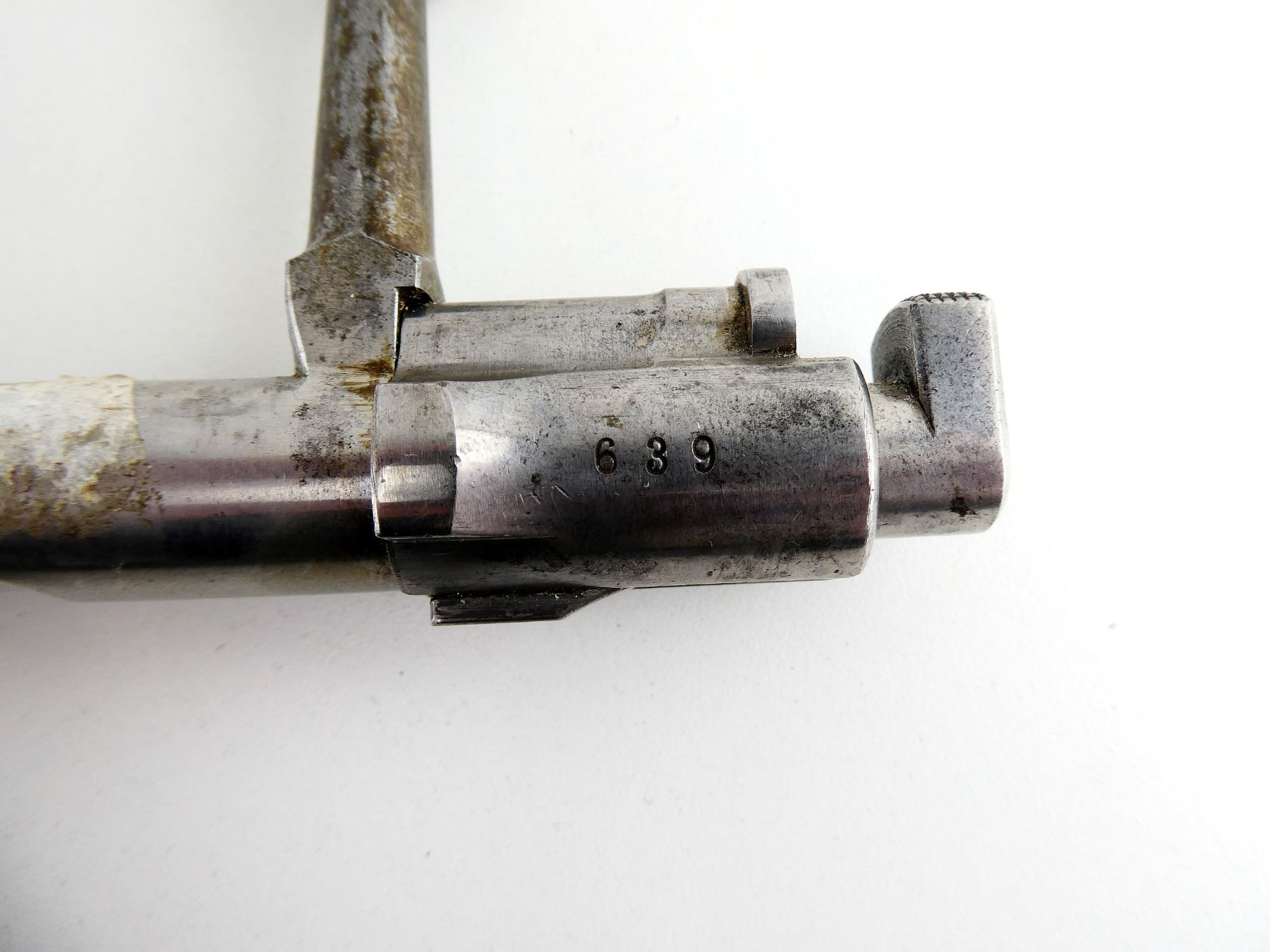(1) BOLT, IN THE WHITE STEEL CONSTRUCTION, INCOMPLETE, STRAIGHT HANDLE, MISSING SAFETY, MARKED: "386", "639", ETC., OVERALL LENGTH APPROX. 7.5". MAY REQUIRE FITTING. SEE PHOTOS.