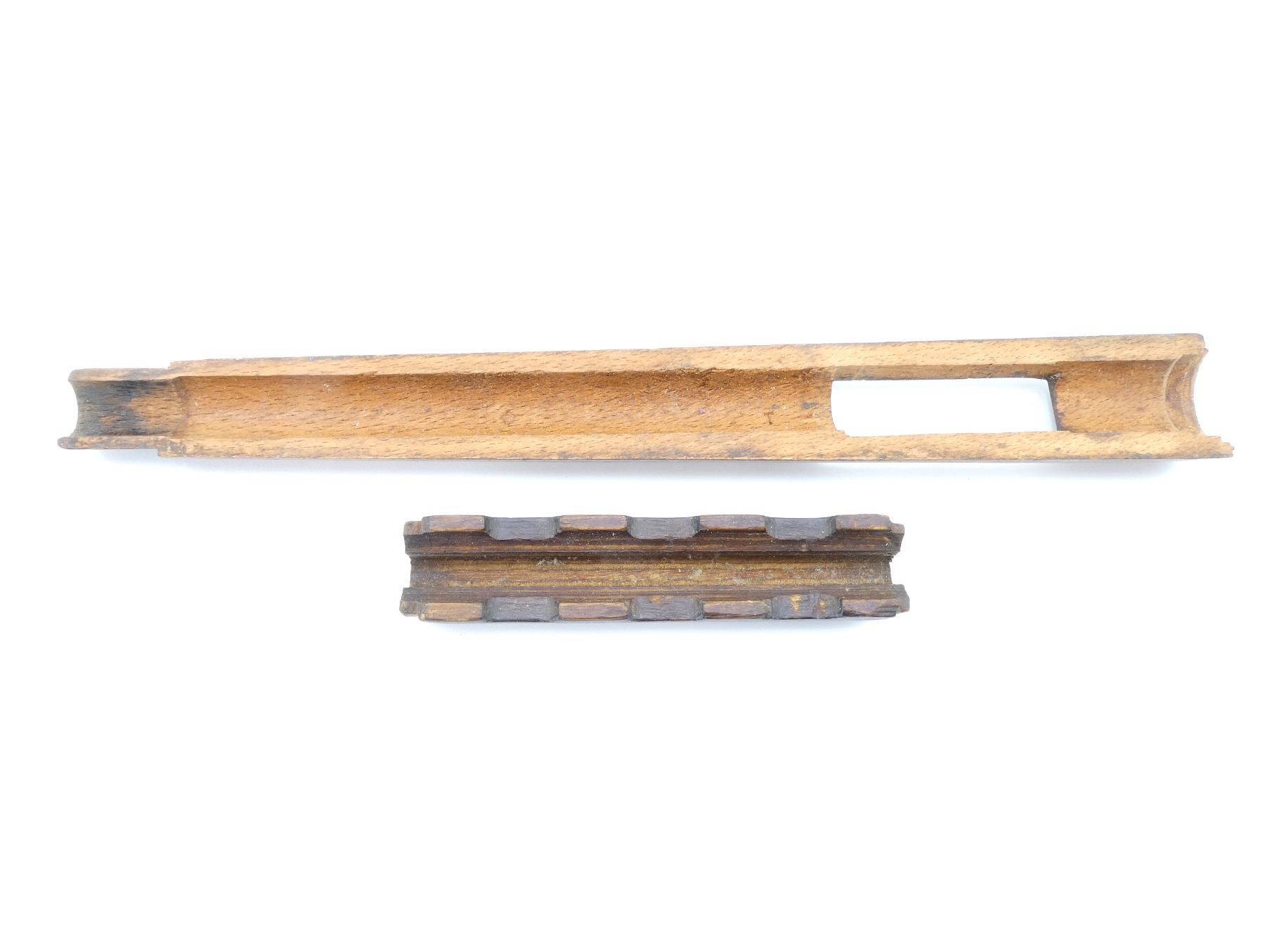 LOT INCLUDES; (1) WOODEN FOREND, SMOOTH, UNMARKED, MAY HAVE SMALL CRACKS & CHIPS, OVERALL LENGTH APPROX. 14.25" & (1) WOODEN HANDGUARD, LAMINATED, UNMARKED, MAY HAVE SMALL CRACKS & CHIPS, OVERALL LENGTH APPROX. 5.75". MAY REQUIRE FITTING. SEE PHOTOS.