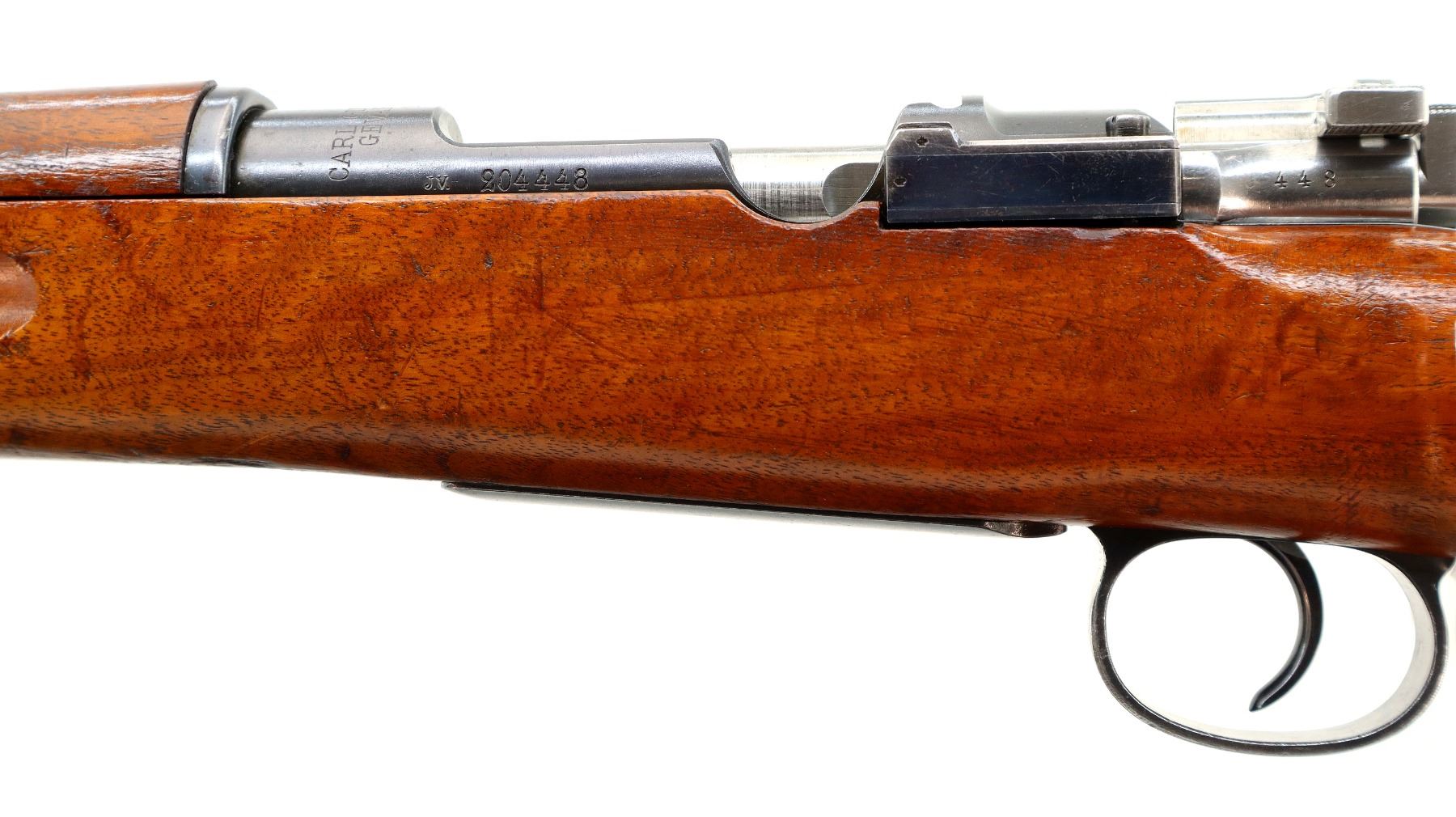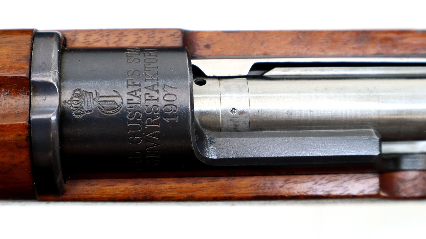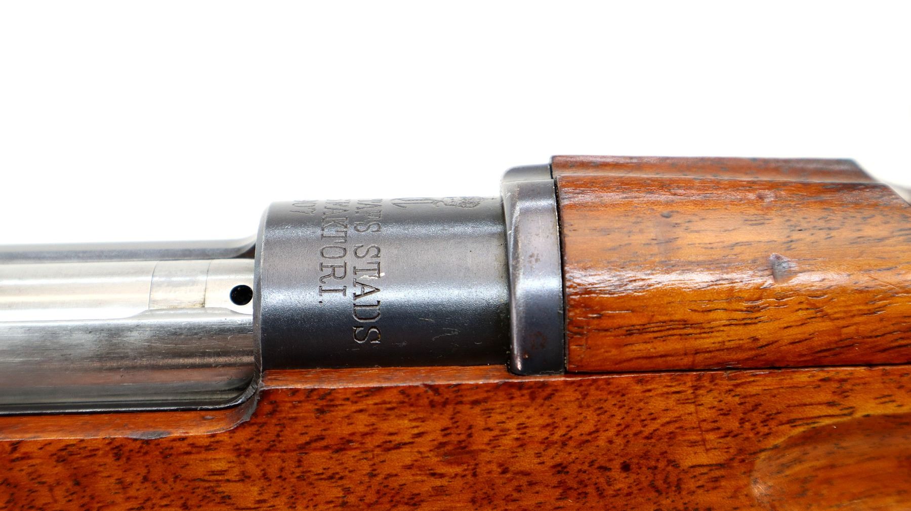 Main Description: Manufactured by Carl Gustafs 1907, visible numbers match. Blade front sight with ramp, adjustable u notched rear sight, blued finish, silver bolt with straight handle. Two piece full military wood stocks, finger grooved forearm, straight grip, smooth steel butt plate, brass stock disk, sling swivels, cleaning rod, bayonet lug.
