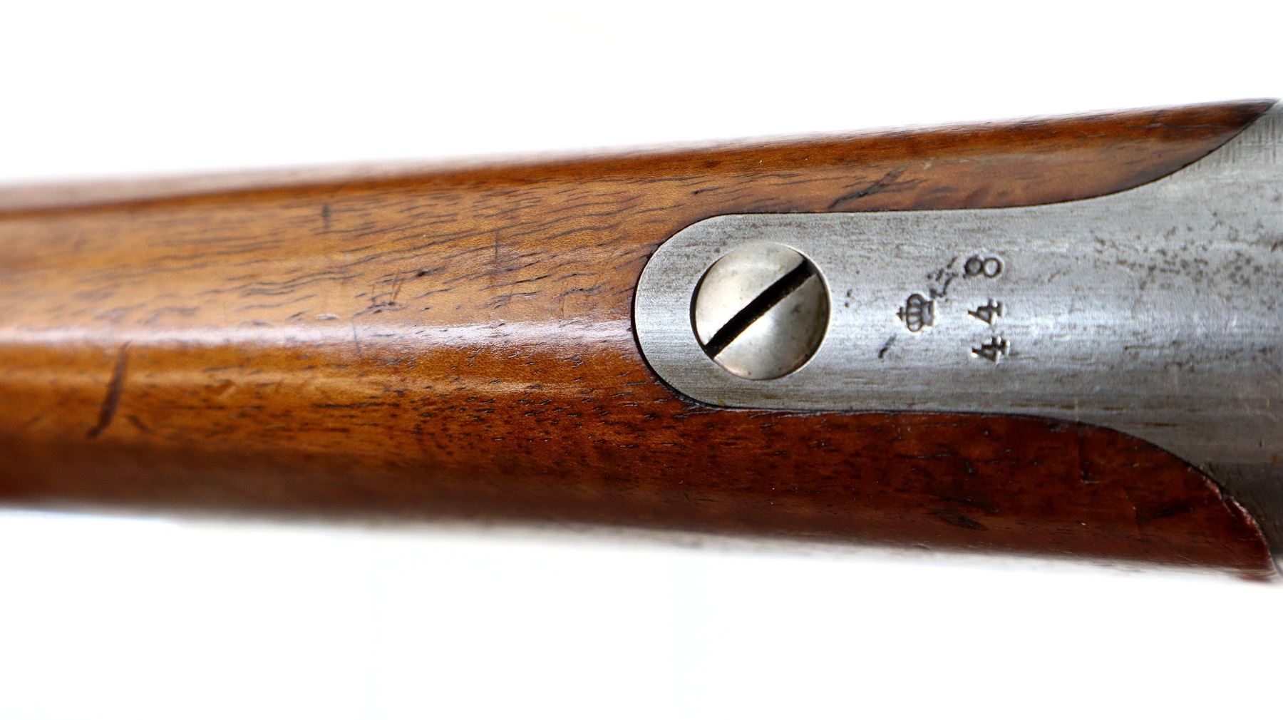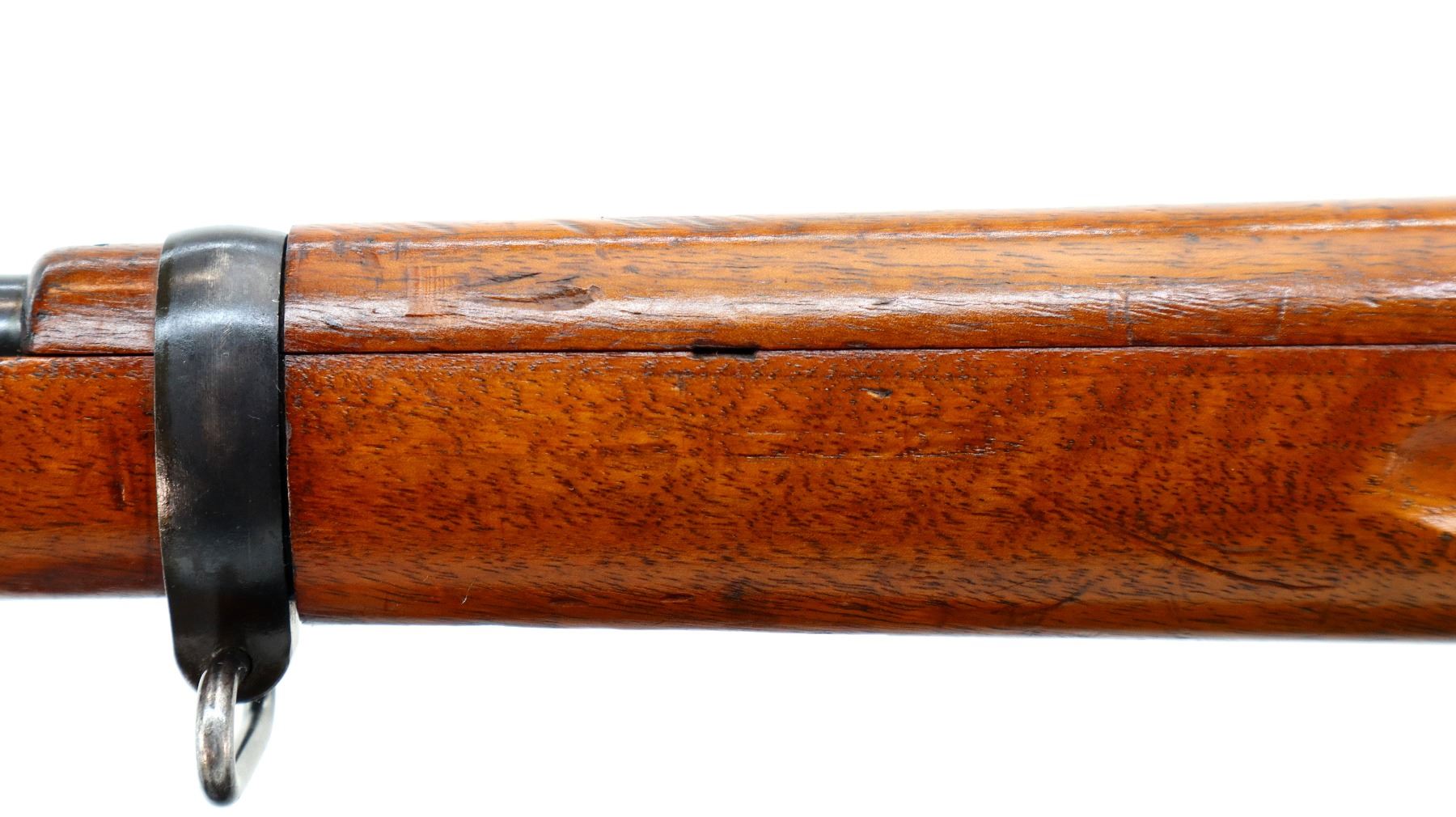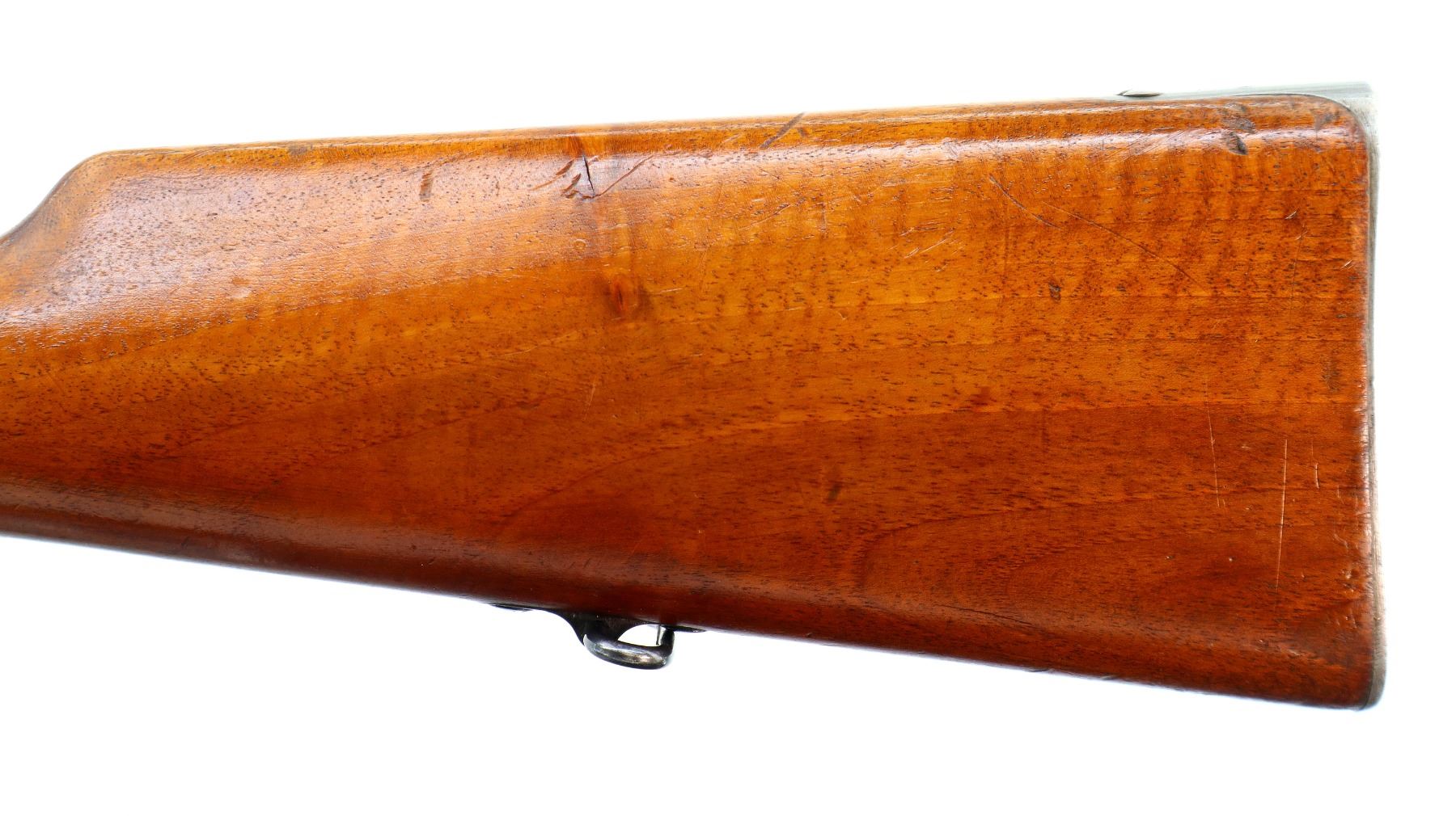 Main Description: Manufactured by Carl Gustafs 1907, visible numbers match. Blade front sight with ramp, adjustable u notched rear sight, blued finish, silver bolt with straight handle. Two piece full military wood stocks, finger grooved forearm, straight grip, smooth steel butt plate, brass stock disk, sling swivels, cleaning rod, bayonet lug.
