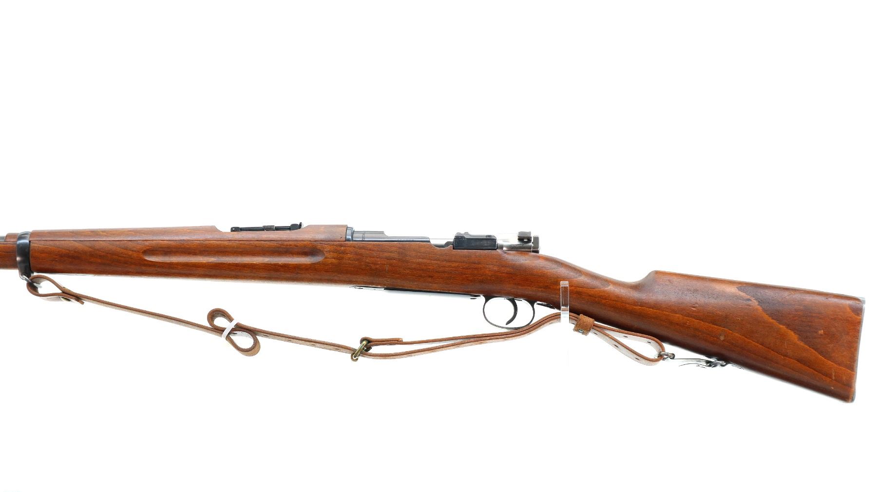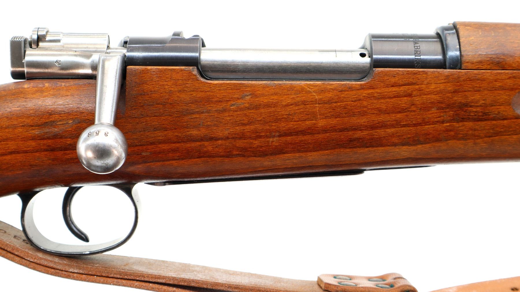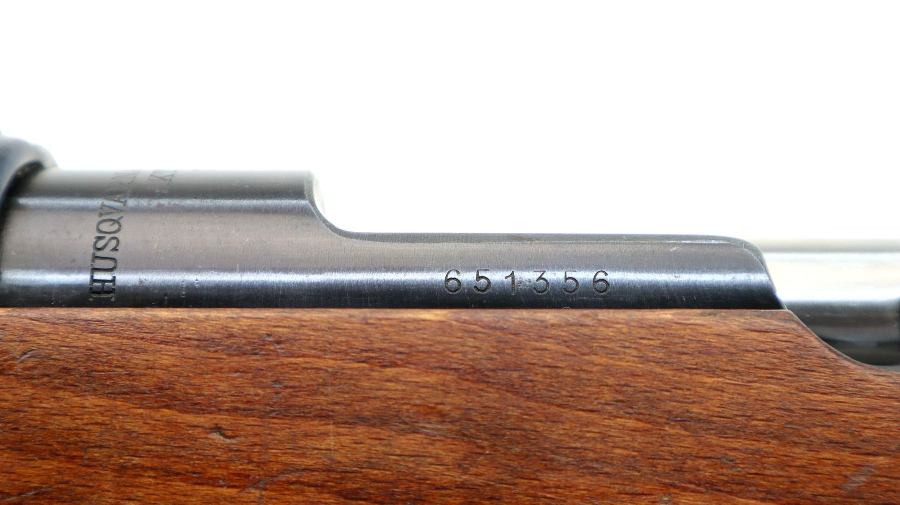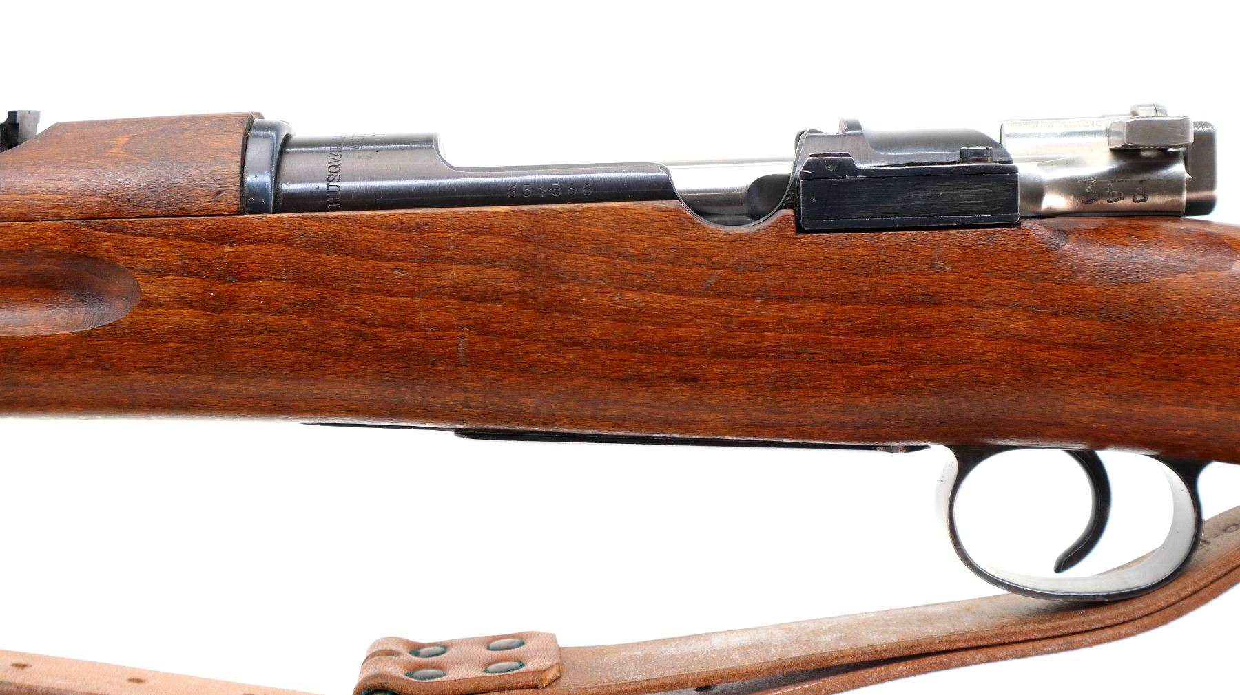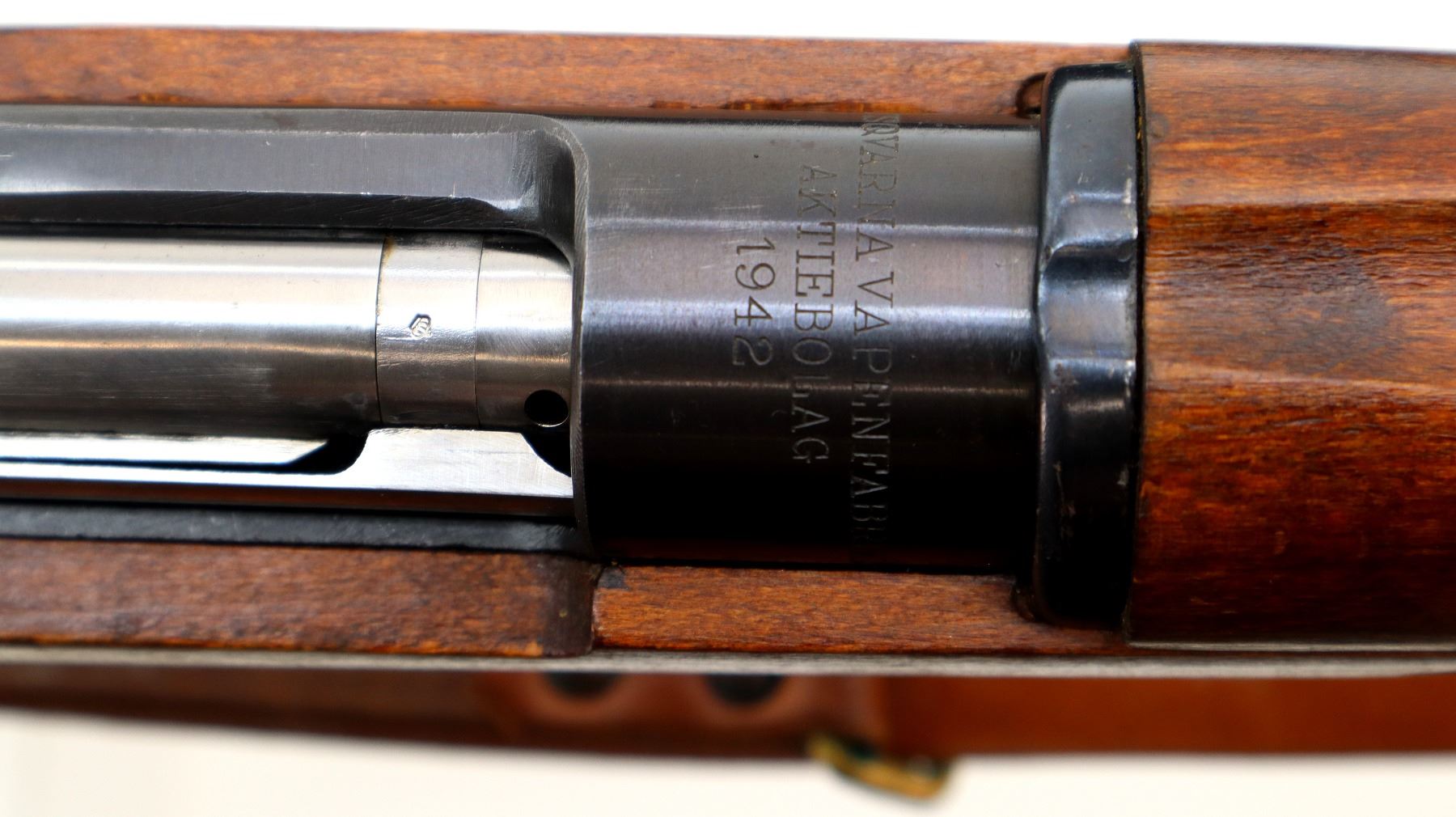 Main Description: Manufactured by Husqvarna 1942, arsenal rebuilt numbered to match. Blade front sight with ramp, adjustable u notched rear sight, blued finish, silver bolt with turned down handle. Two piece full military wood stocks, finger grooved forearm, straight grip, smooth steel butt plate, brass stock disk, four small holes in right side of stock, sling swivels with brown leather military sling, cleaning rod, bayonet lug.
