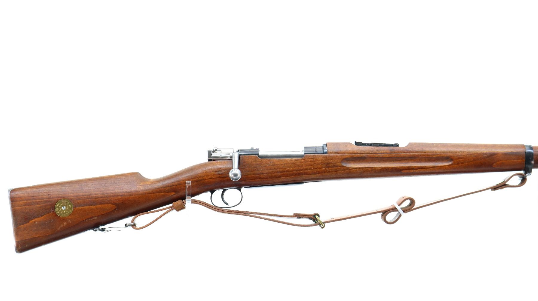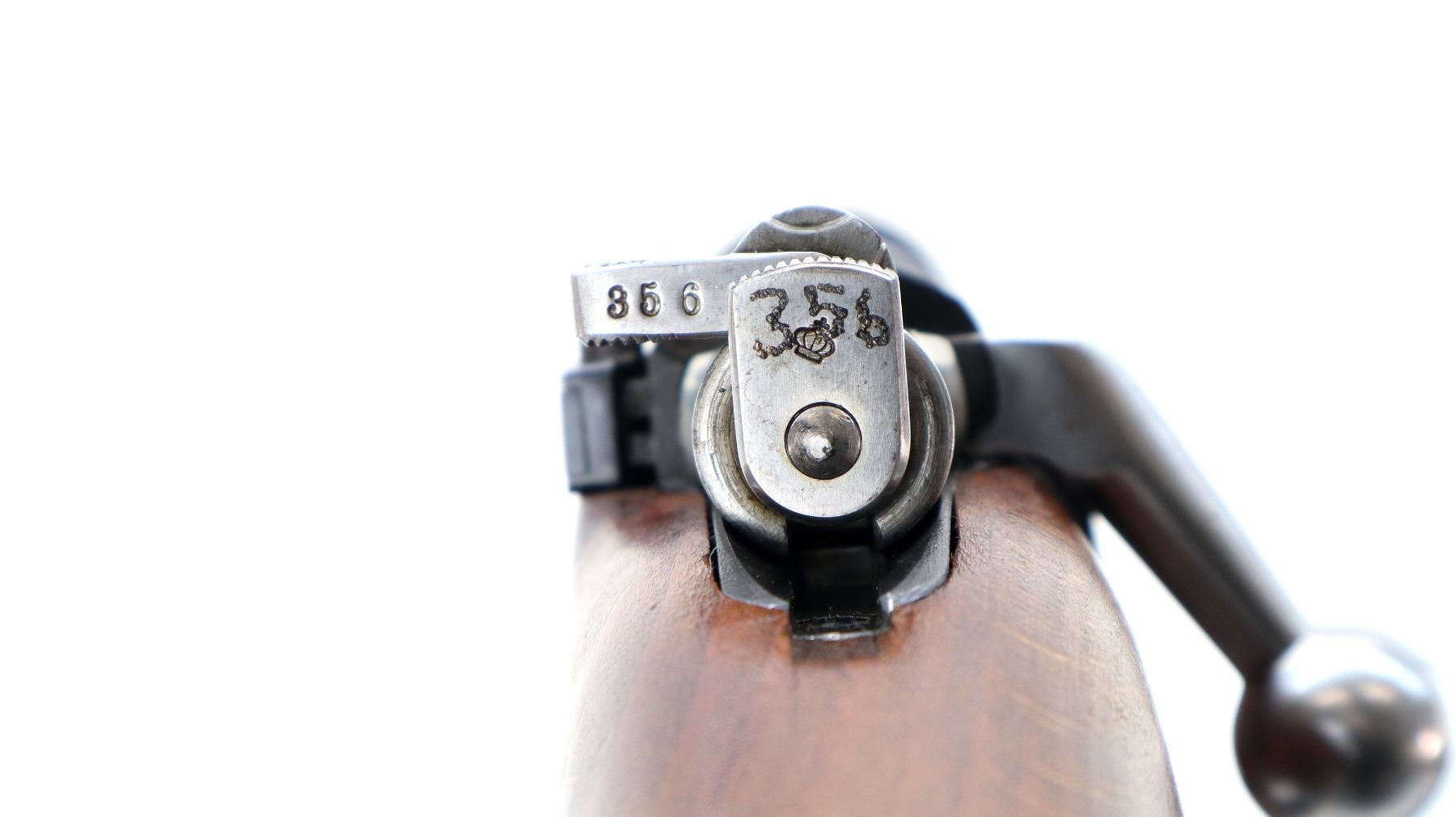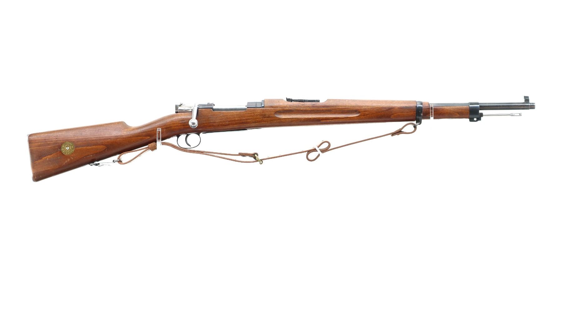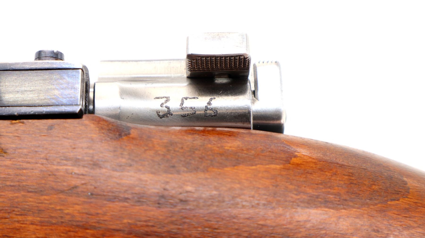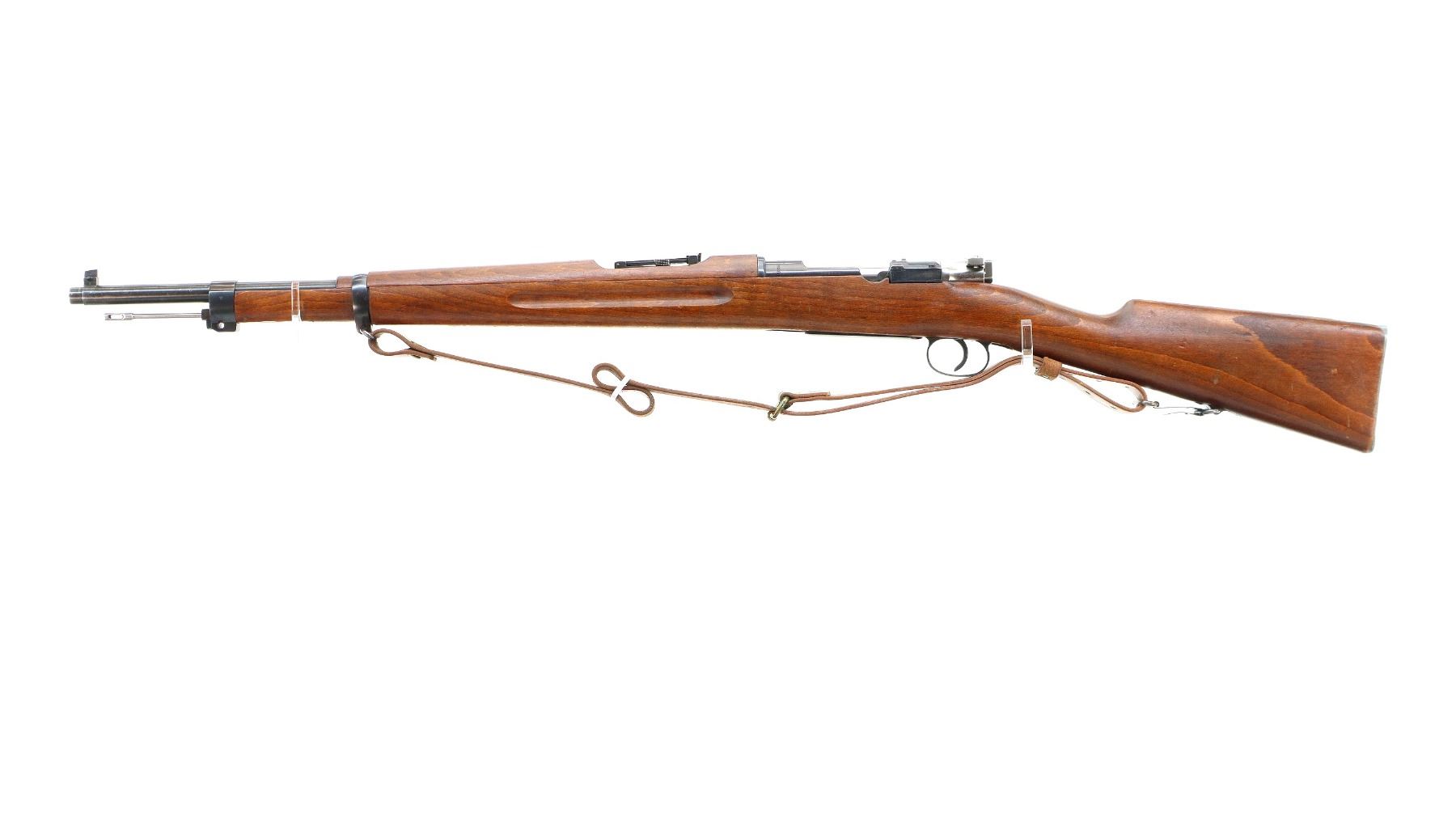 Main Description: Manufactured by Husqvarna 1942, arsenal rebuilt numbered to match. Blade front sight with ramp, adjustable u notched rear sight, blued finish, silver bolt with turned down handle. Two piece full military wood stocks, finger grooved forearm, straight grip, smooth steel butt plate, brass stock disk, four small holes in right side of stock, sling swivels with brown leather military sling, cleaning rod, bayonet lug.