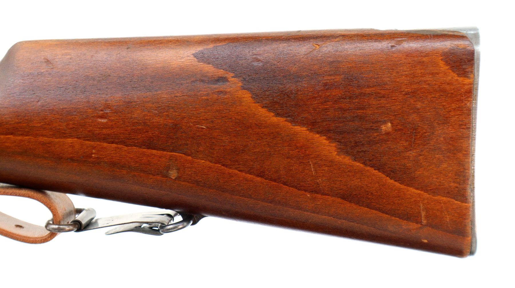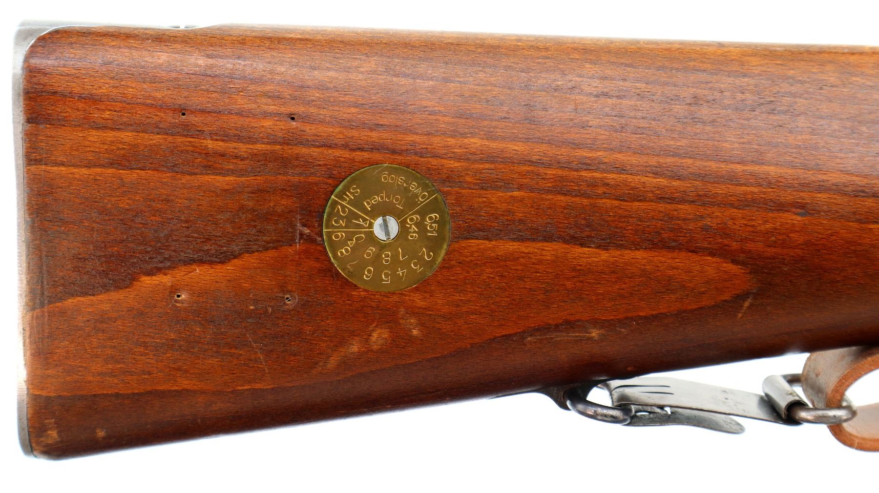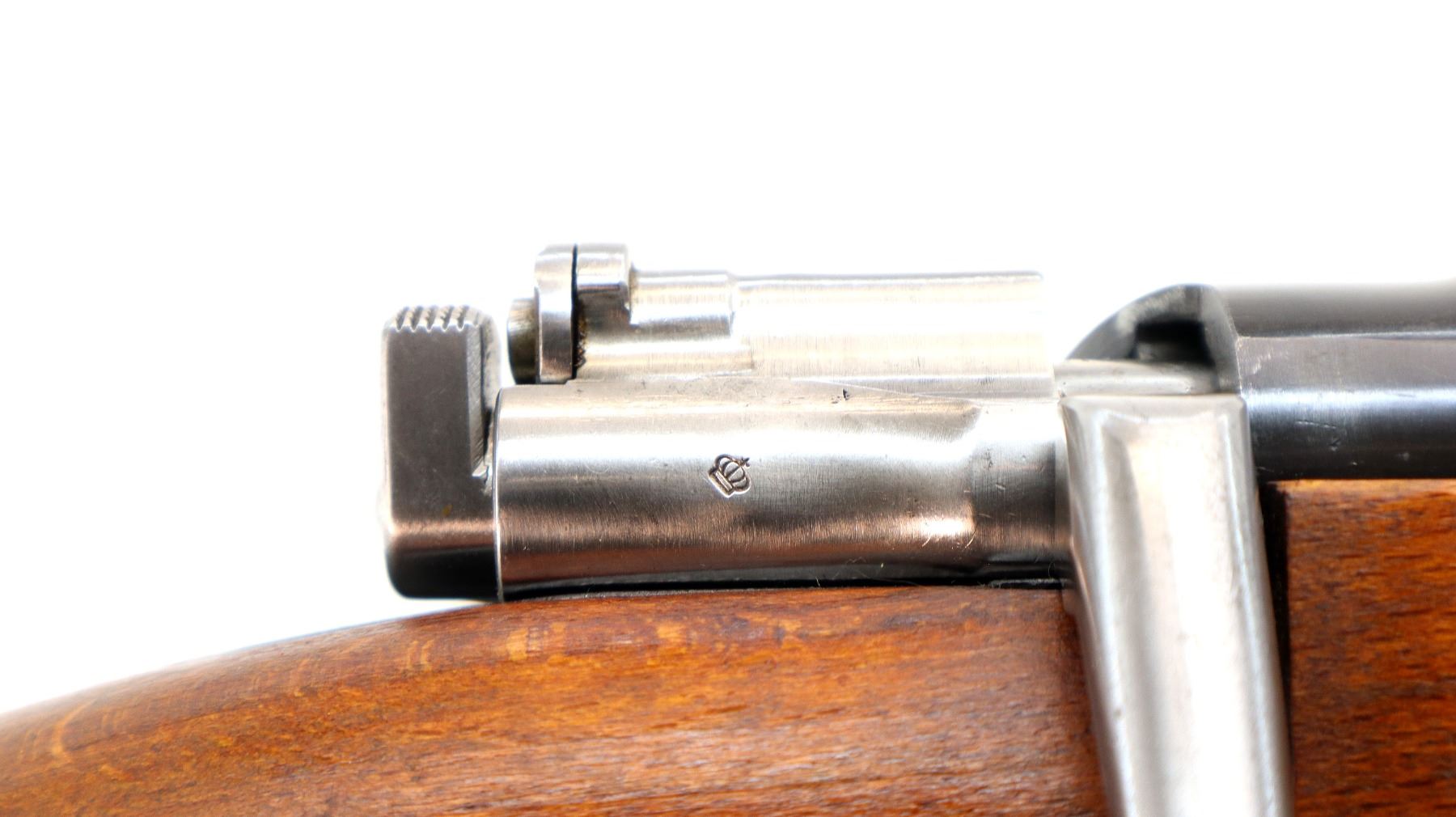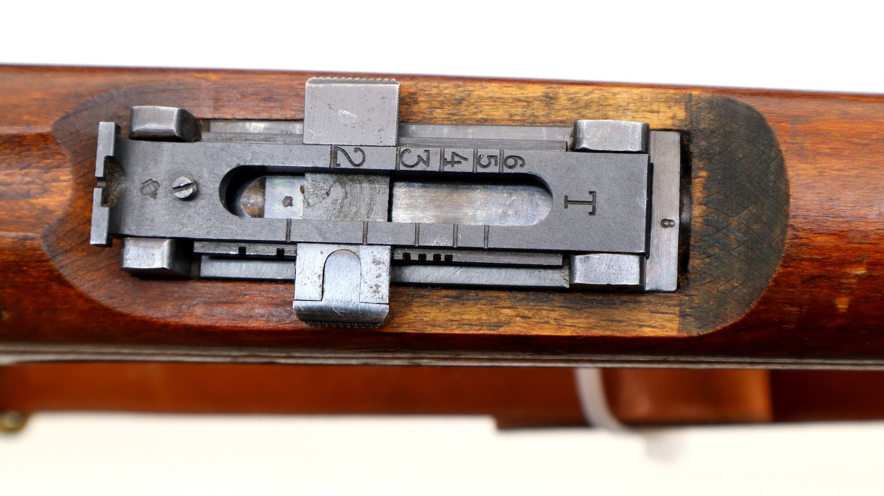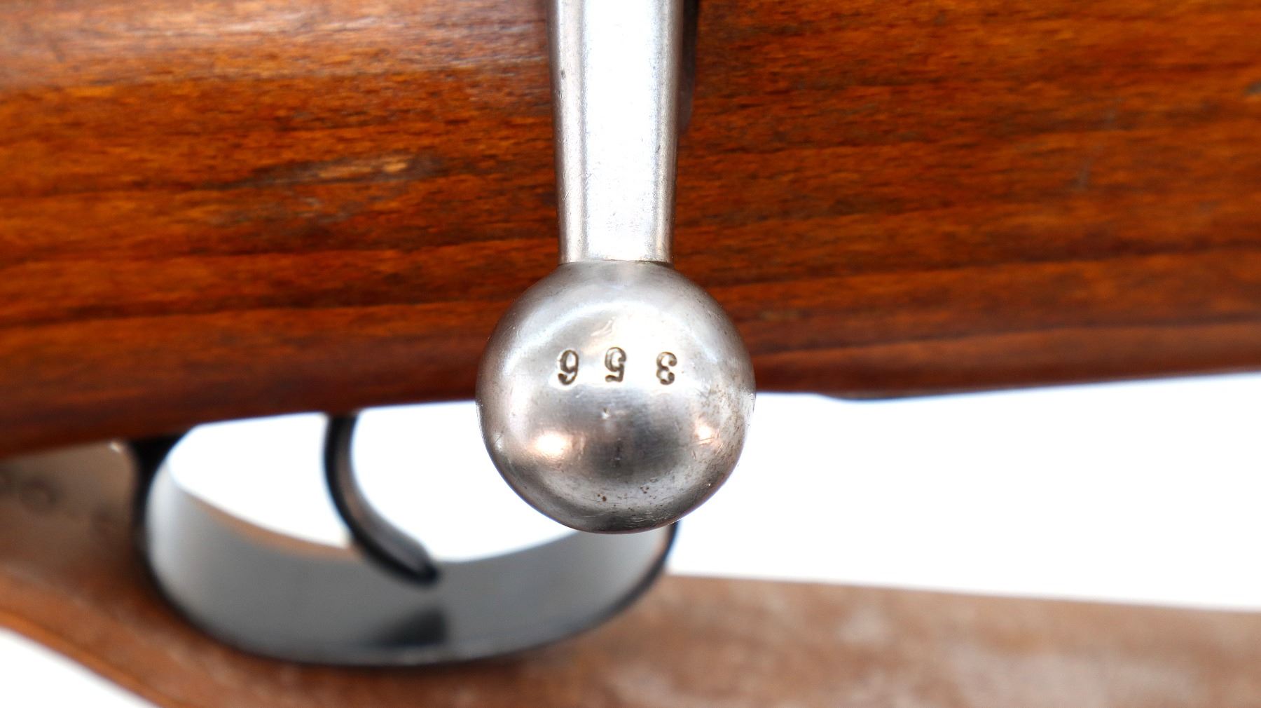Main Description: Manufactured by Husqvarna 1942, arsenal rebuilt numbered to match. Blade front sight with ramp, adjustable u notched rear sight, blued finish, silver bolt with turned down handle. Two piece full military wood stocks, finger grooved forearm, straight grip, smooth steel butt plate, brass stock disk, four small holes in right side of stock, sling swivels with brown leather military sling, cleaning rod, bayonet lug.