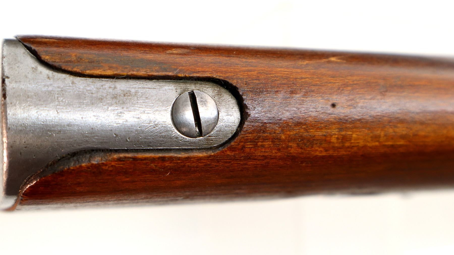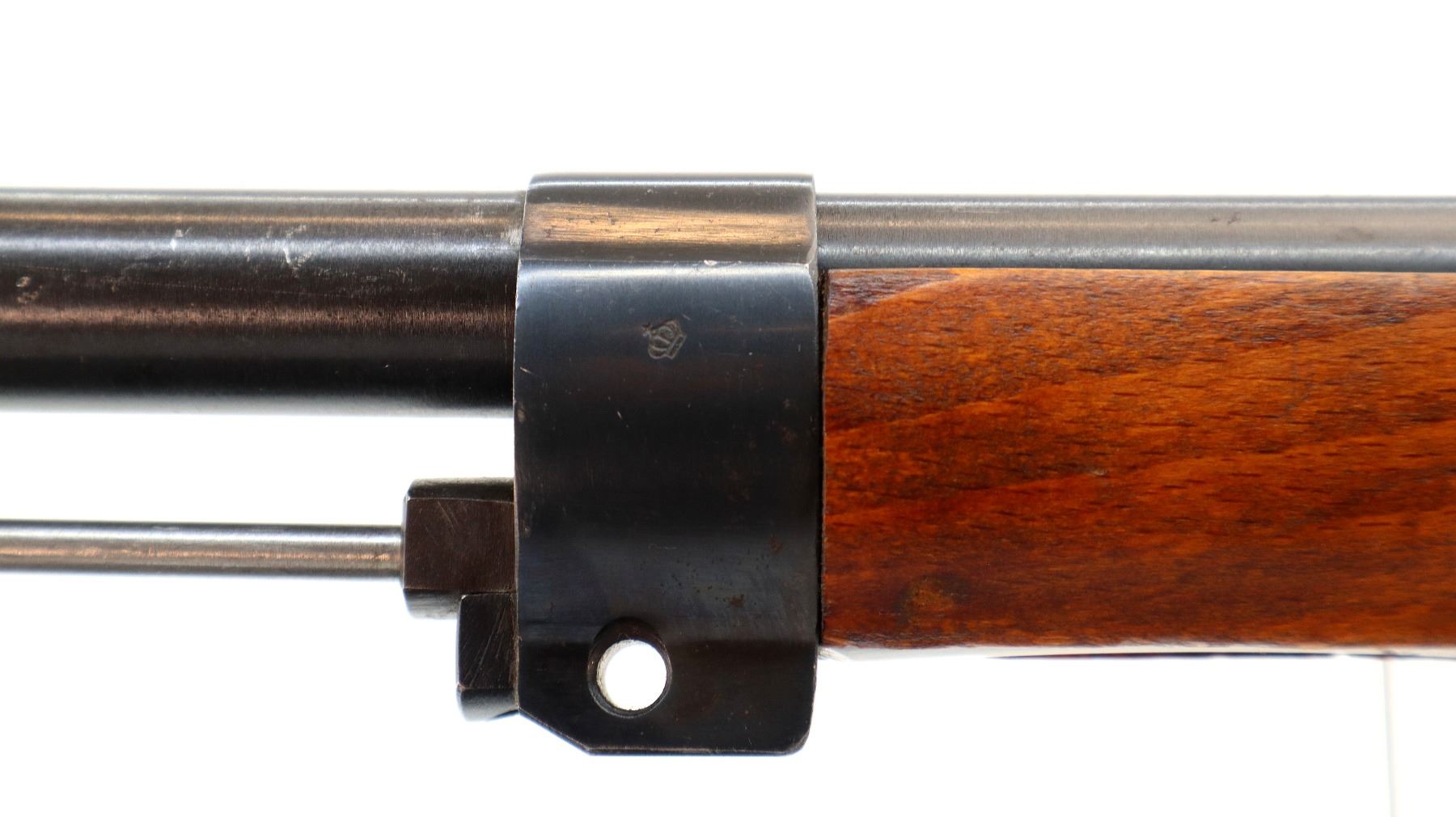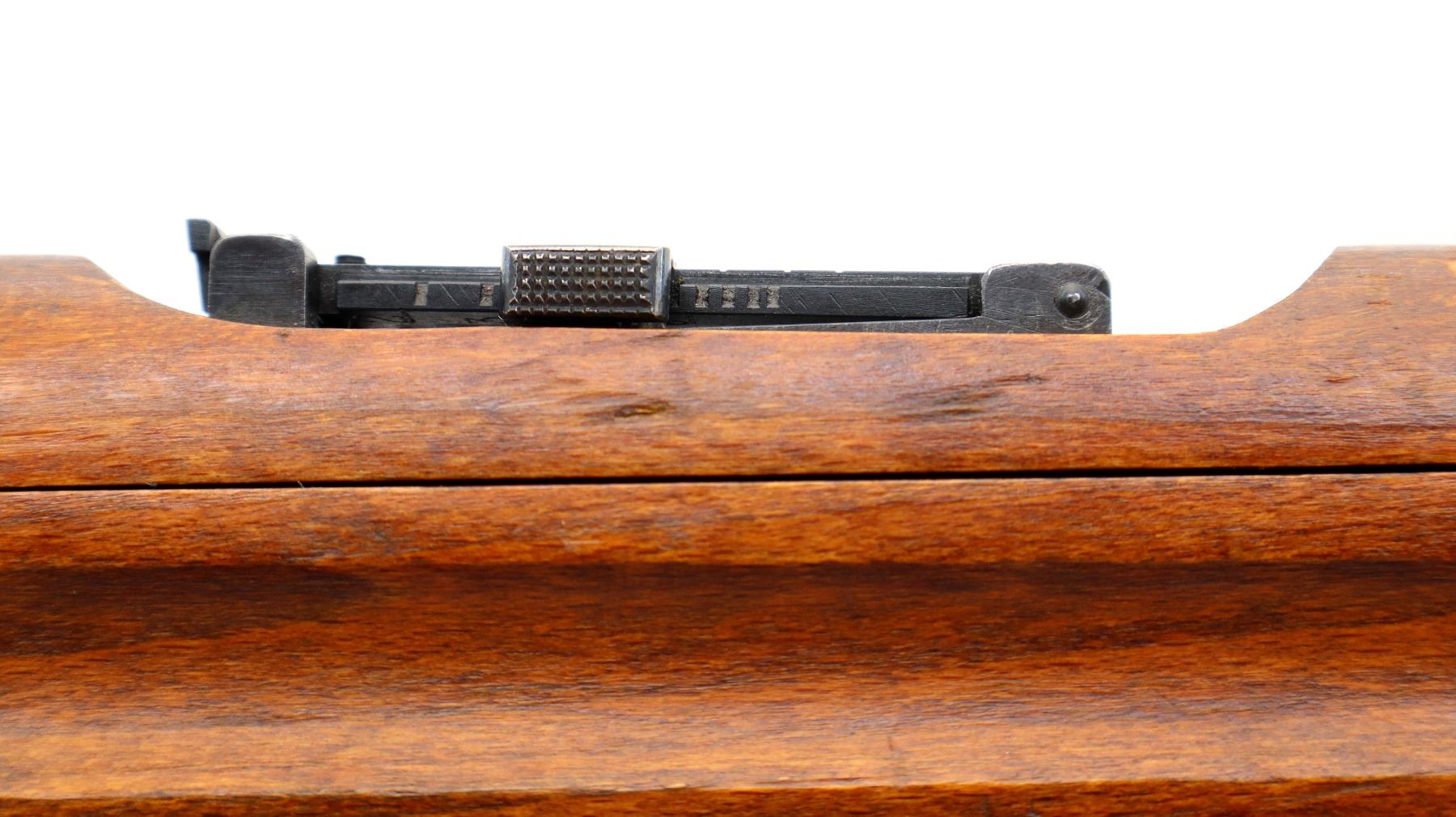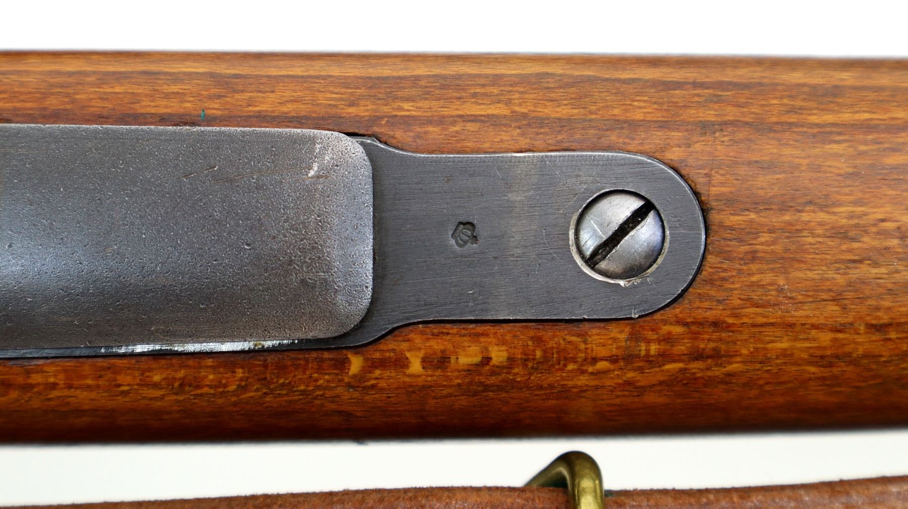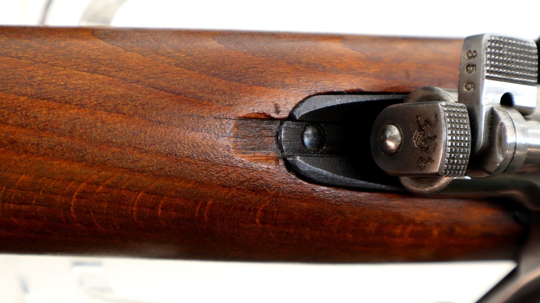 Main Description: Manufactured by Husqvarna 1942, arsenal rebuilt numbered to match. Blade front sight with ramp, adjustable u notched rear sight, blued finish, silver bolt with turned down handle. Two piece full military wood stocks, finger grooved forearm, straight grip, smooth steel butt plate, brass stock disk, four small holes in right side of stock, sling swivels with brown leather military sling, cleaning rod, bayonet lug.