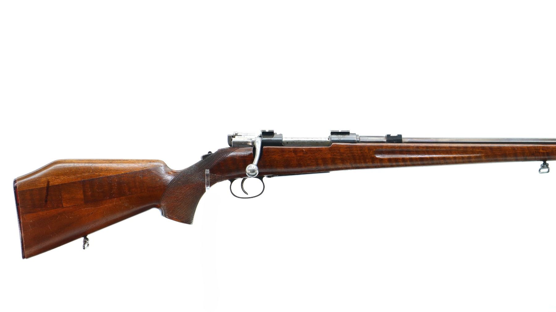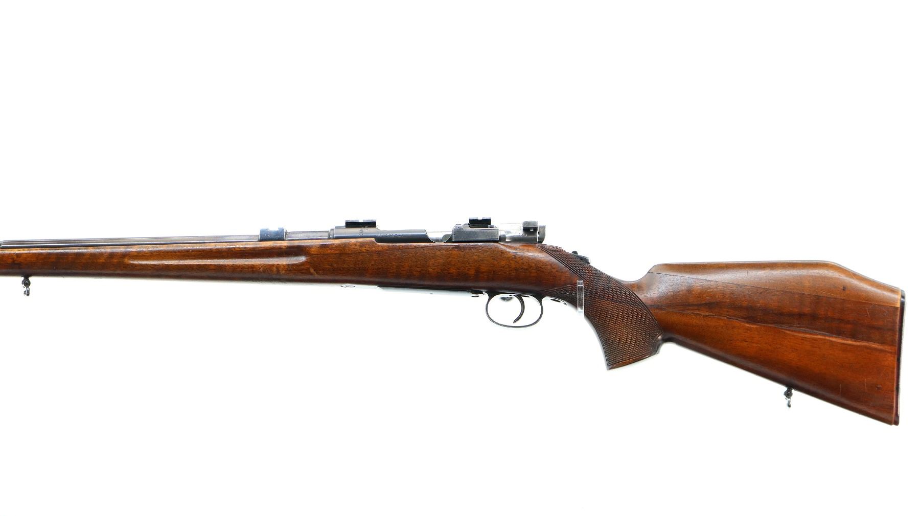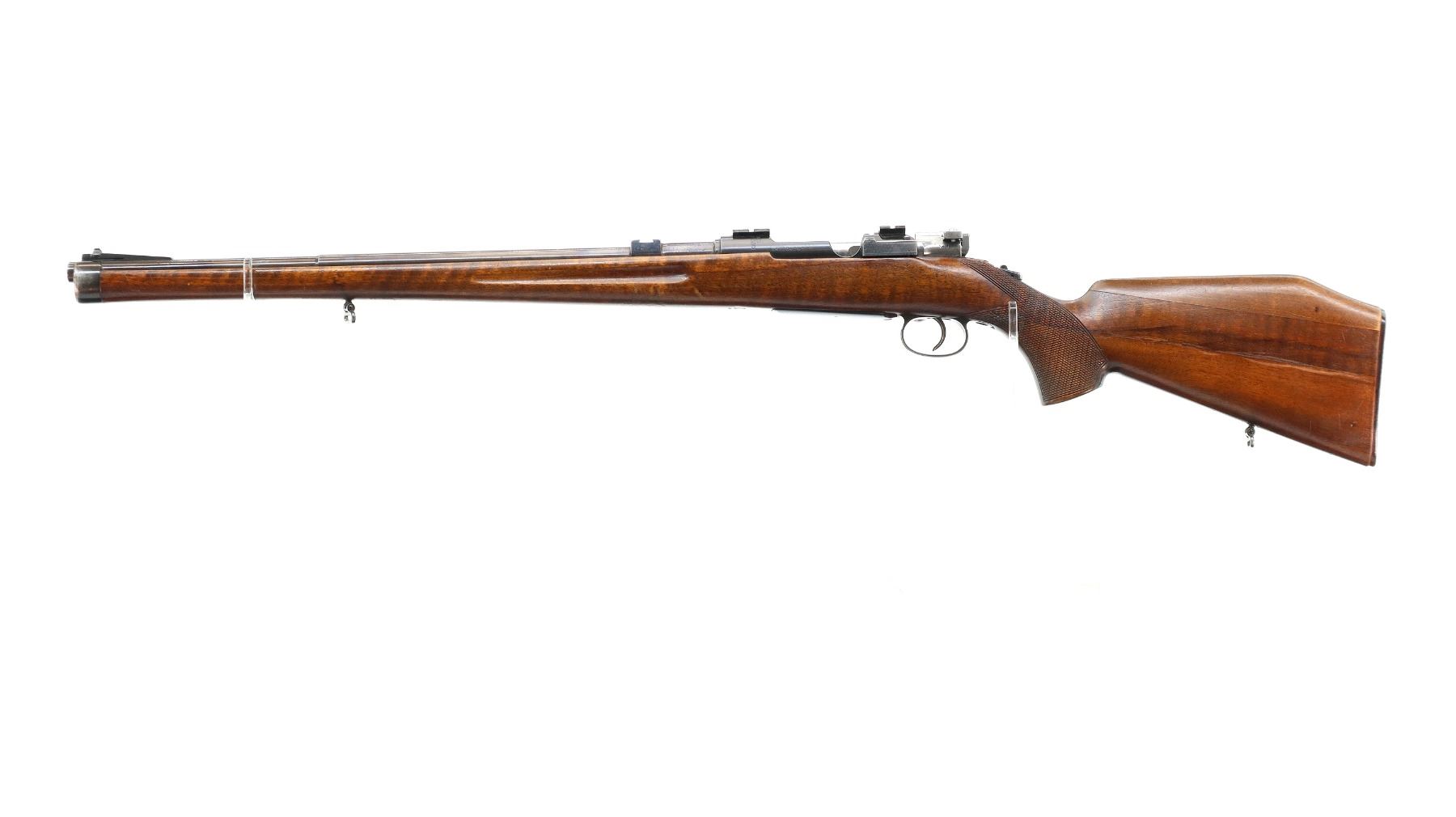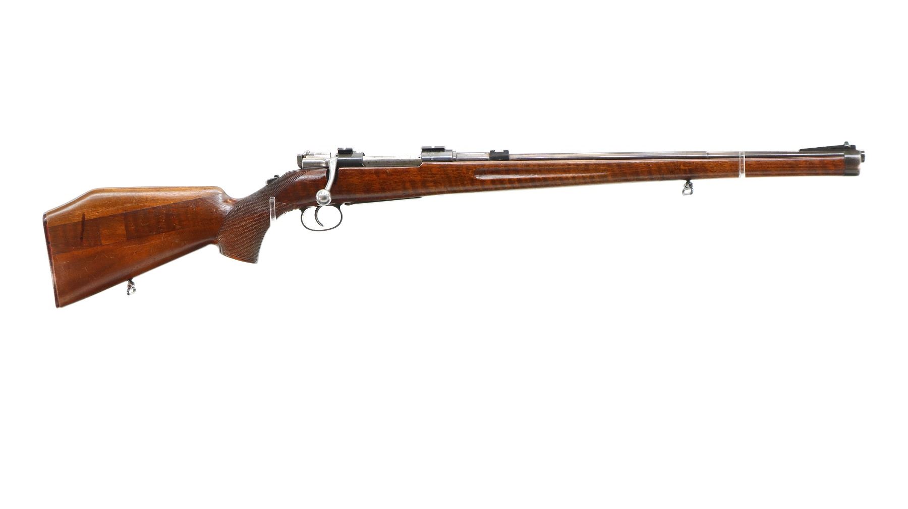 Main Description: Manufactured by Carl Gustaf, bolt matches. Blade front sight with ramp, missing rear sight dovetail present, blued finish, silver bolt with modified handle, receiver drilled and tapped with two piece scope bases, custom tang safety. One piece sporterized full length wood stock, finger grooved forearm, checkered pistol grip, butt stock is modified with added on comb, checkered black polymer butt plate, sling swivels, steel nose cap