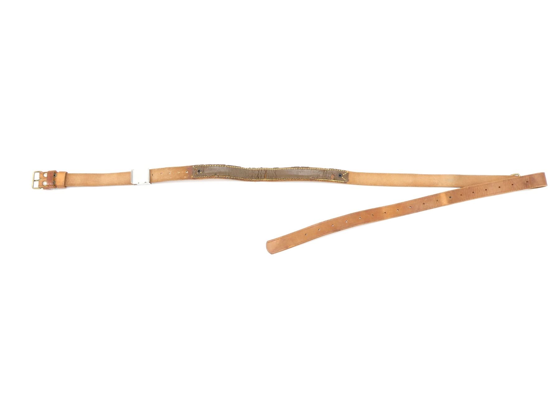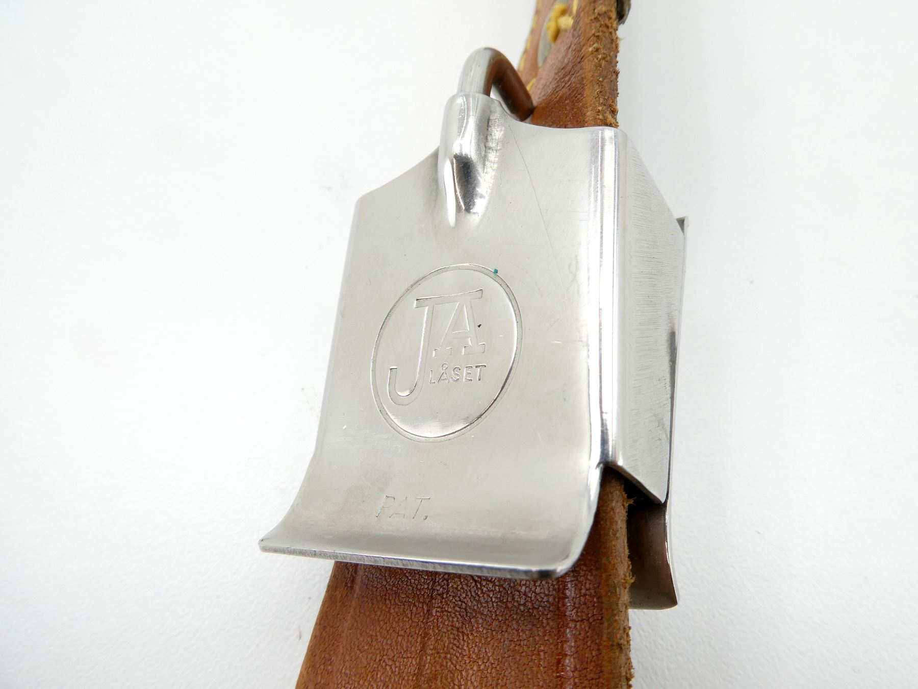 (1) BROWN LEATHER RIFLE SLING WITH METAL BUCKLE MARKED: "JA, LASET", METAL / BRASS FITTINGS, OVERALL LENGTH APPROX. 71", ADJUSTABLE. SEE PHOTOS.