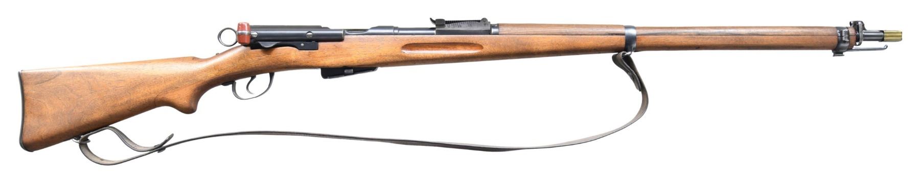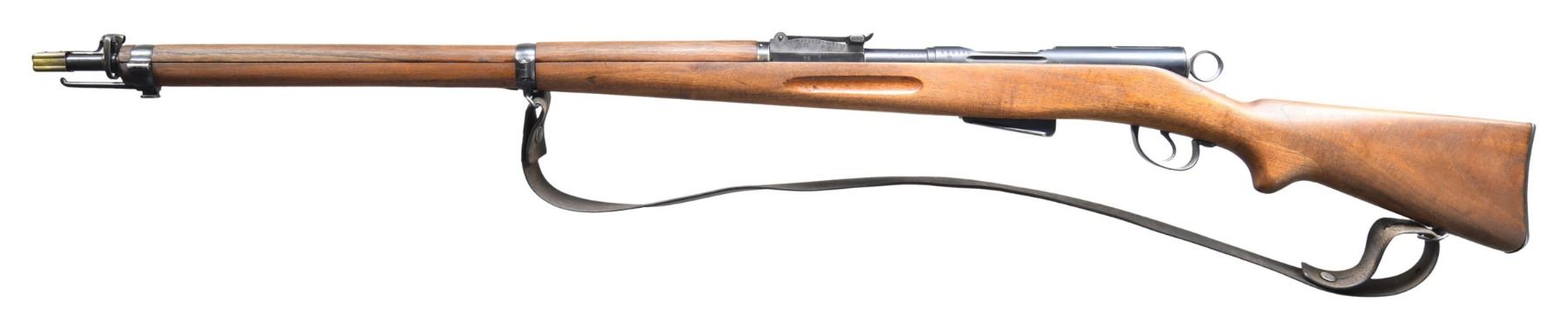 Cal. 7.5 Swiss. S# 338110. Bbl. 31". Blade front sight. Tangent rear sight graduated to 2000m. Matching numbers on receiver, bbl., buttplate, bolt & mag. Rear sight has separate assembly number & other visible parts are unnumbered. Left side of receiver has "P" private marking. Left side of rear sight base marked "7.5". Blued finish. Walnut stock set with no discernable cartouches. Bottom mounted sling swivels with leather sling. MAG: 1-6 rd. detachable. UNATTACHED ACCESSORIES: brass muzzle cover. CONDITION: sanded stock set shows the typical 96/11 reinforcement in wrist, scattered handling marks & light dings. Metal retains 85% arsenal with some light pitting at muzzle, scattered edge wear, fading & light oxidation. Action functions properly when hand cycled. Bright near excellent bore. (25-2189/MJC). CURIO. $300-500.
