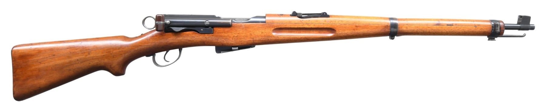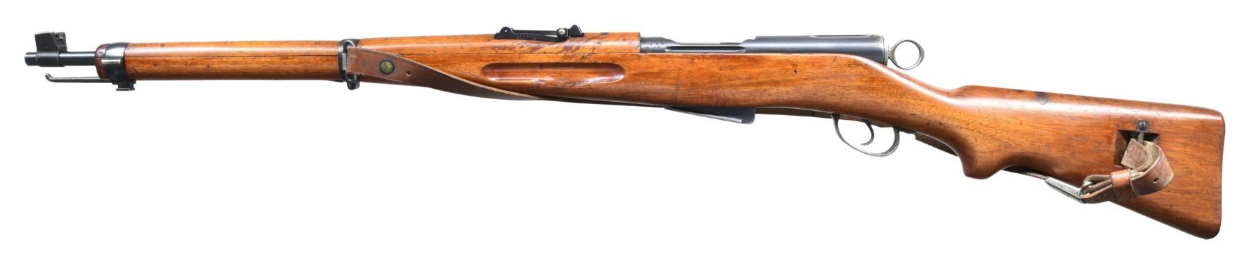 Cal. 7.5 Swiss. S# 416. Bbl. 23". Blade front sight with protective ears. Tangent rear sight graduated to 1500m. Matching numbers on receiver, bolt, mag, trigger & front sight. Rear sight has separate assembly number that matches itself. Other visible parts are unnumbered. Rifle started life as a 1905 model but was later arsenal updated to 1911 configuration. Left side of receiver has "P" private marking. Walnut stock set with left side sling provisions & leather sling that has an "A" marked buckle. CONDITION: refinished stock set has added varnish with no visible markings, scattered filler repairs, a small crack behind upper tang, dings & handling marks. Buttplate has an added blue finish with scattered flaking. Balance of metal retains 85% arsenal blue with some touch up finish, edge wear, fading & light oxidation. Action functions properly when hand cycled. Near excellent bore. (25-2314/MJC). CURIO. $300-400.