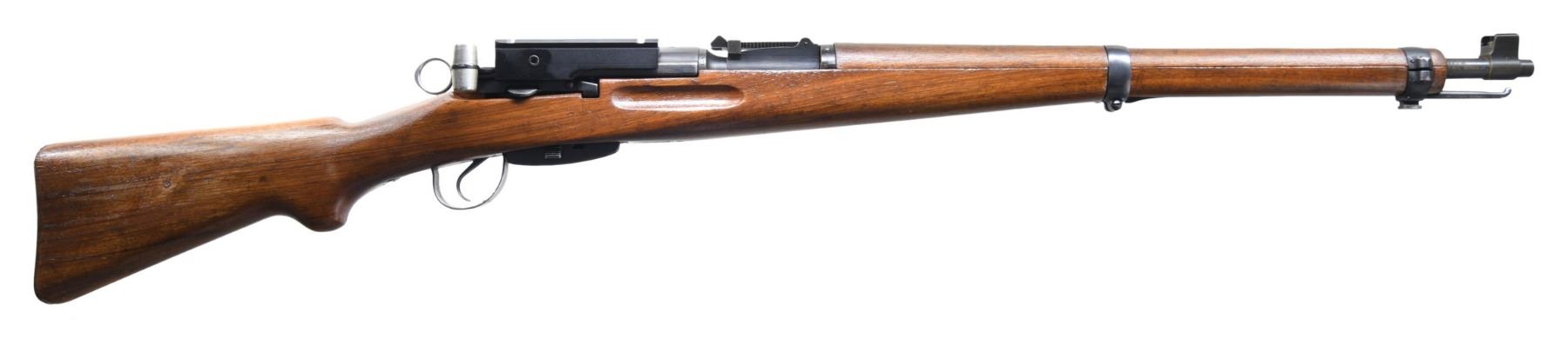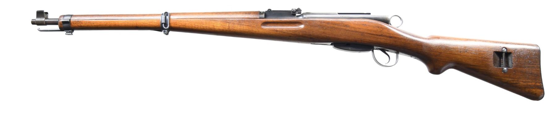 Cal. 7.5 Swiss. S# 737900. Bbl. 25 5/8" with import marking. Blade front sight with protective ears. Tangent rear sight graduated to 1500m. Right side of receiver has modern Weaver style scope mount. All visible matching numbers including mag. Receiver top has Swiss cross marking. 1943 made K31 rifle. Blued finish. Walnut stock set with left side sling provisions. Right side of butt has Swiss cross cartouche. MAGS: 1-6 rd. CONDITION: stock appears lightly sanded with added finish, a neatly executed armorer repair at toe, scattered handling marks & light dings. Metal retains 40% arsenal rework blue with many areas turning gray possibly from touch-up blue, some light oxidation & edge wear. Action functions properly when hand cycled. Bore shows a ring near muzzle but is otherwise bright with strong rifling. (25-2222/MJC). CURIO. $200-400.