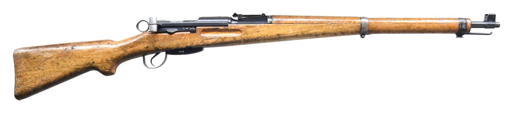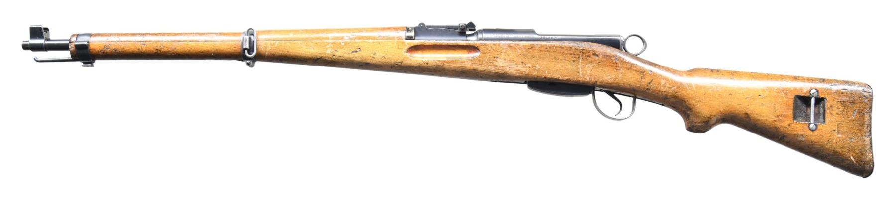 Cal. 7.5 Swiss. S# K3100820 (Importer). Bbl. 25 5/8". Blade front sight with protective ears. Tangent rear sight graduated to 1500m. All visible matching numbers. 1941 made K31. Receiver ring has Swiss cross shield. Left side of receiver has Century import marking with importer serial number. Blued finish. Beech stock set with partially faded Swiss cross cartouche & left side slide provisions. MAGS: 1-6 rd. matching numbered to rifle. CONDITION: stock set has added finish with a small split at rear of handguard, scattered flaking, dings, dents & handling marks. Metal retains 85% arsenal blue with rear band toning to gray, some light oxidation & edge wear. Action functions properly when hand cycled. Bright near excellent bore. (25-2456/MJC). CURIO. $400-600.