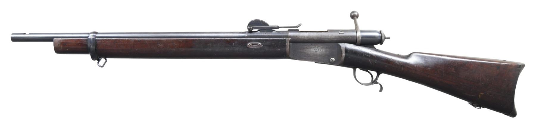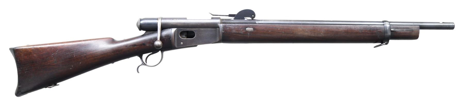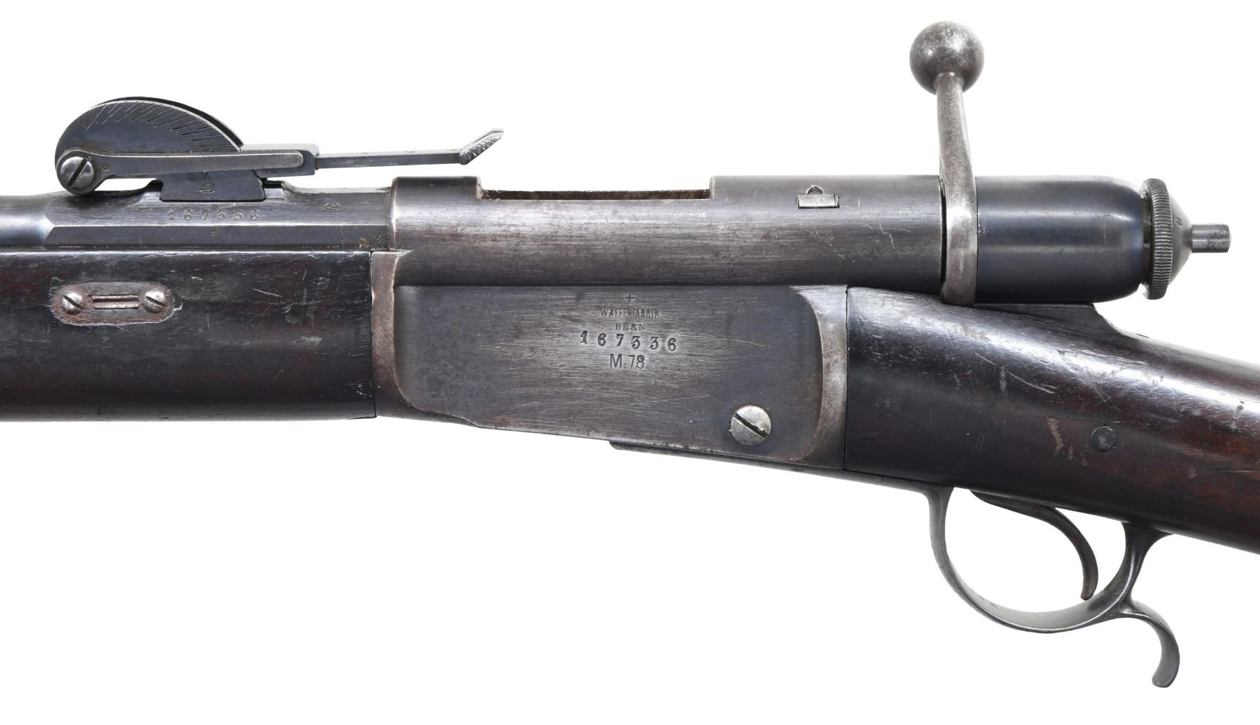 Cal. 41. S# 167336. Bbl. 23" shortened. No front sight present. Standard Swiss military rear sight graduated to 1500m. Swiss Vetterli rifle converted to in-line percussion style muzzle loader. Blued finish. Walnut stock set with shortened forend & bottom mounted sling swivels. No ramrod present. CONDITION: stock set shows the expected scattered dings, handling marks, scratches & light chips. Metal retains 40% arsenal blue with overall fading to gray, some scratches & oxidation. Bolt falls to rear when cycled & will likely need attention before gun is functional. Bore is dark with scattered oxidation patches but evident rifling. (01-27166/MJC). ANTIQUE. $300-500.