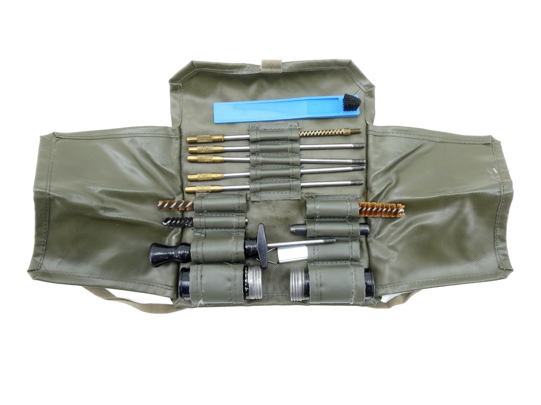 (1) CLEANING KIT, FITS SCHMIDT-RUBIN K11 & K31 RIFLES, GREEN NYLON CLEANING KIT COMES WITH RODS, OILERS, BRUSHES, CHAMBER MIRROR, ETC., KIT MARKED: "H. SCHENK, DAVOS 1968". SEE PHOTOS.