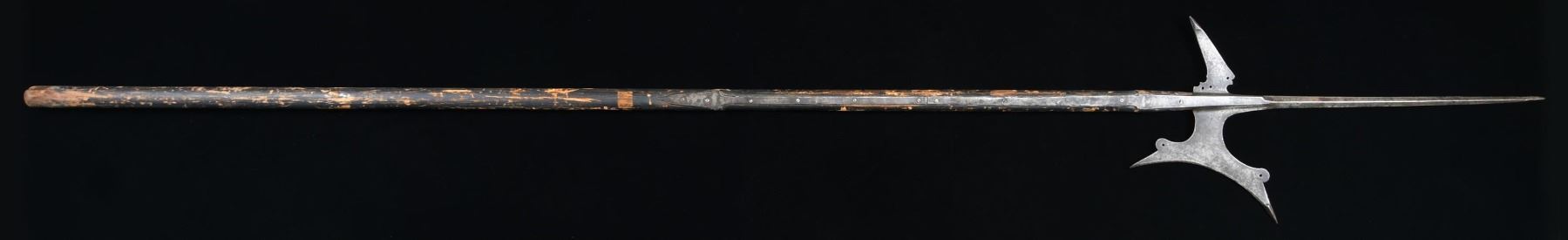 CENTURY. This early European iron halberd is likely of Swiss or possibly German origin. It appears to be on the original haft and measures just over 93" in length. The base of the haft is slightly rounded, and the head measures 53 1/2" overall. The top of the halberd has a 17" spear point with a crescent-shaped blade and downward turned rear spike. The blade measures 9 1/2" in length and approx. 7 1/4" to the center. The opposite spike measures 5" to the center. The supporting straps running down the sides are in two pieces and measure 32 3/8" from the top of the haft. There are six screws/rivets in the lower section of the straps and six screws/rivets in the upper section as well. CONDITION: the head and straps have a dark gray patina. The haft remains quite solid but shows numerous scuffs and scrapes throughout its length. PROVENANCE: from the renowned collection of quality sporting arms from Lewis Drake together with inventory of Lewis Drake Associates. (02-23550/BF). $800-1,200.