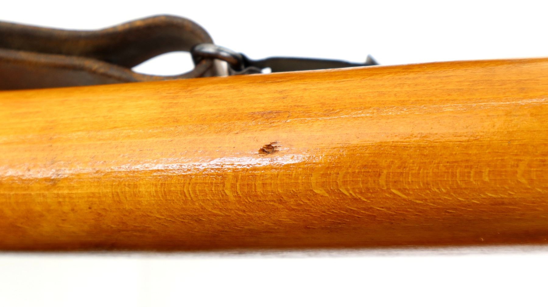 Main Description: Manufactured 1940, visible serial numbers match. Blade front sight with ears and ramp, adjustable u notched rear sight, blued finish, Swiss crest on receiver ring, silver bolt with two piece knobs. Two piece full military wood stocks, finger grooved forearm, pistol grip, smooth steel butt plate, sling swivels with brown leather military sling, bayonet lug, stacking hook.