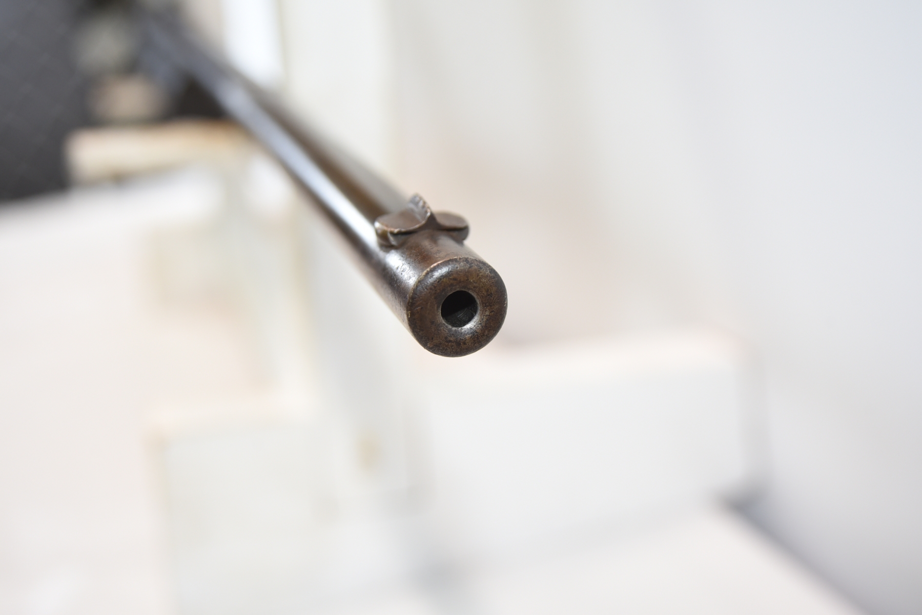 Metal shows patina, scratches, scuffs, finish wear, there is pitting marks/solder on the barrel; condition is fair.