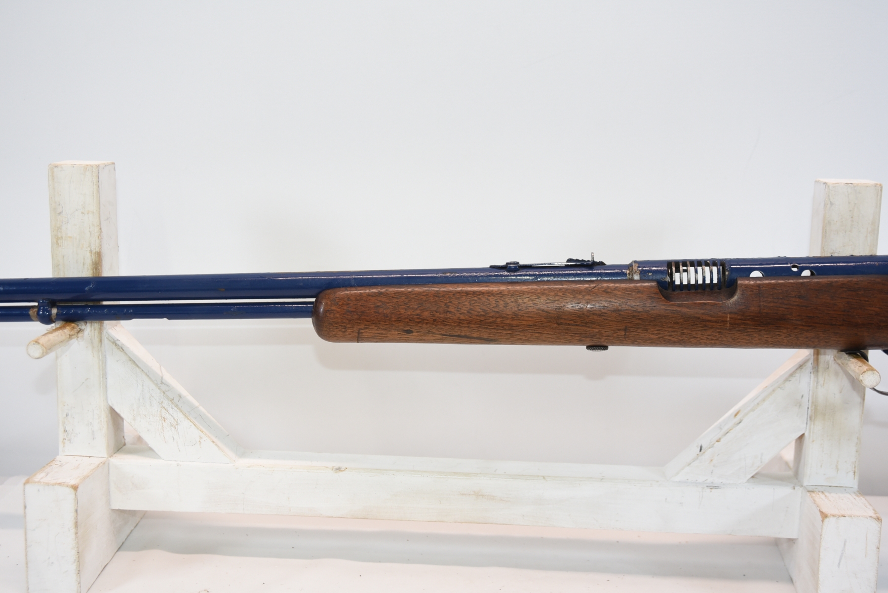 Metal shows a mostly blue painted surfaces, there are dents, scratches, peeling paint, there is a parts bag with the rifle with unknown number of parts inside; condition is poor.