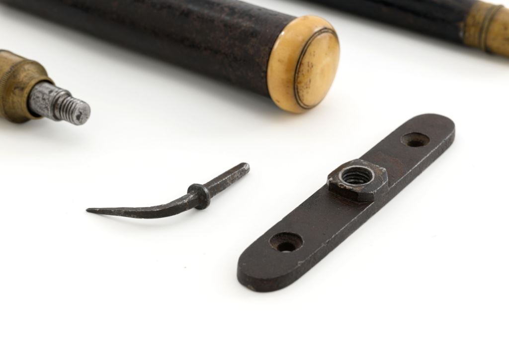Scarce Cased Air Cane with Pump, #NVSN, .32 cal., 20" barrel, black finish to the body with brass fittings and an ivory screw-on handle cap. Lower section of the cane features small, fixed sights and a brass tip that must be removed prior to firing. Iron pump has brass fittings and removeable iron handle. Body of the pump with remnants of a makers mark, partially legible as obscured by wear and pitting is "Co. 7 Bernard St. South Hampton". There are no legible markings on the cane itself. Included are a brass capped glass bottle for oil/grease, an ornate iron key for cocking/firing. All contained in a compartmentalized wood case, with green baize interior. Case is 24" in length, 6" in width, and 2.5" in depth, with a 7" x 4.5" label attached to the middle of the inside cover proclaiming "JOHN RIGBY & Co. 24. SUFFOLK STREET, DUBLIN, PATENTEES GUN & RIFLE MANUFACTURERS". The cane itself shows much wear to the black finish, with frosted oxidation to most of the exposed metal surfaces. Brass is uncleaned, showing expected patina. Ivory has taken on a pleasing yellow hue with age. Pump also remains uncleaned with dark patination to the iron surfaces, especially the handle. The threaded handle is easily attached and pump action moves freely. Wood case is good for its age, showing beautiful grain patterns to the hardwood, with an unmarked brass circular medallion inset into the middle of the lid and two metal lid retaining levers showing toning from age. Rear brass hinges are complete and securely hold the lid attached to the cases base. There is a larger mar to the front edge of the lid, as well as evidence of repair, with glue visible along the front seam. Interior label is yellowed from age but clearly legible. Interior shows age and wear that is consistent with the rest of the case. Included with this set is a typewritten summation of the workings of an air cane, also stating the piece was made by John Blanch (London 1801-1900) and was once part of the Beeman collection. Est.: $1,800-$2,400. (No FFL Required) (Michael Strietbeck Collection)