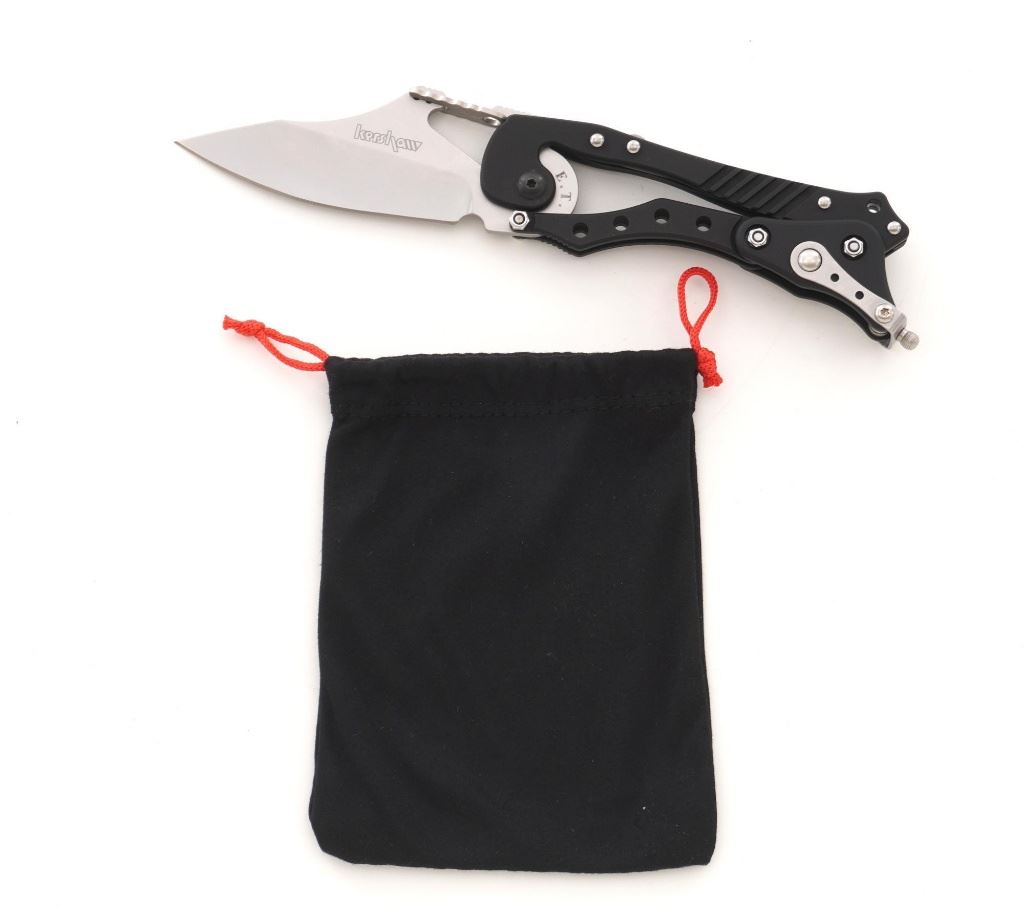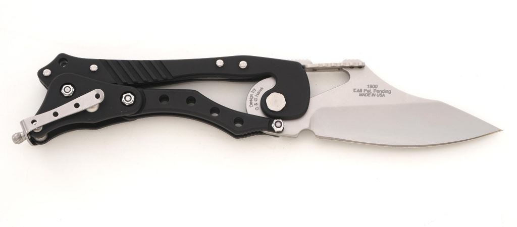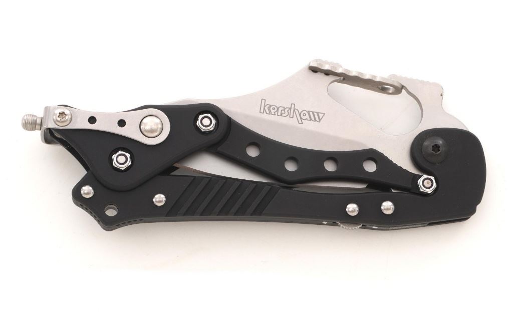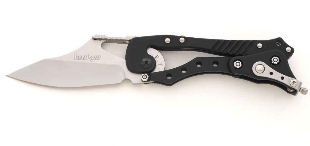 Scarce Kershaw Model 1900 External Toggle Folding Knife, Design by G & G Hawk, 3.25" blade with built in carabiner, black skeletonized frame can be locked closed, with reversible pocket clip. This unique ambidextrous design allows for the knife to be opened using one hand. Knife is in excellent, unused condition, with only a few minor handling marks. Est.: $200-$300.
