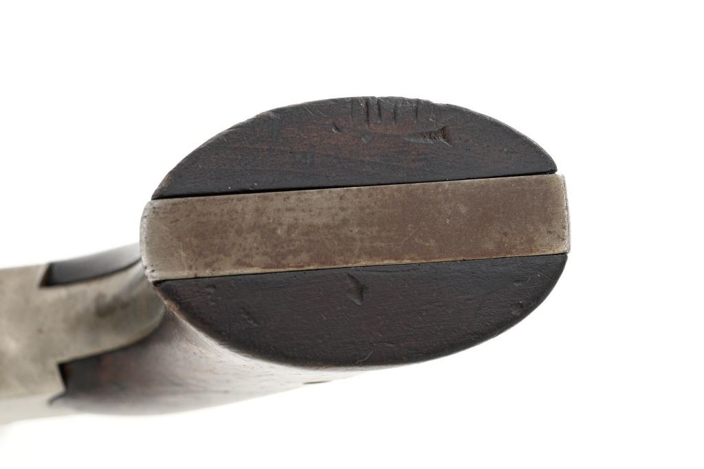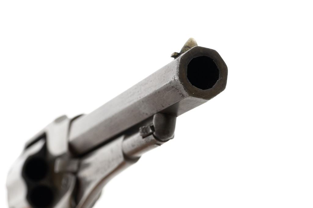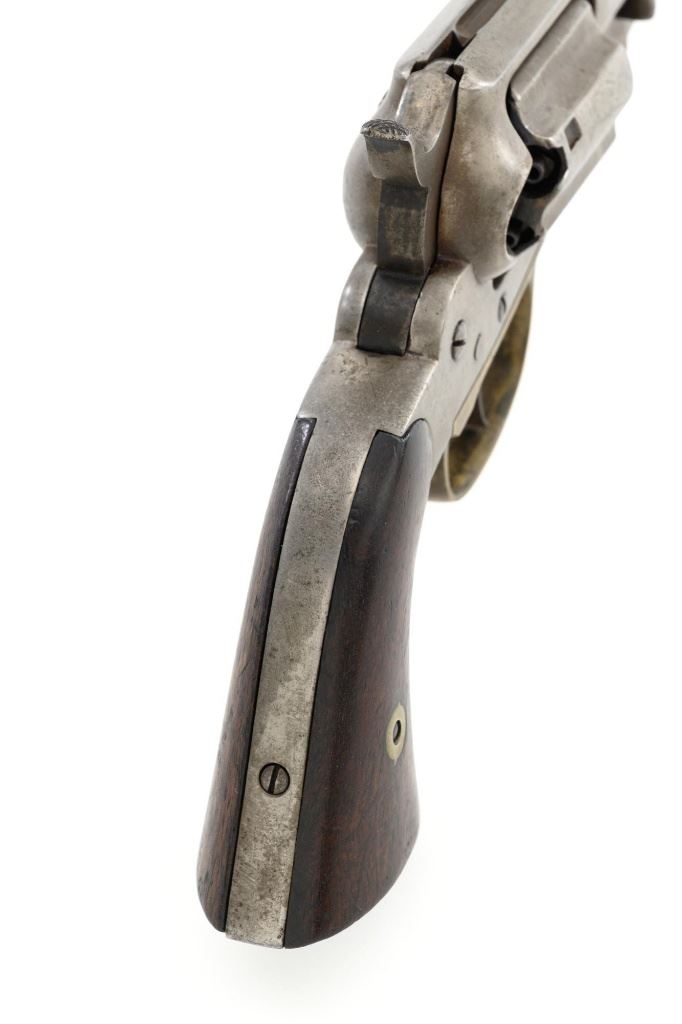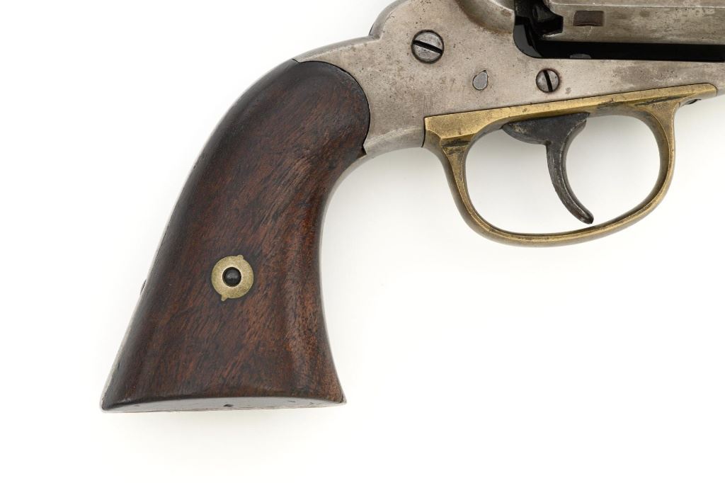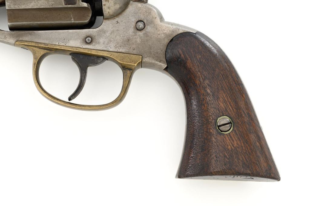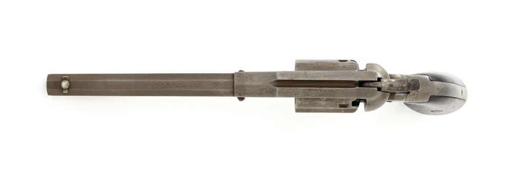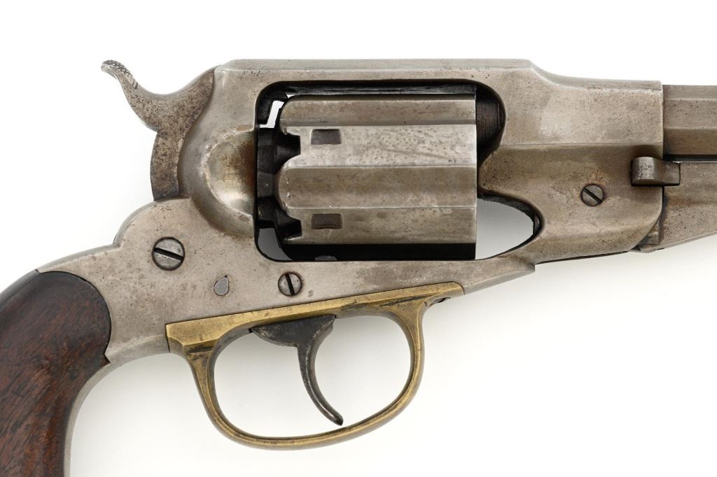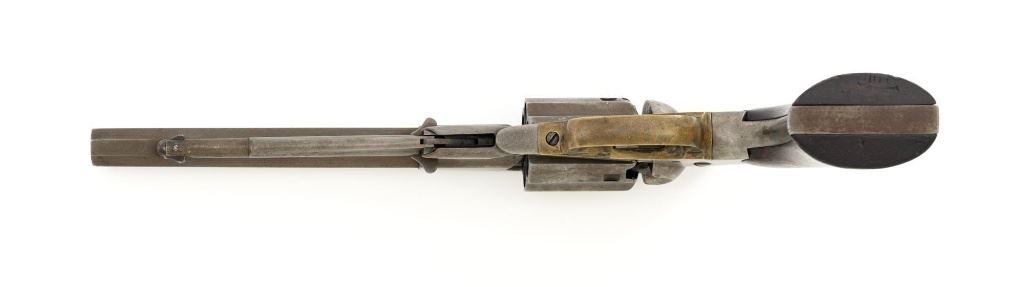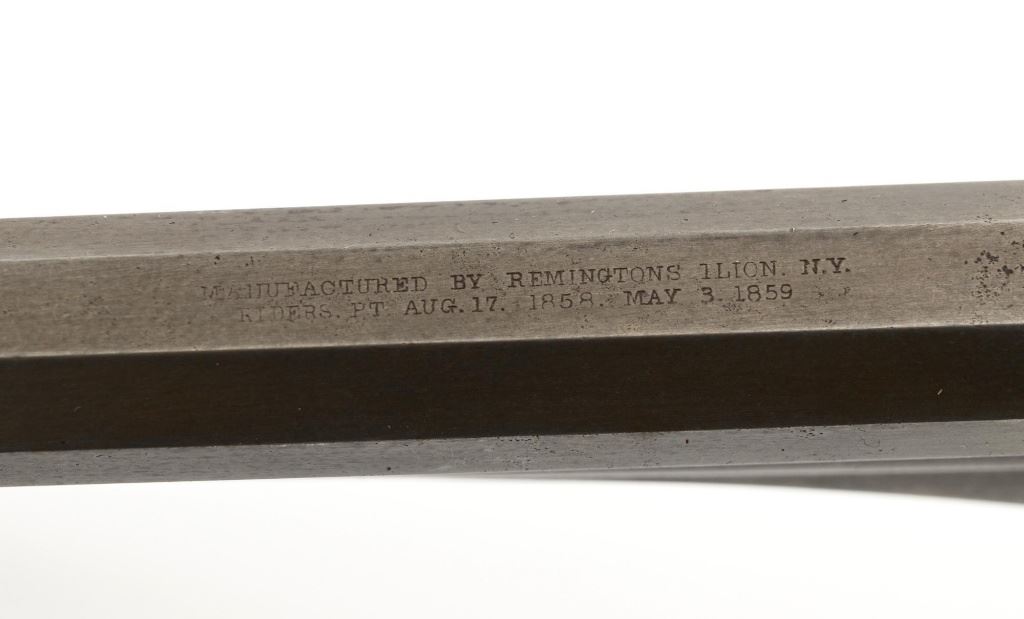 Scarce Remington-Rider New Model Double Action Belt Percussion Revolver with Fluted Cylinder, #413, .36 cal., 6.5" octagon barrel, gray patina, brass trigger guard, smooth two-piece walnut grips, cone front sight, and fixed "V"-notch rear sight. Matching visible numbers on 6-shot fluted cylinder, left side of the grip frame, and underside of the barrel. Barrel address is marked in two-lines "MANUFACTURED BY REMINGTONS ILION, N.Y./RIDERS. PT. AUG. 17, 1858. MAY 3, 1859." Scarce with the matching fluted cylinder as it is believed that only a few hundred were produced circa 1863-1865. Revolver is in good condition, displaying a smooth gray patina mixed with mild brown toning. Trigger guard is uncleaned, showing moderate toning. Factory lettering is legible. Grips show moderate age and handling wear, with most of the rich oil finish remaining. Action is crisp. Bore with scattered areas of light erosion, rifling is very good. Est.: $1,500-$2,000. (Antique) (Michael Strietbeck Collection)
