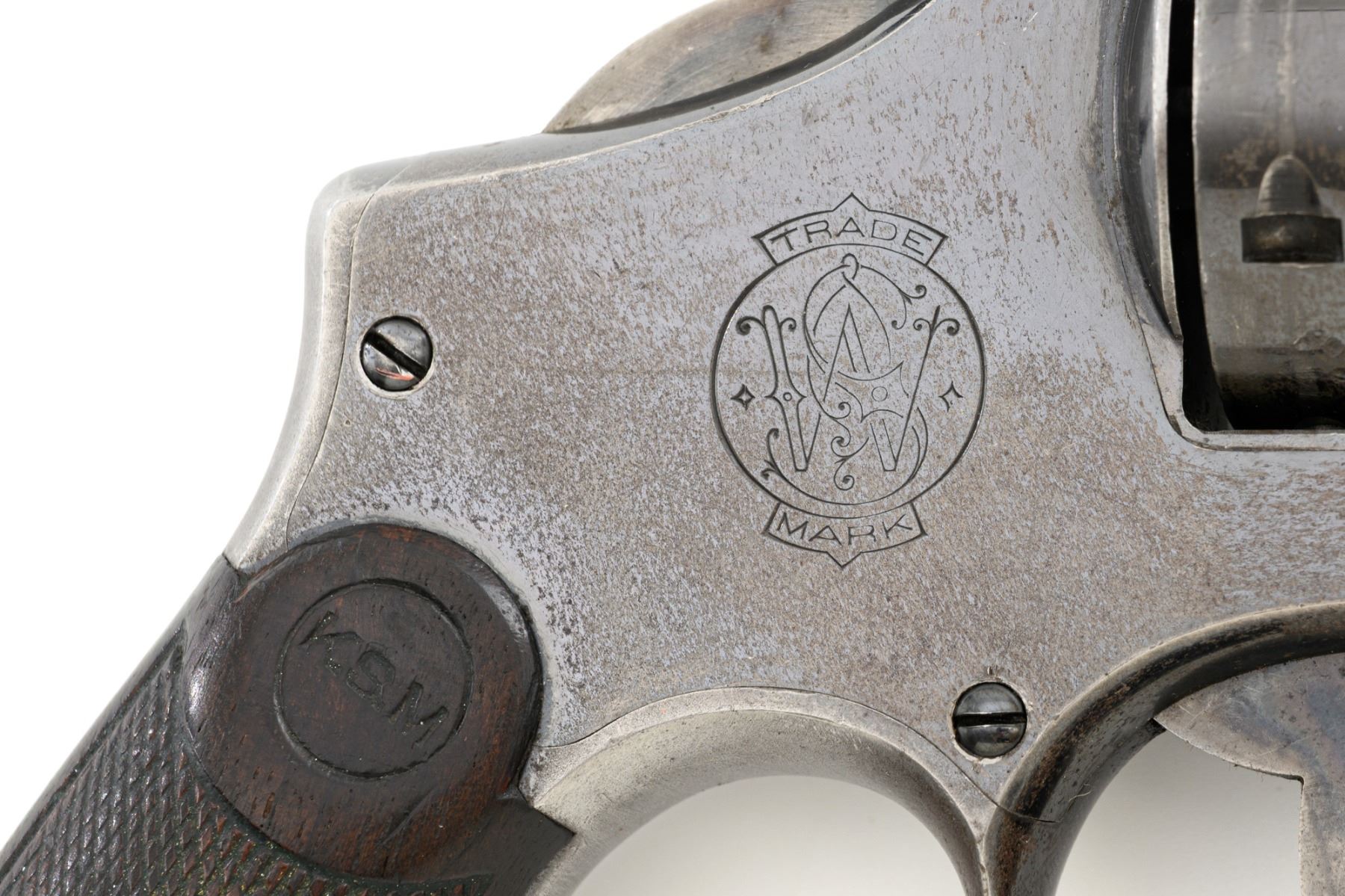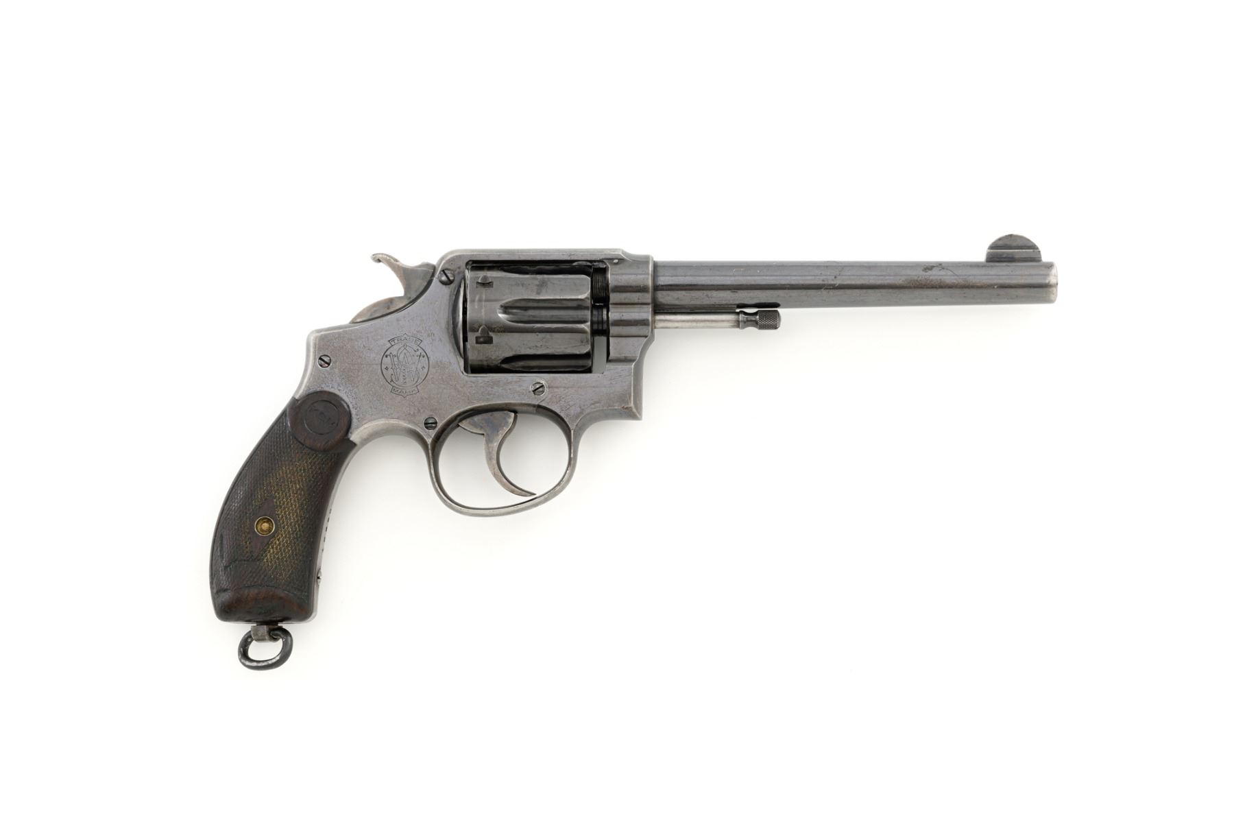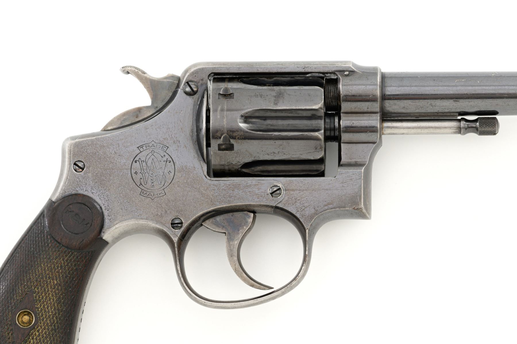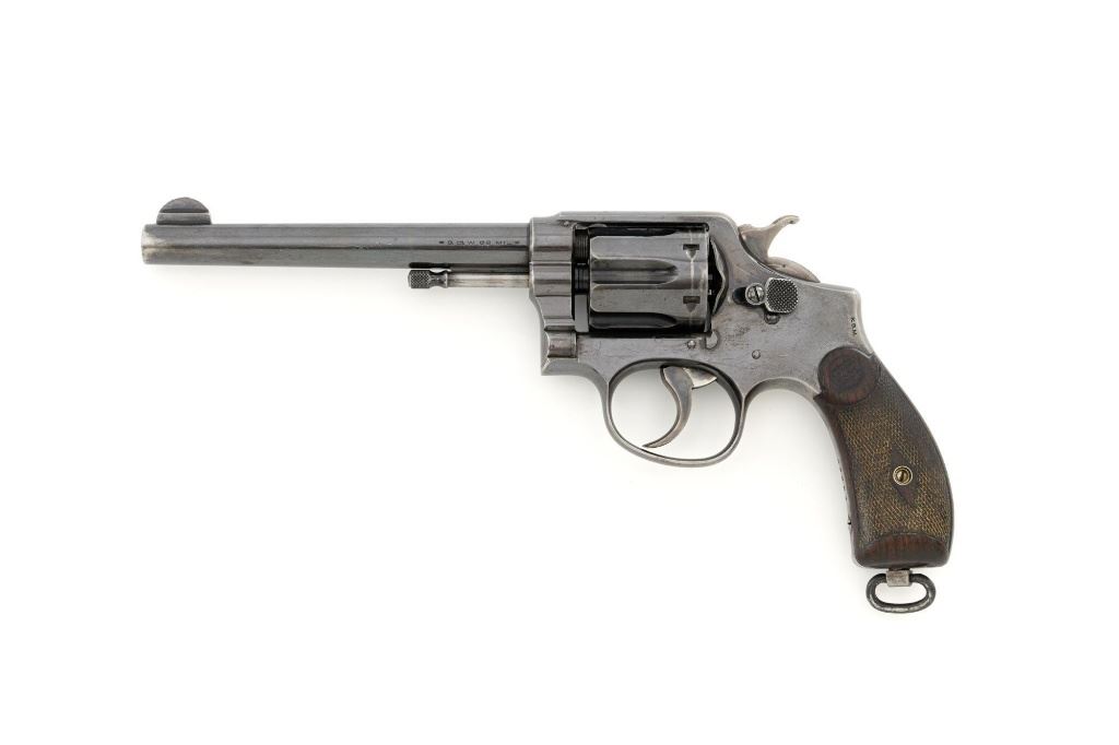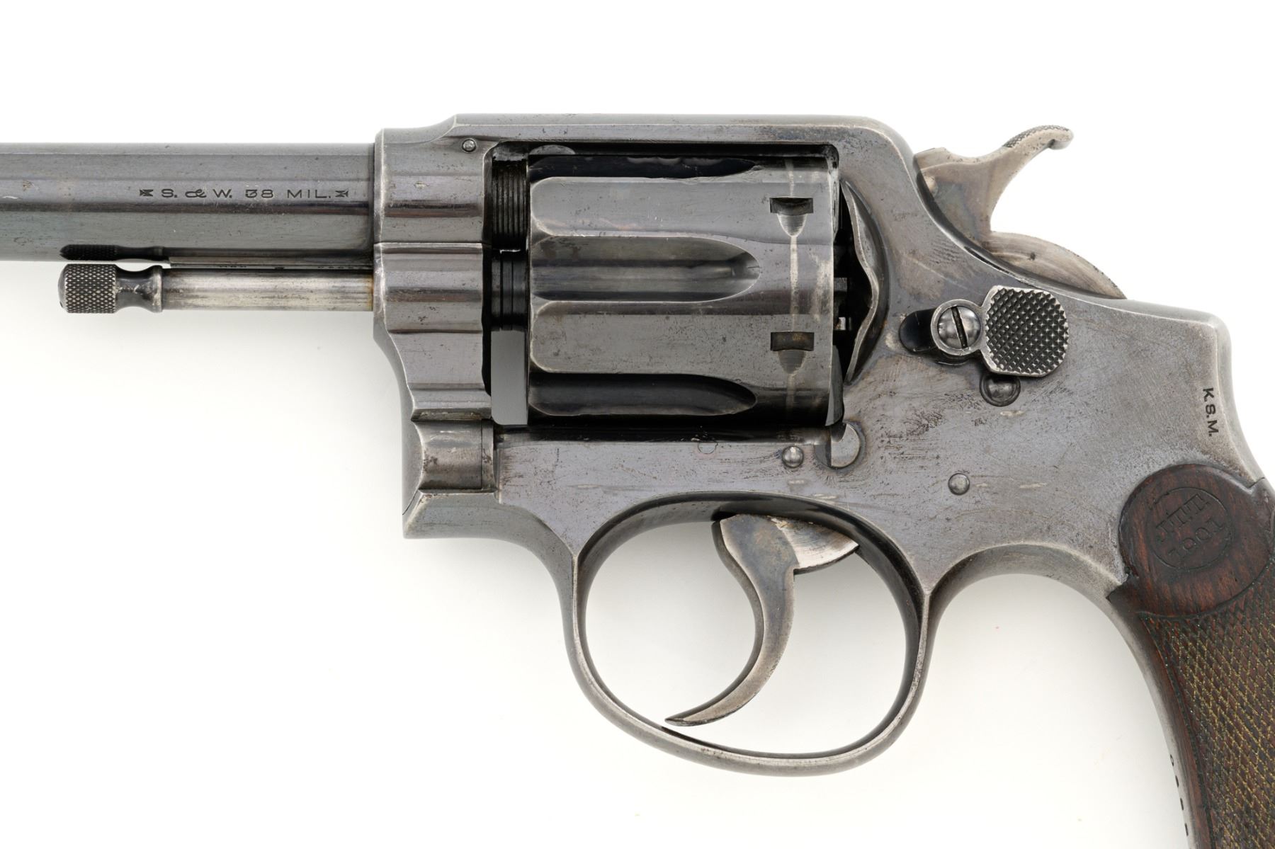 Scarce U.S. Army Marked Smith & Wesson 1st Model 1899 Military & Police Double Action Revolver, #13890, .38 Long Colt cal., 6" barrel, blue finish, checkered walnut two-piece diamond center grips with lanyard ring, blade front sight, fixed "U"-notch rear sight, color case hardened hammer and trigger. Factory markings are clear, with the butt marked "U.S. ARMY / MODEL 1899". Revolver is in very good overall condition, retaining approx. 80%-85% thinning finish, with wear at the muzzle, scratches, and scattered spots of surface erosion. Cylinder shows leading edgewear, wear around the flutes, and numerous indentations. Front and backstrap have worn to gray, while the trigger guard shows traces of original finish. There is a crisp "K.S.M." (Kelley S. Morse) inspection mark at the left rear of the frame. Hammer and trigger display muted color case hardened finish. Grips are in very good condition, with areas of smoothing to the checkering and indentations on the right panel. Marked "J.T.T 1901" (John Taliaferro Thompson) at the top of the left panel and "K.S.M." at the top of the right. Interior of the right panel is lightly marked in pencil with the matching serial number. Action functions well and locks up securely. Bore is very good with some areas of light erosion and well-defined rifling. Part of a group of 1,000 revolvers issued to the U.S. Army in the S&W serial number range 13001-14000. Chambered in .38 Long Colt, referred to as ".38 Military" to avoid using a competitors name. Est.: $1,200-$1,800. (C&R)