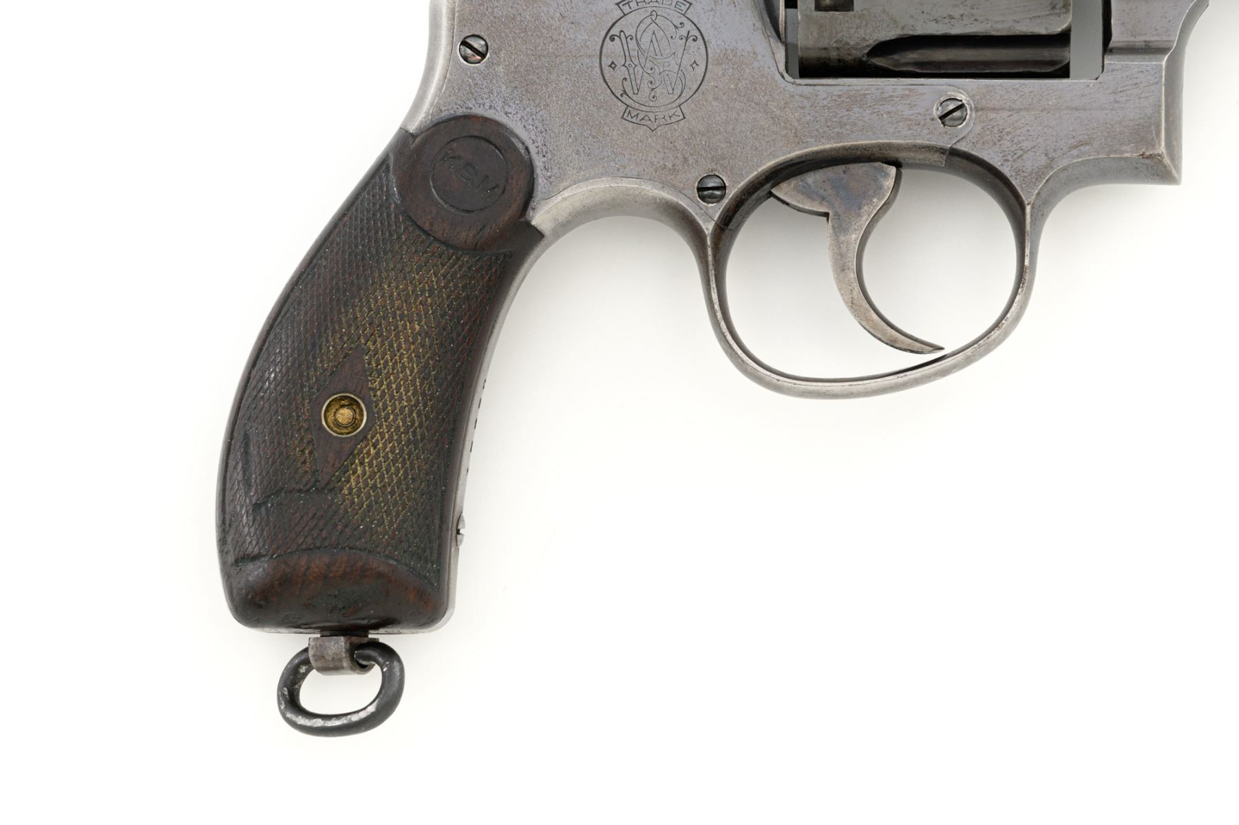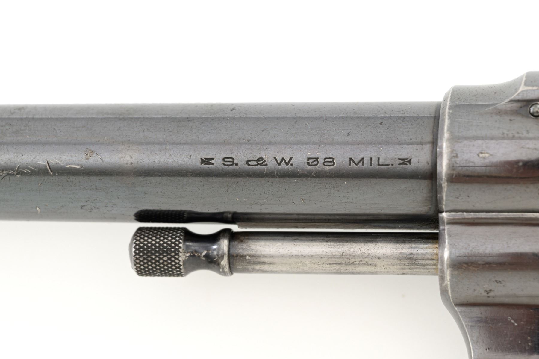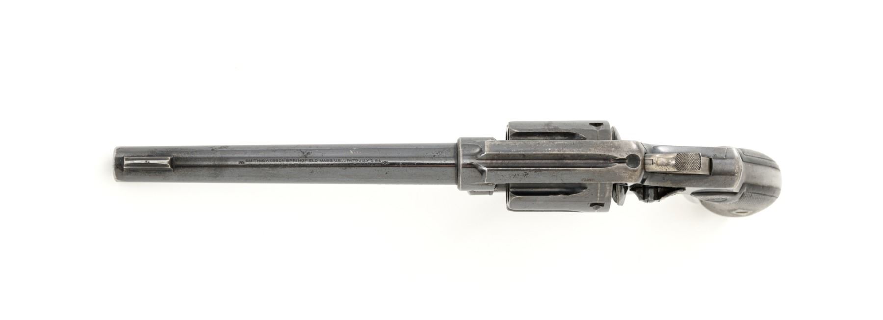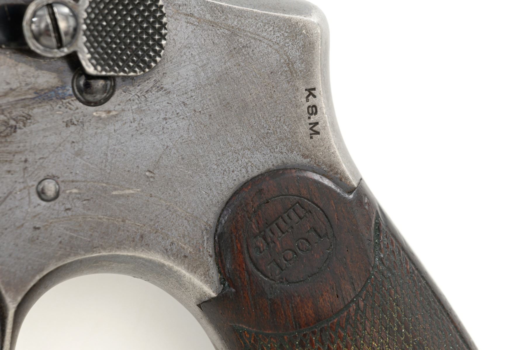 Scarce U.S. Army Marked Smith & Wesson 1st Model 1899 Military & Police Double Action Revolver, #13890, .38 Long Colt cal., 6" barrel, blue finish, checkered walnut two-piece diamond center grips with lanyard ring, blade front sight, fixed "U"-notch rear sight, color case hardened hammer and trigger. Factory markings are clear, with the butt marked "U.S. ARMY / MODEL 1899". Revolver is in very good overall condition, retaining approx. 80%-85% thinning finish, with wear at the muzzle, scratches, and scattered spots of surface erosion. Cylinder shows leading edgewear, wear around the flutes, and numerous indentations. Front and backstrap have worn to gray, while the trigger guard shows traces of original finish. There is a crisp "K.S.M." (Kelley S. Morse) inspection mark at the left rear of the frame. Hammer and trigger display muted color case hardened finish. Grips are in very good condition, with areas of smoothing to the checkering and indentations on the right panel. Marked "J.T.T 1901" (John Taliaferro Thompson) at the top of the left panel and "K.S.M." at the top of the right. Interior of the right panel is lightly marked in pencil with the matching serial number. Action functions well and locks up securely. Bore is very good with some areas of light erosion and well-defined rifling. Part of a group of 1,000 revolvers issued to the U.S. Army in the S&W serial number range 13001-14000. Chambered in .38 Long Colt, referred to as ".38 Military" to avoid using a competitors name. Est.: $1,200-$1,800. (C&R)