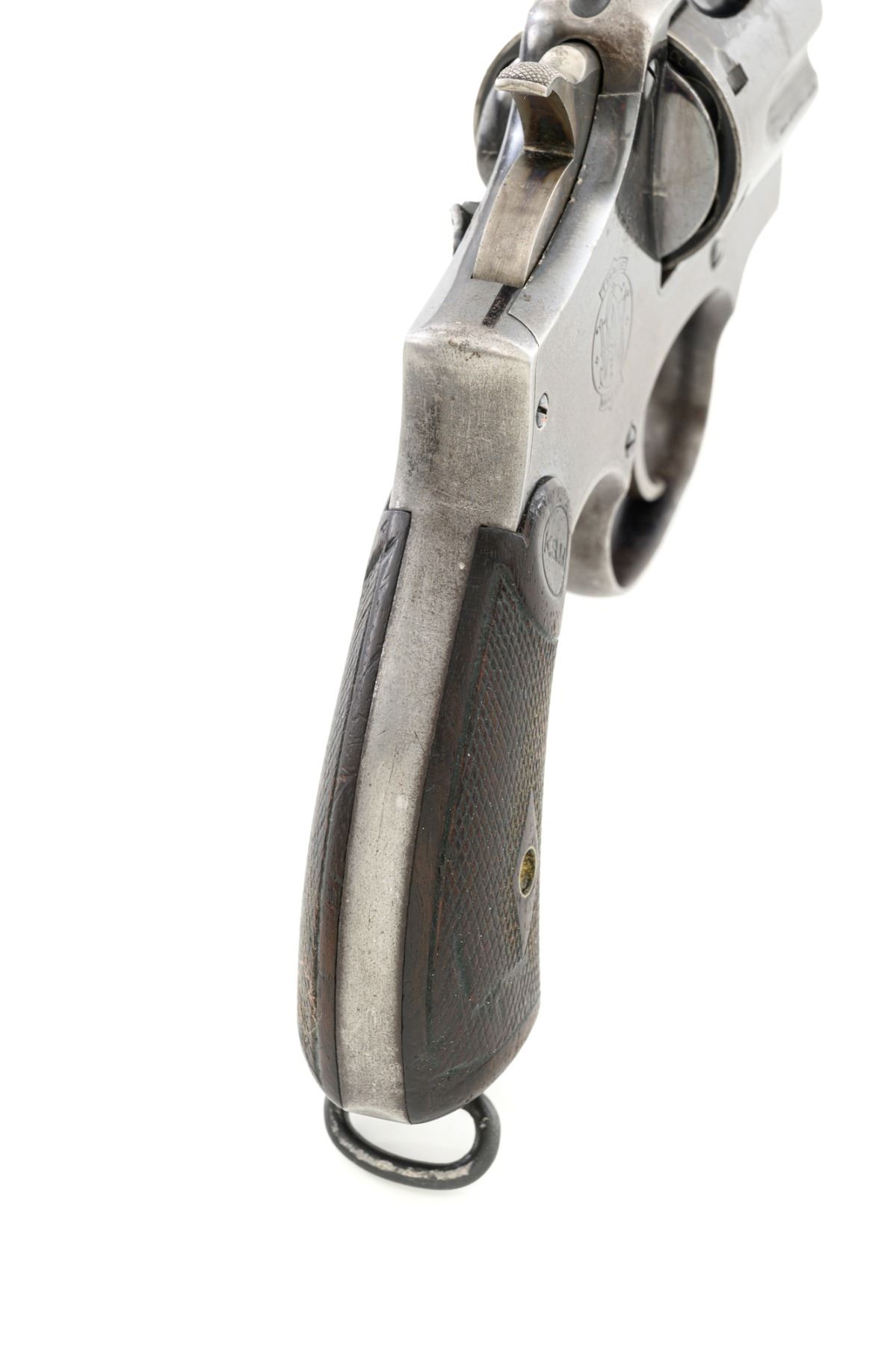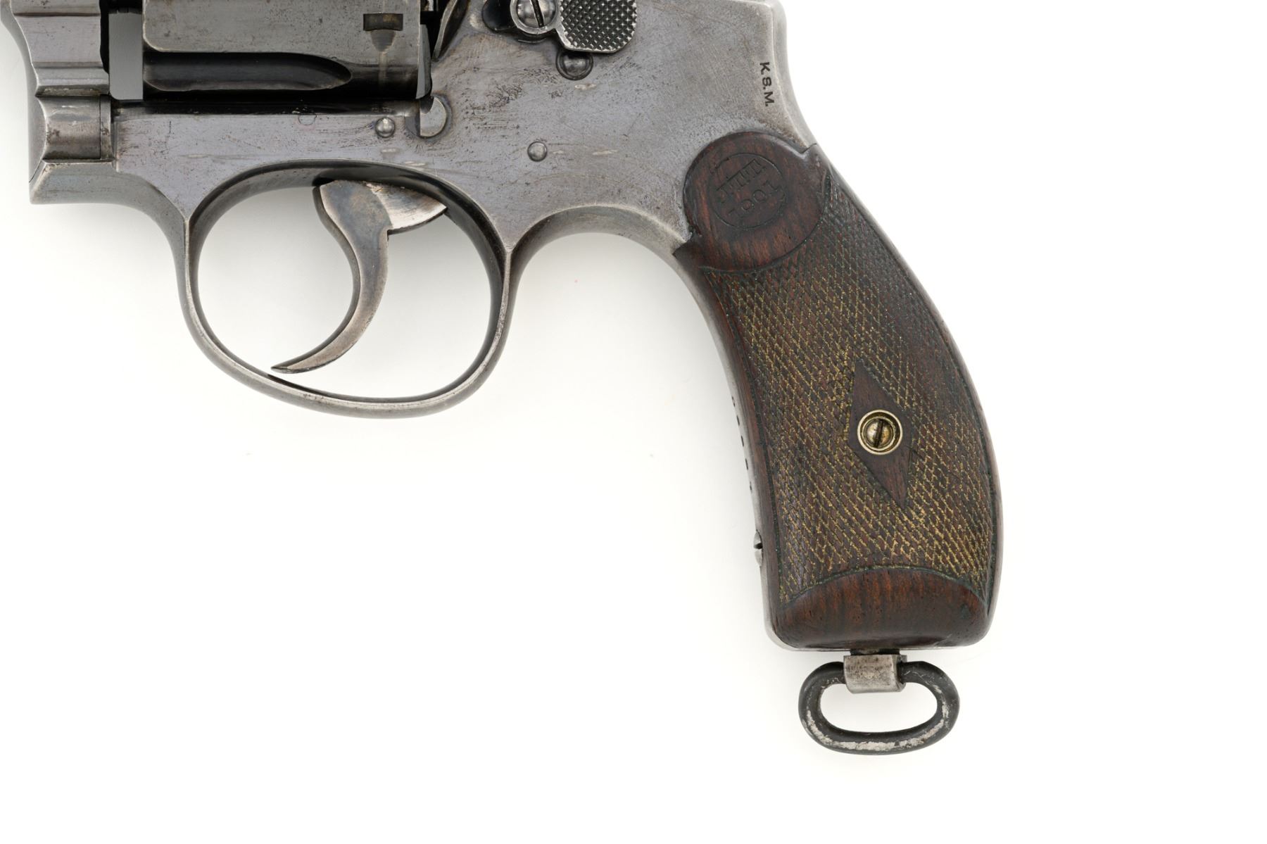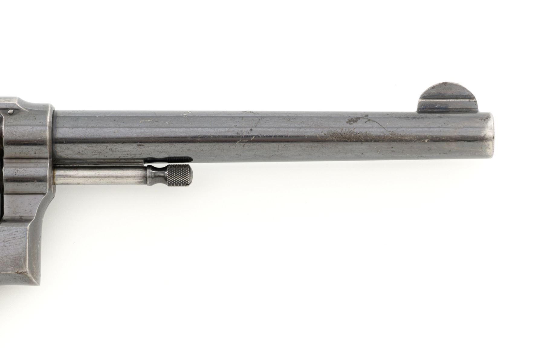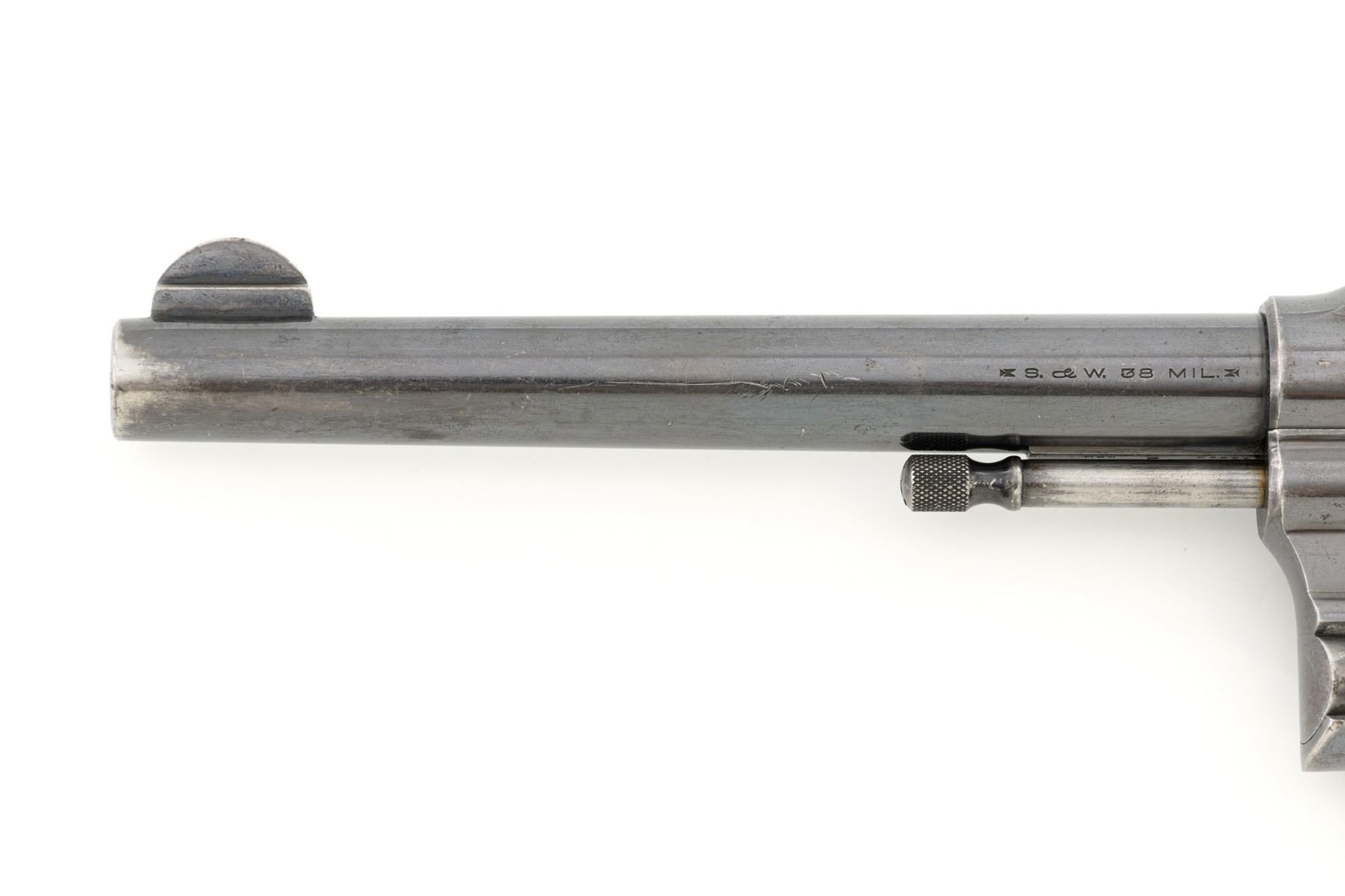 Scarce U.S. Army Marked Smith & Wesson 1st Model 1899 Military & Police Double Action Revolver, #13890, .38 Long Colt cal., 6" barrel, blue finish, checkered walnut two-piece diamond center grips with lanyard ring, blade front sight, fixed "U"-notch rear sight, color case hardened hammer and trigger. Factory markings are clear, with the butt marked "U.S. ARMY / MODEL 1899". Revolver is in very good overall condition, retaining approx. 80%-85% thinning finish, with wear at the muzzle, scratches, and scattered spots of surface erosion. Cylinder shows leading edgewear, wear around the flutes, and numerous indentations. Front and backstrap have worn to gray, while the trigger guard shows traces of original finish. There is a crisp "K.S.M." (Kelley S. Morse) inspection mark at the left rear of the frame. Hammer and trigger display muted color case hardened finish. Grips are in very good condition, with areas of smoothing to the checkering and indentations on the right panel. Marked "J.T.T 1901" (John Taliaferro Thompson) at the top of the left panel and "K.S.M." at the top of the right. Interior of the right panel is lightly marked in pencil with the matching serial number. Action functions well and locks up securely. Bore is very good with some areas of light erosion and well-defined rifling. Part of a group of 1,000 revolvers issued to the U.S. Army in the S&W serial number range 13001-14000. Chambered in .38 Long Colt, referred to as ".38 Military" to avoid using a competitors name. Est.: $1,200-$1,800. (C&R)