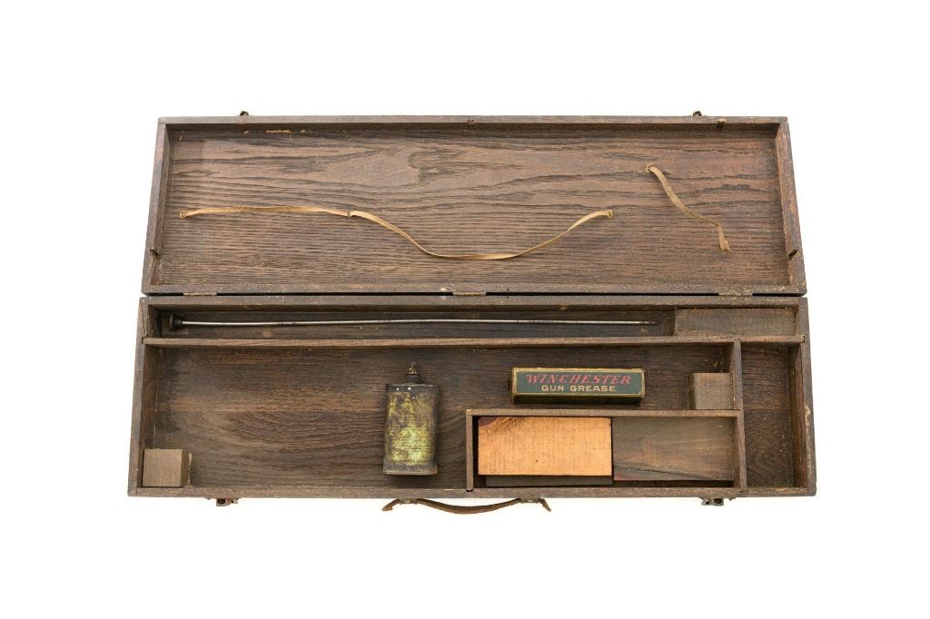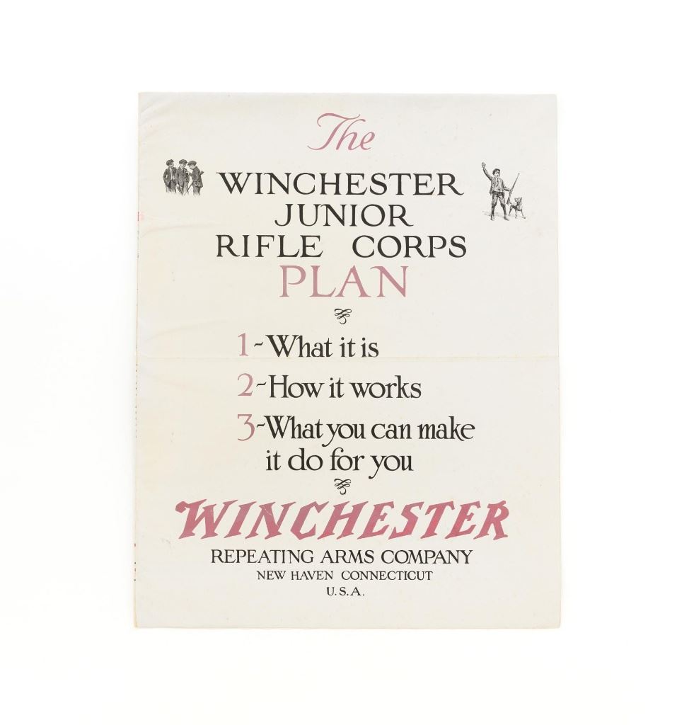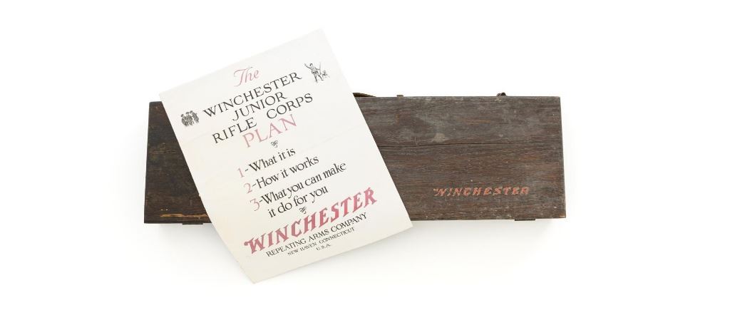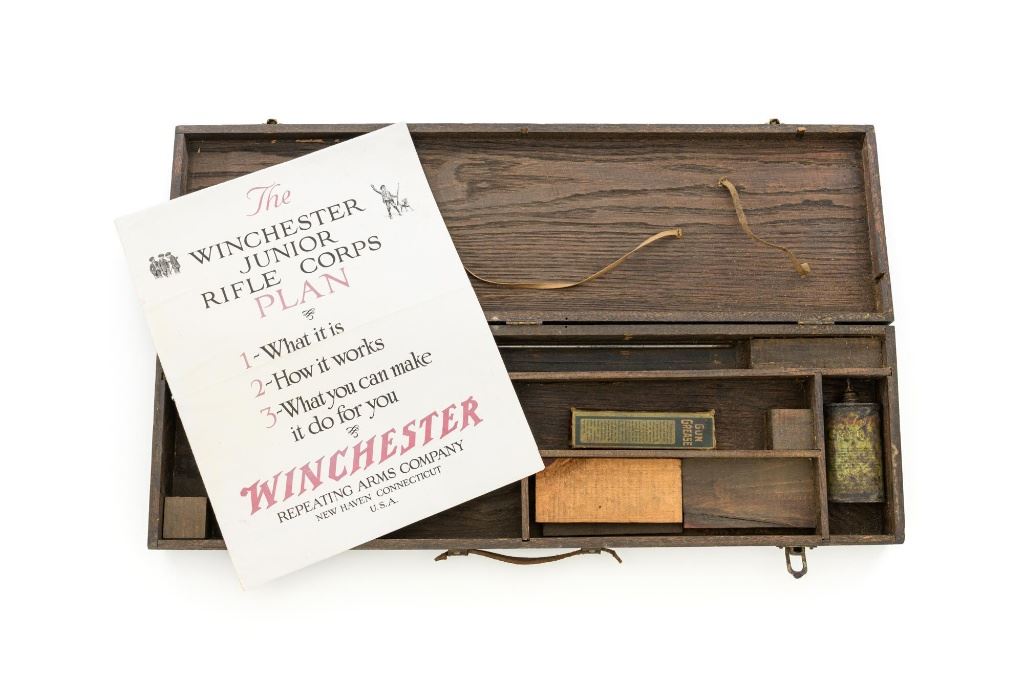 Scarce Winchester Junior Rifle Corps Range Kit Wooden Case with Accessories, wooden case measures 26.75" in length, 8" in width, and 3" in depth, and is in good overall condition. Exterior shows typical weathering and wear to the edges. There are two full-length cracks spanning the length of the lid. The red Winchester marking is clearly visible. Case shows dovetailed construction with brass hardware and leather handle. Brass hardware has gone to a dark patina with age. Interior consists of bare wood partitions, configured for a takedown rifle, with original retention straps in the lid. The case includes a vintage Winchester heavy gun oil can, tube of Winchester gun grease in the original box, and nickel cleaning rod with a brass cap. Interior is in very good condition, showing age, with scrapes and soiling. Beginning in 1918, the Winchester Junior Rifle Corps (WJRC) offered young shooters not only membership in the Corps, but the option to purchase one of two range kits. Kit #1 included a Model 1902 single shot .22 takedown rifle. Kit #2 included a Model 1904 .22 takedown rifle. Each kit included a "Handsome mission-finished wood case fitted with leather handle". The wood case included the range kit of gun oil, grease, cartridge pouch, belt, targets, cartridges and additional accessories. The WJRC operated into the 1930s, including over 100,000 youth worldwide at its peak. The lot includes a copy of a Winchester advertiser explaining the WJRC plan. A rarely encountered piece that should be completed and displayed. Est.: $1,000-$2,000.