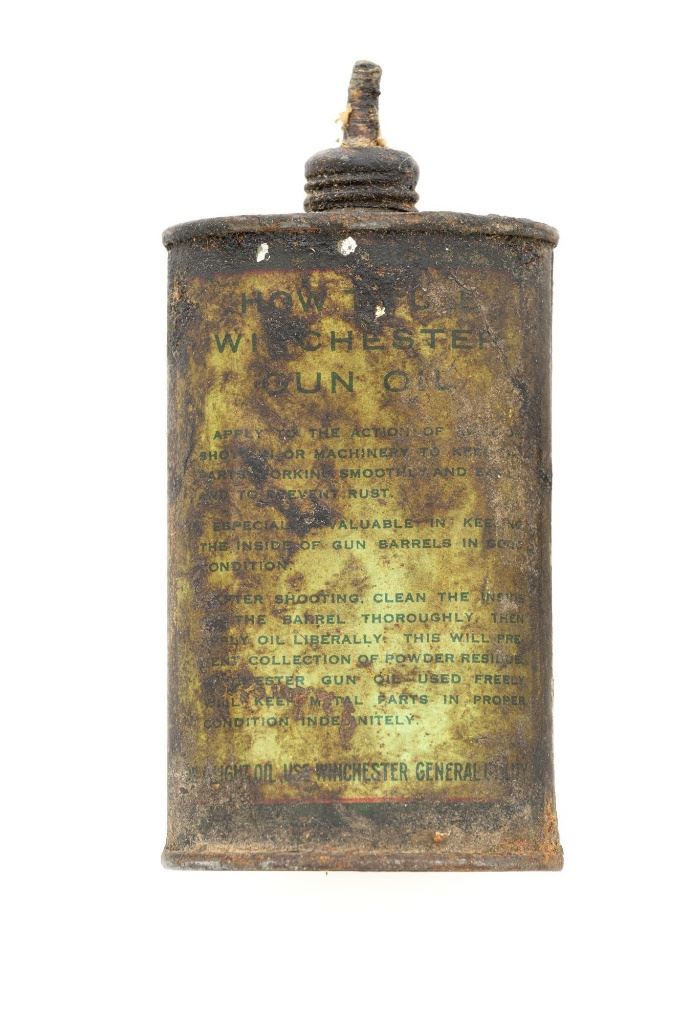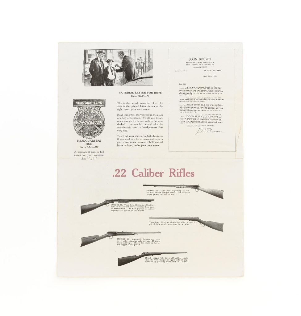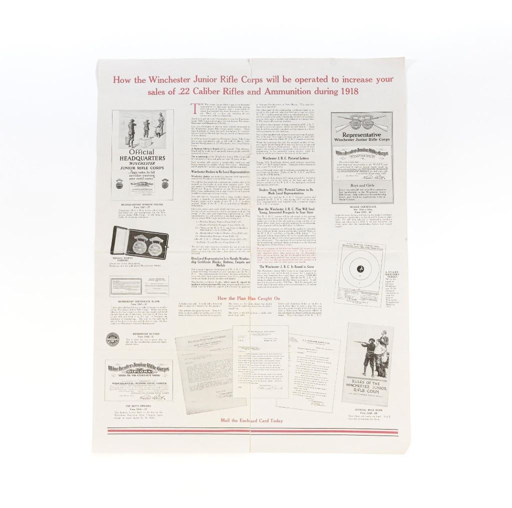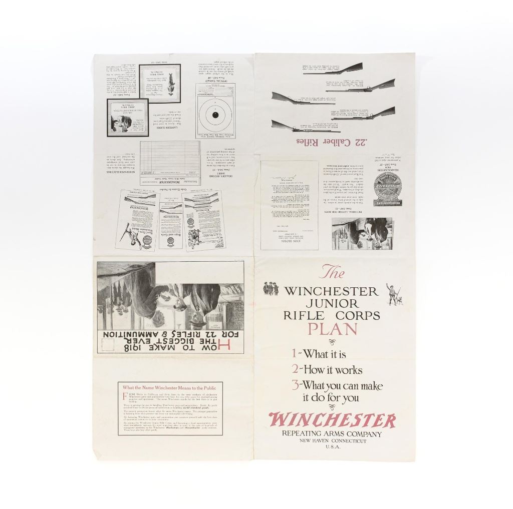 Scarce Winchester Junior Rifle Corps Range Kit Wooden Case with Accessories, wooden case measures 26.75" in length, 8" in width, and 3" in depth, and is in good overall condition. Exterior shows typical weathering and wear to the edges. There are two full-length cracks spanning the length of the lid. The red Winchester marking is clearly visible. Case shows dovetailed construction with brass hardware and leather handle. Brass hardware has gone to a dark patina with age. Interior consists of bare wood partitions, configured for a takedown rifle, with original retention straps in the lid. The case includes a vintage Winchester heavy gun oil can, tube of Winchester gun grease in the original box, and nickel cleaning rod with a brass cap. Interior is in very good condition, showing age, with scrapes and soiling. Beginning in 1918, the Winchester Junior Rifle Corps (WJRC) offered young shooters not only membership in the Corps, but the option to purchase one of two range kits. Kit #1 included a Model 1902 single shot .22 takedown rifle. Kit #2 included a Model 1904 .22 takedown rifle. Each kit included a "Handsome mission-finished wood case fitted with leather handle". The wood case included the range kit of gun oil, grease, cartridge pouch, belt, targets, cartridges and additional accessories. The WJRC operated into the 1930s, including over 100,000 youth worldwide at its peak. The lot includes a copy of a Winchester advertiser explaining the WJRC plan. A rarely encountered piece that should be completed and displayed. Est.: $1,000-$2,000.