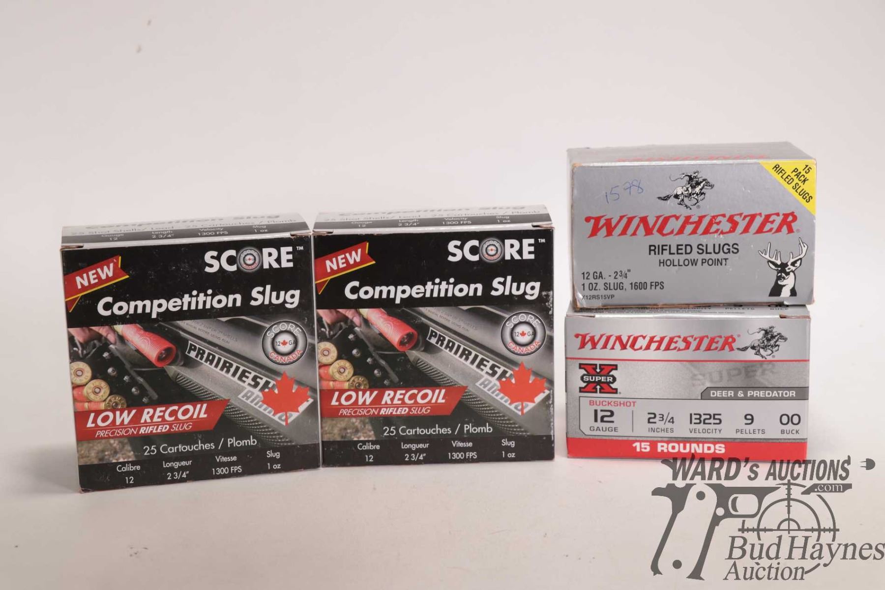 Selection of 12 gauge ammo including one full 25 count box of Winchester rifled slugs Hollow point 2-384", one full 25 count box of Winchester 2-3/4" 00 Buck, and two full 25 count boxes of Score 2-3/4" competition slugs