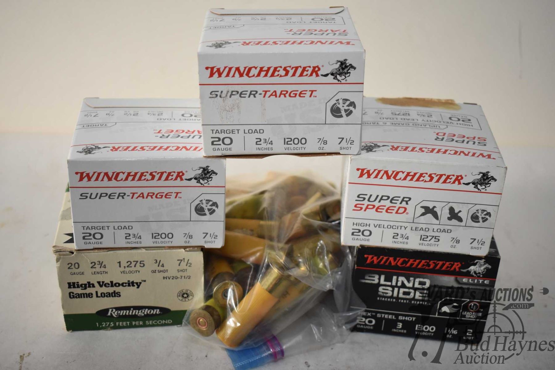 Selection of 20 GA ammo including three full 25 count boxes Winchester syper target 2 3/4" #7 1/2, one full 25 count box Remington high velocity game loads 2 3/4" #7 1/2, one full 25 count box Winchester blind side 3" #2 and a bag w/ 33 count mixed 20 GA rounds