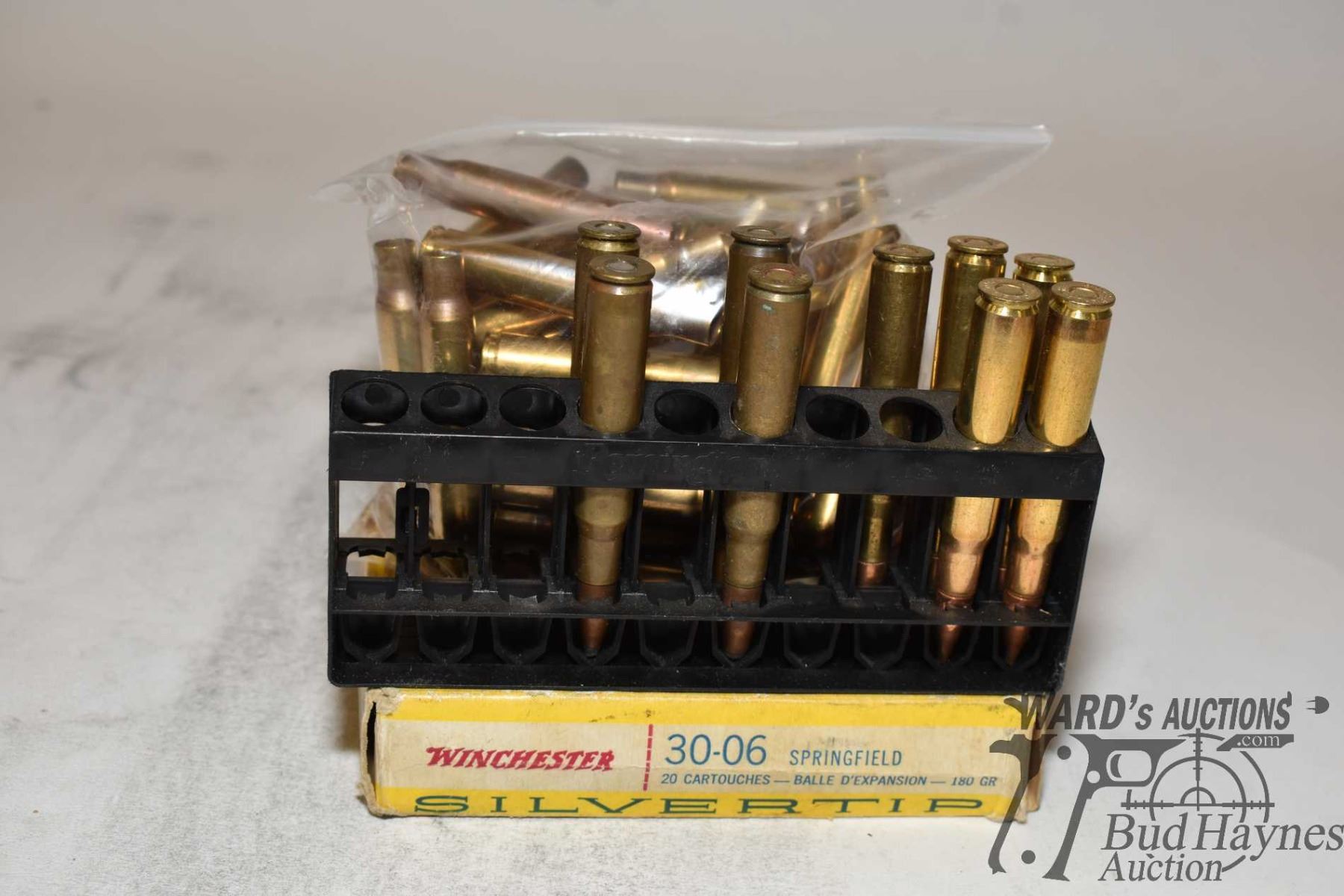 Selection of .30-06 including one partial 9 count box of Winchester 180 gr expanding bullet ammo pack w/ 9 mixed factory and reloads, plus a bag of 50 .30-06 primed brass