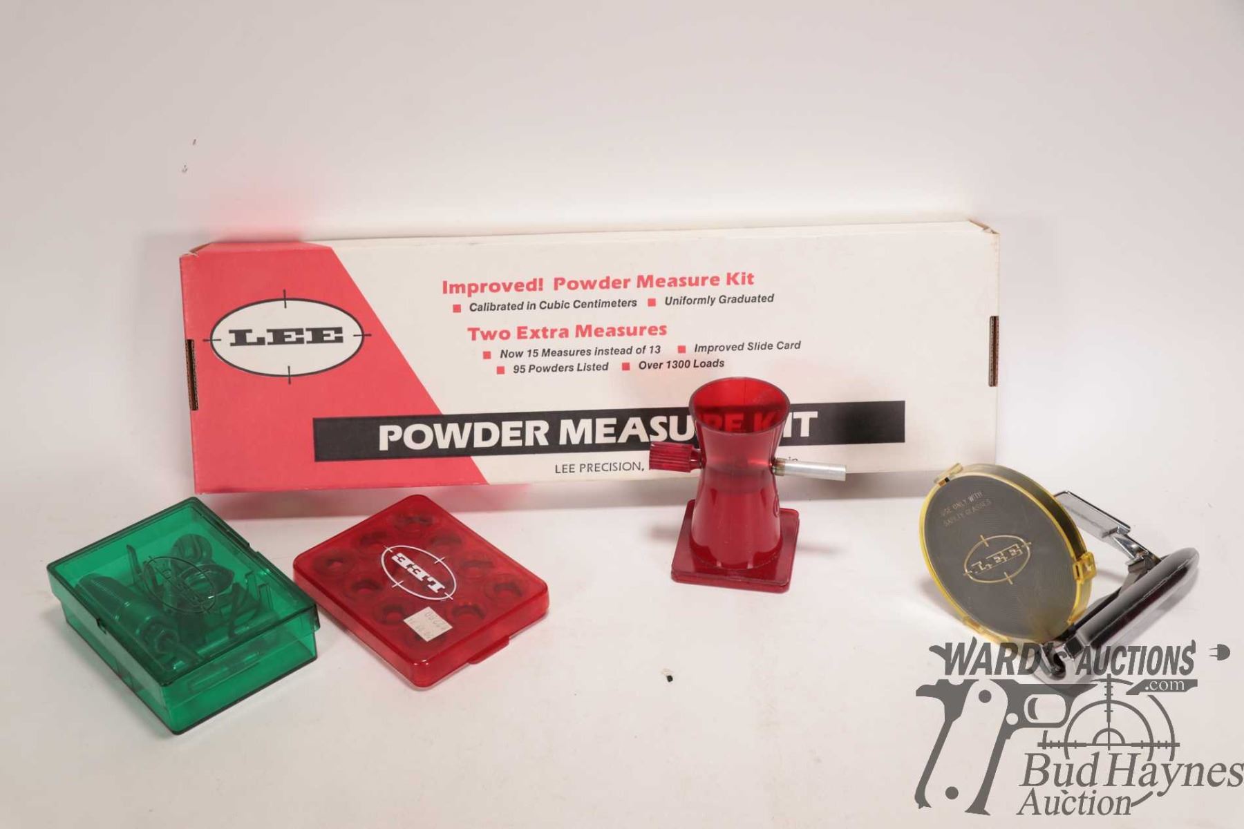 Selection of Lee loading tools including powder measuring kit, .308 single die, primer installer and