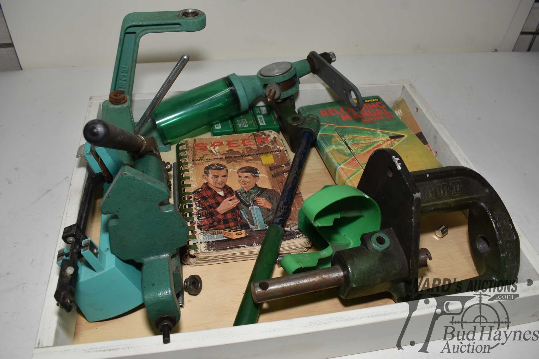 Selection of RCBS loading tools including powder measure, presses, scale, bullet sizer dies, etc