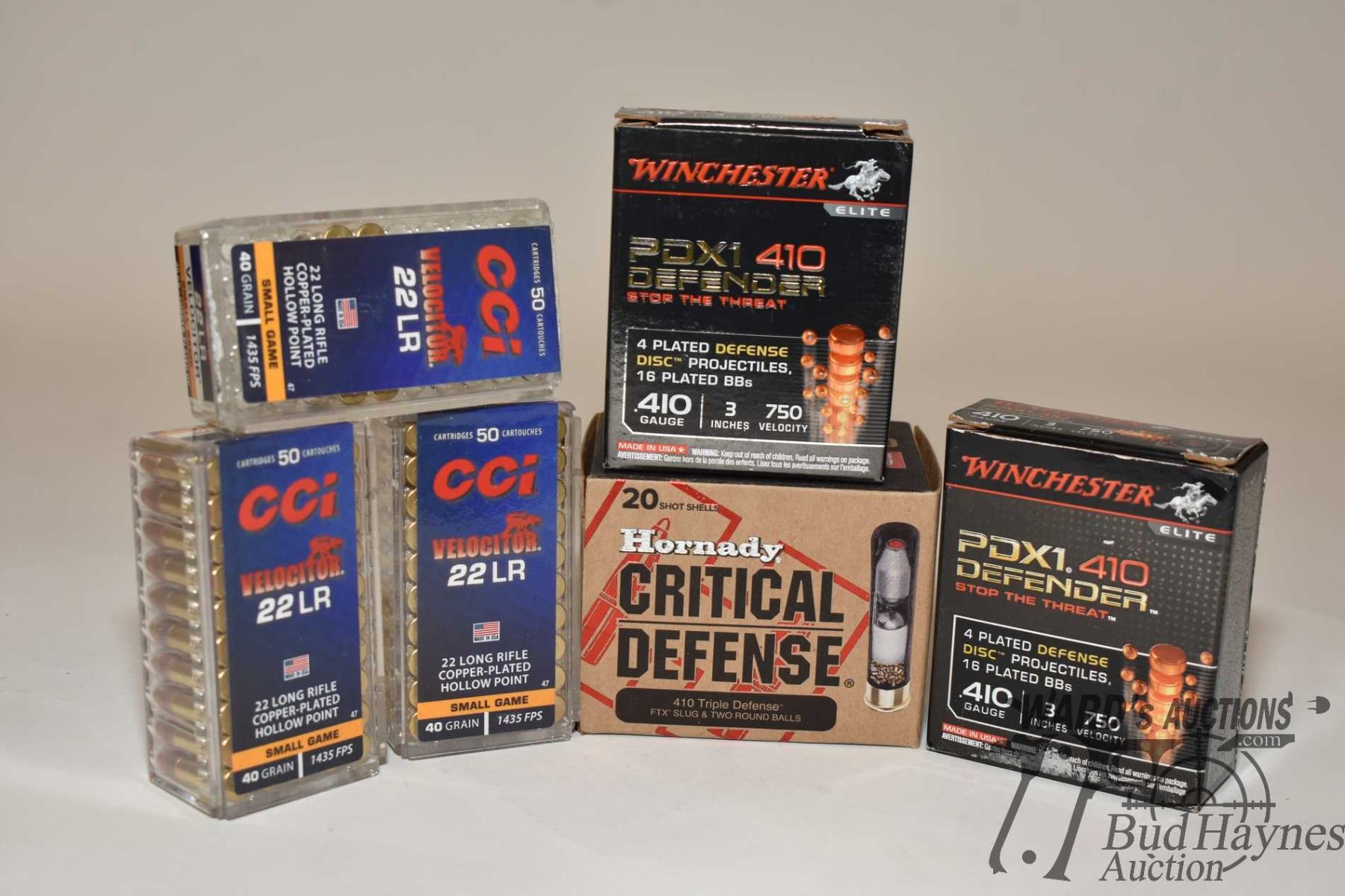 Selection of ammo including one full 20 count box of Hornady critical defense .410 2 1/2" .41 cal FTX slug, two full 10 count Winchester Defender .410 3" and one 10 count CCI .22 LR 40 gr CPHP