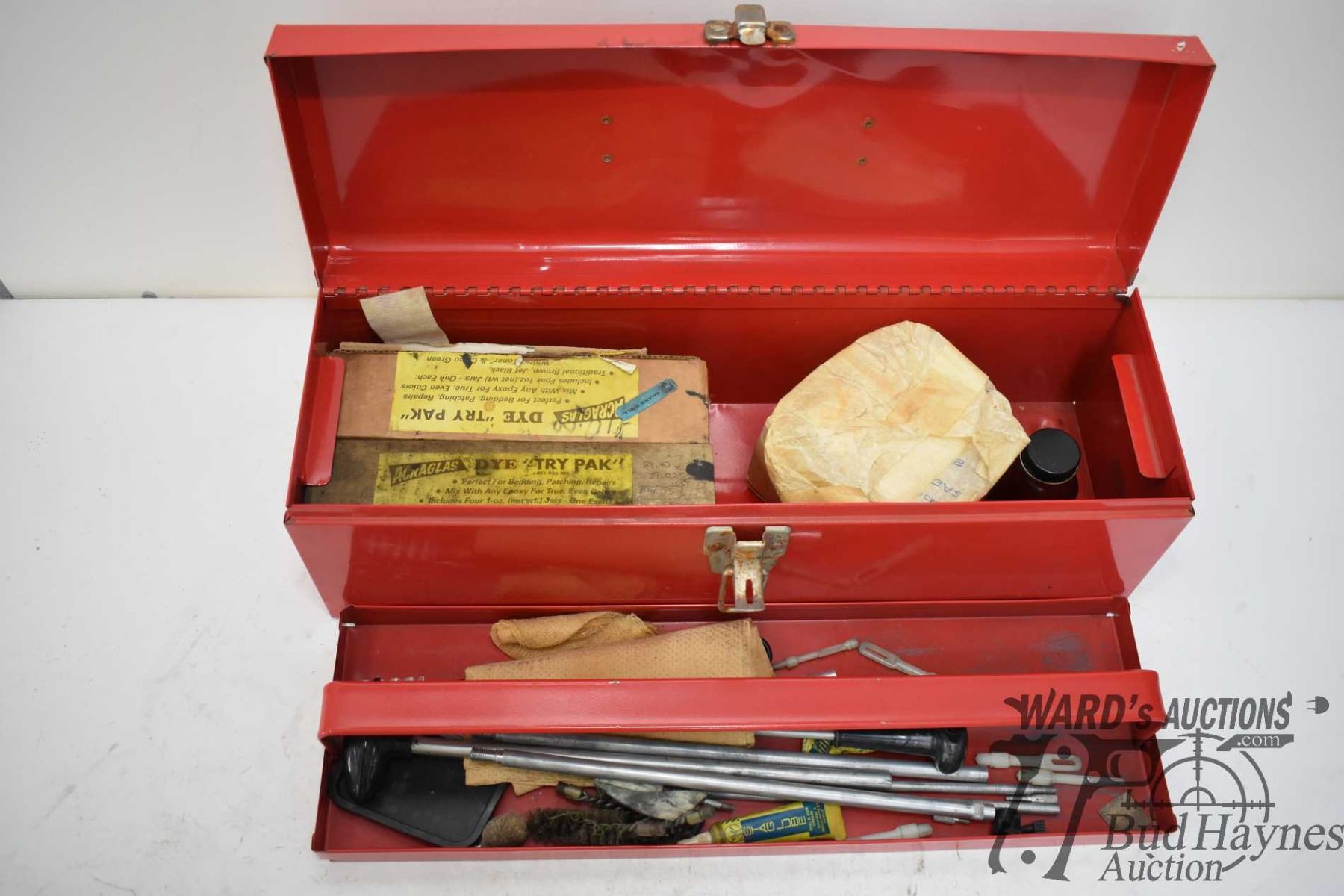 Selection of cleaning supplies including multi caliber cleaning kits, Acraglas gel, bore snake, etc.