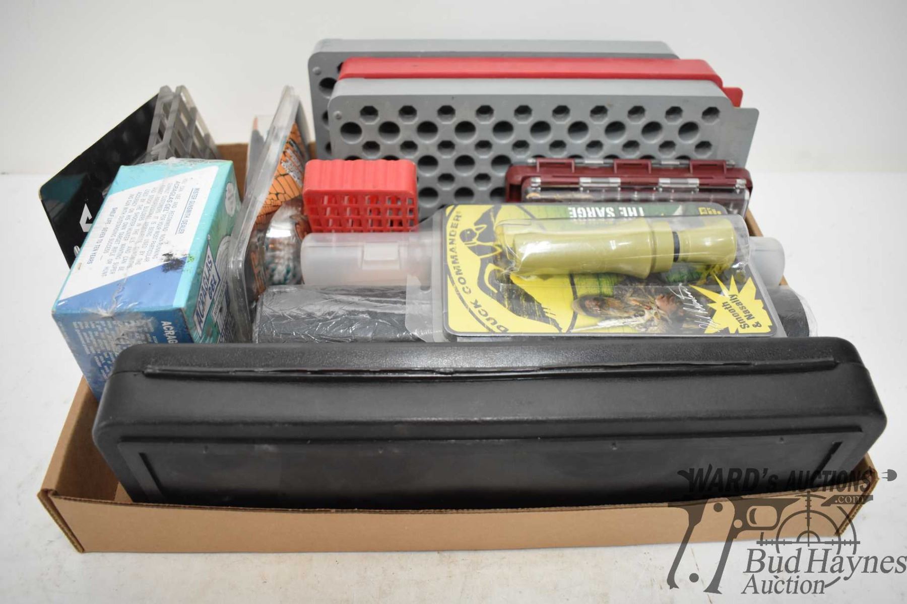 Selection of cleaning supplies including multi caliber cleaning kits, Acraglas gel, bore snake, etc. Plus compass and animal call