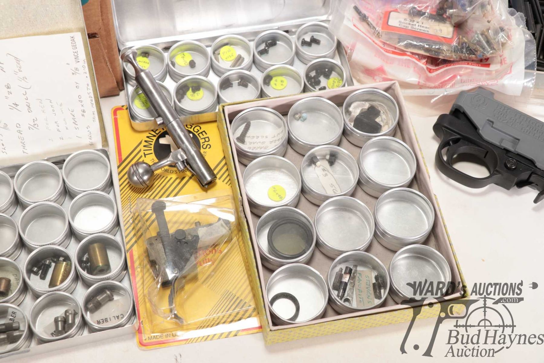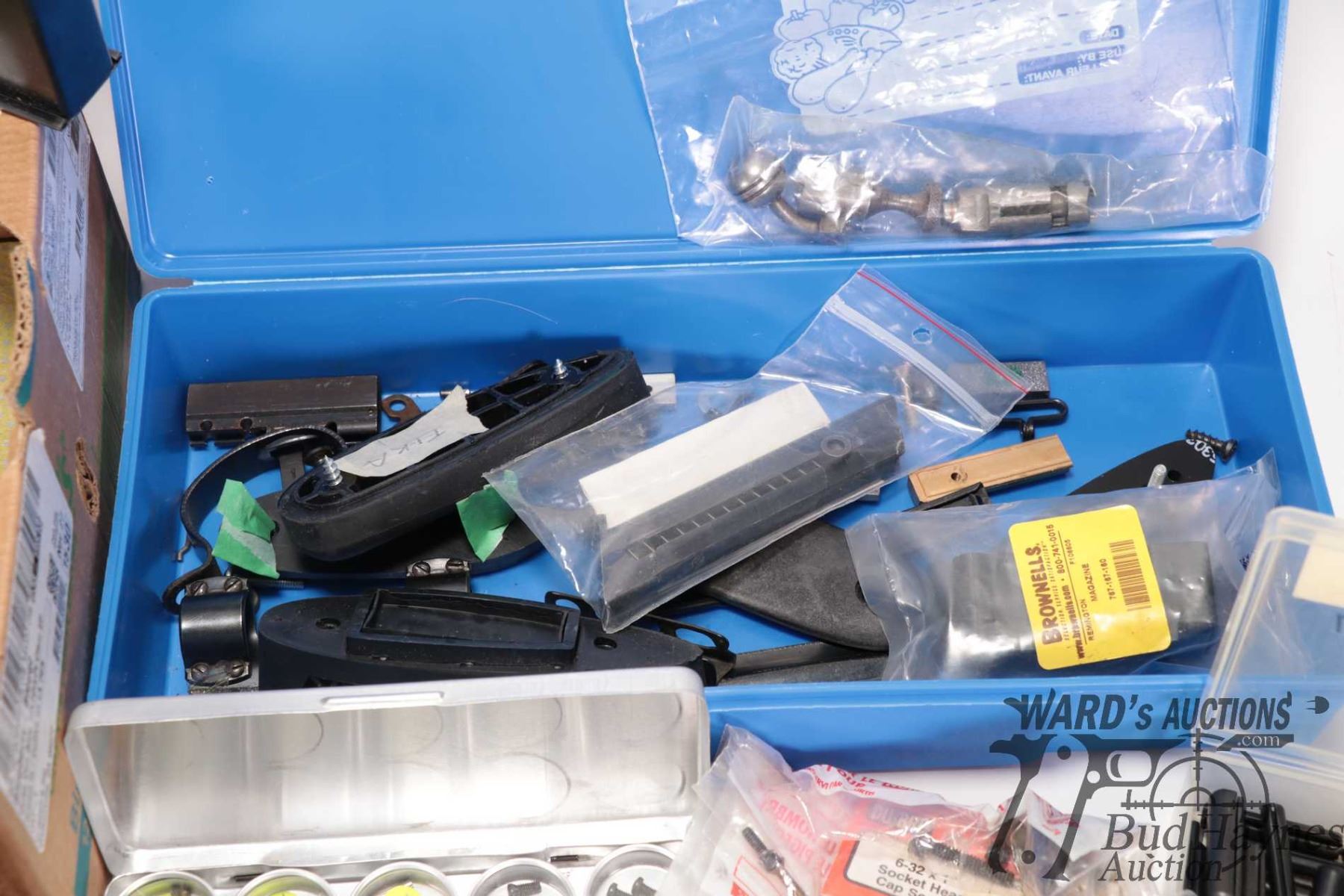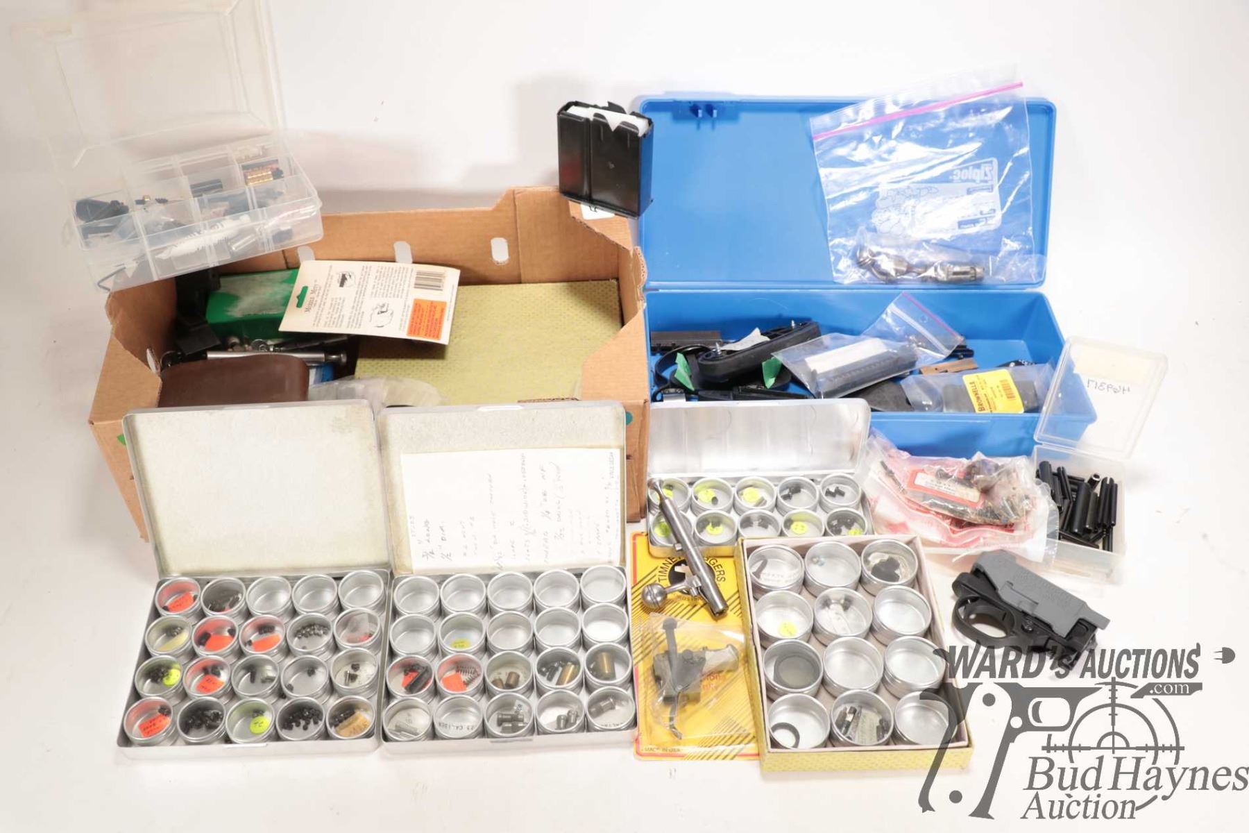 Selection of gun parts including triggers, mags, butt covers, an assortment of screws, etc