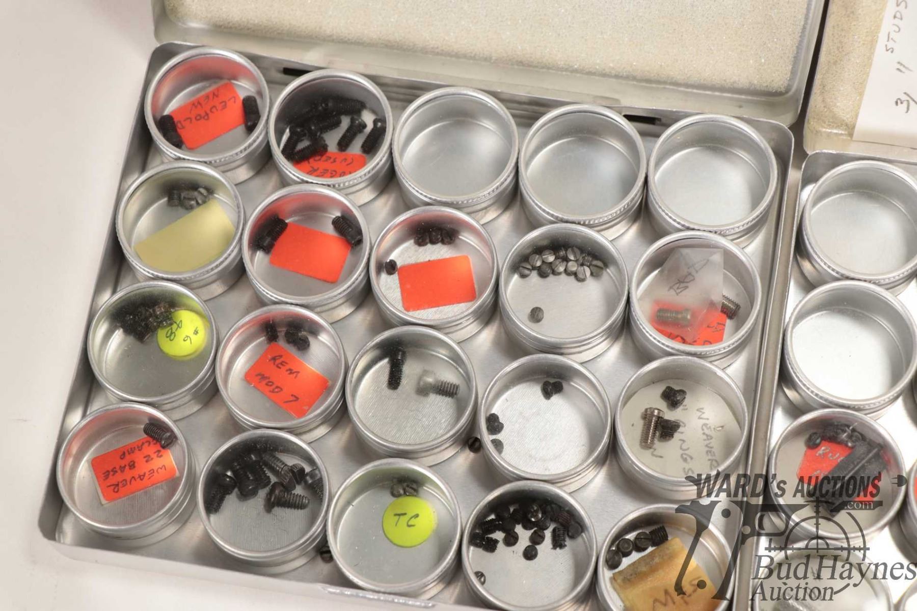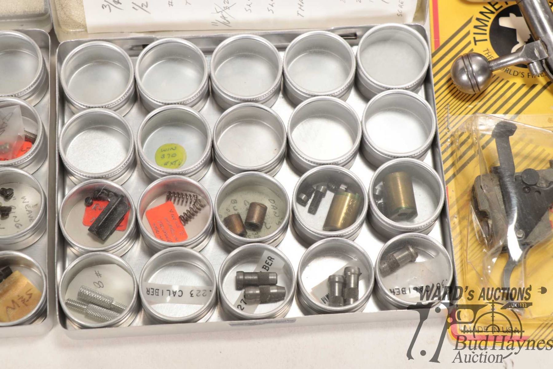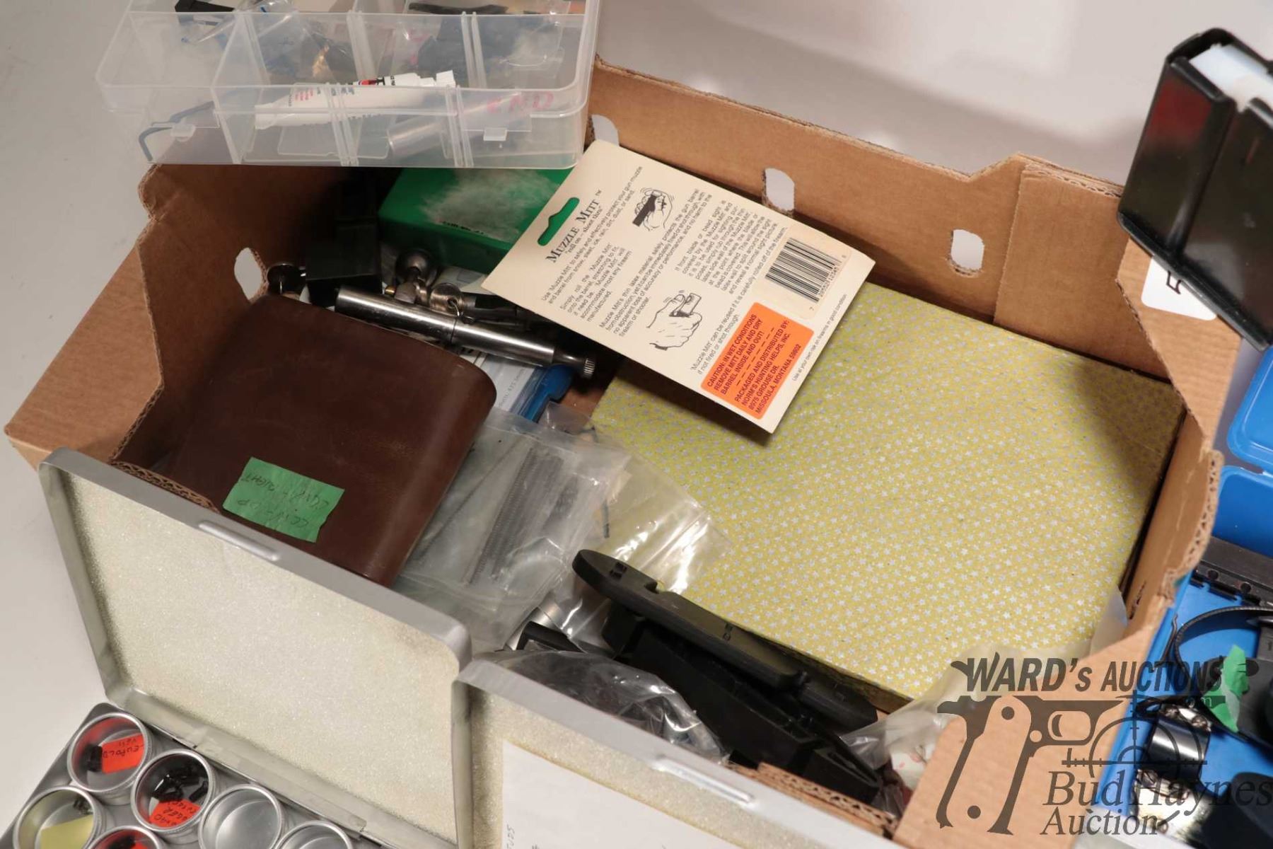 Selection of gun parts including triggers, mags, butt covers, an assortment of screws, etc
