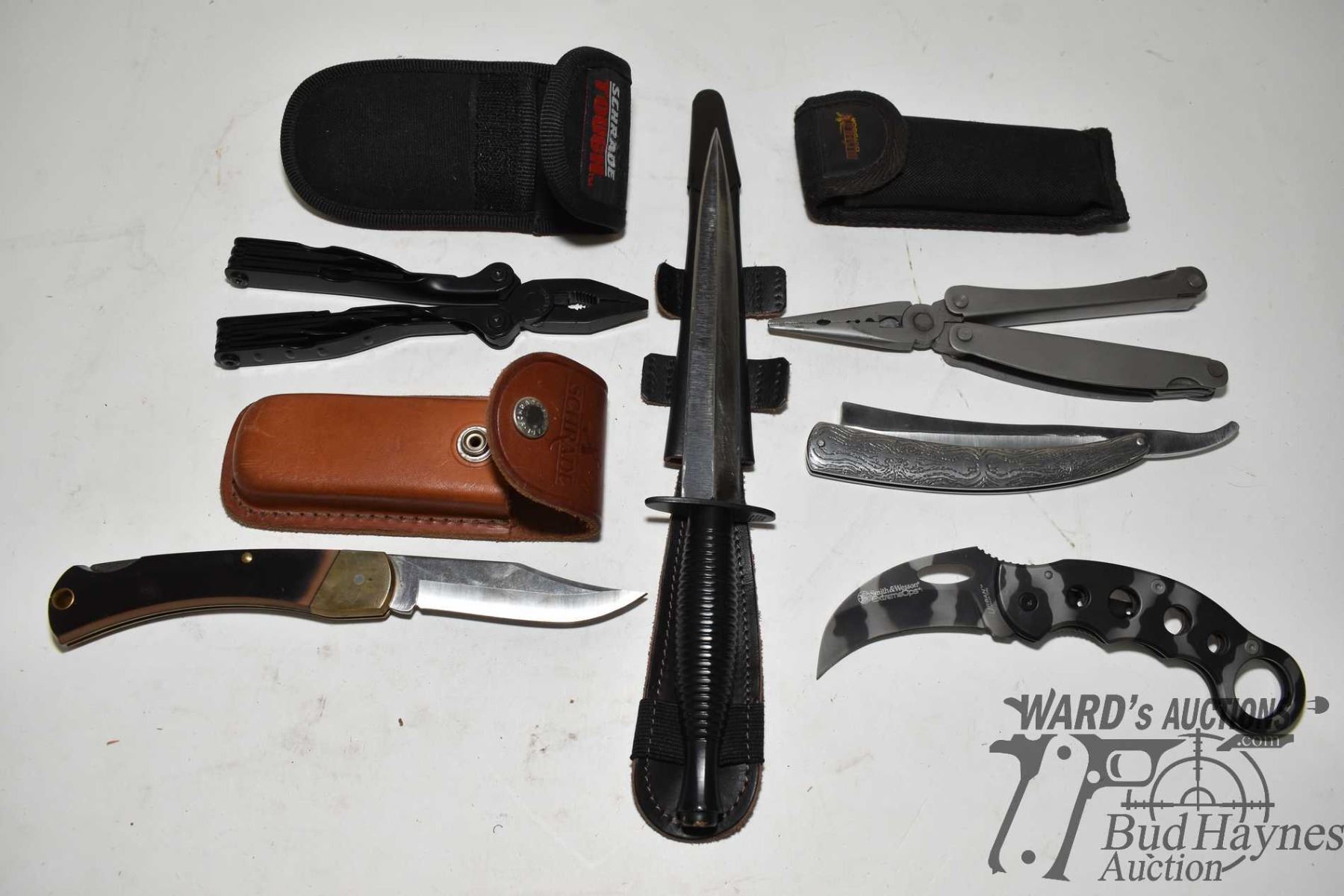 Selection of knives and tools including Schrade old timer in leather sheath, Schrade multi tool in case, Smith & Wesson tactical folding knife, straight razor style knife, 7" duel sided blade knife w/ sheath and a Bushlite multi tool in case