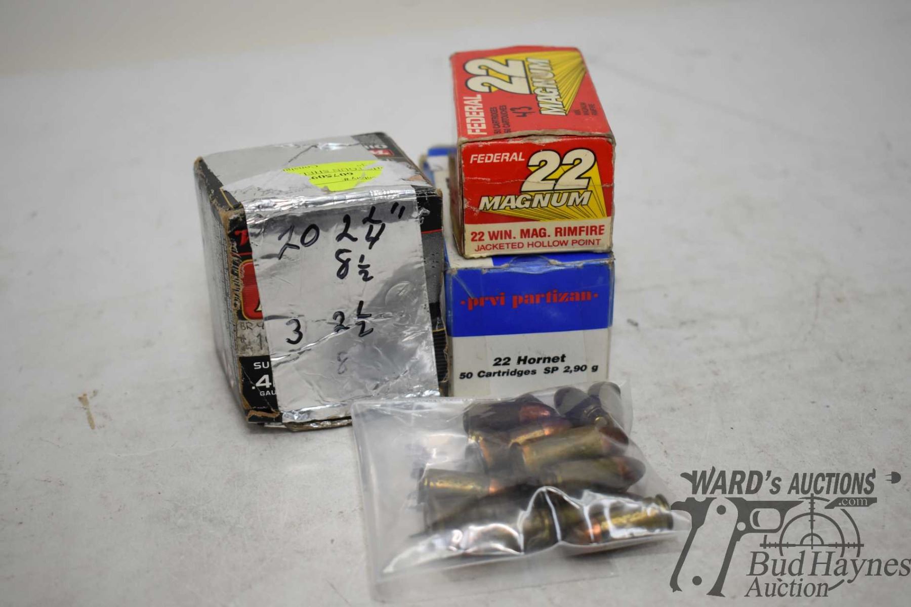 Selection of misc. ammo including partial 43 count box Federal .22 magnum, partial 25 count box Pro partizan .22 hornet 45 gr SP, bag w/ 13 9mm rounds and 1 .45 auto and a partial 20 count box Winchester .410 2 1/4" #8 1/2 and 3 .410 2 1/2" #8