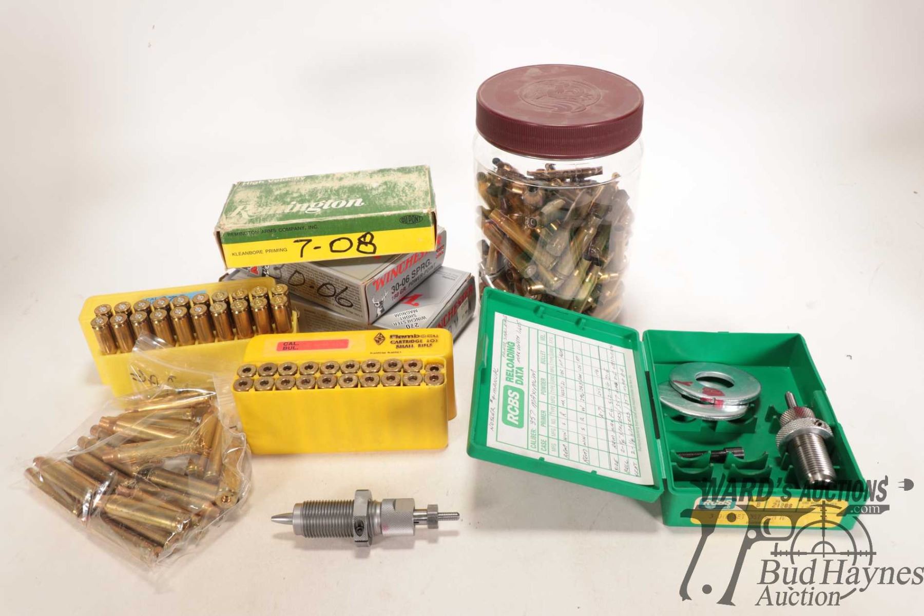 Selection of mixed rifle brass including 7mm-08, .270, 20-06, 7mm Rem Mag etc. plus a .357 Rem Max single die and a 7mm-08 single die