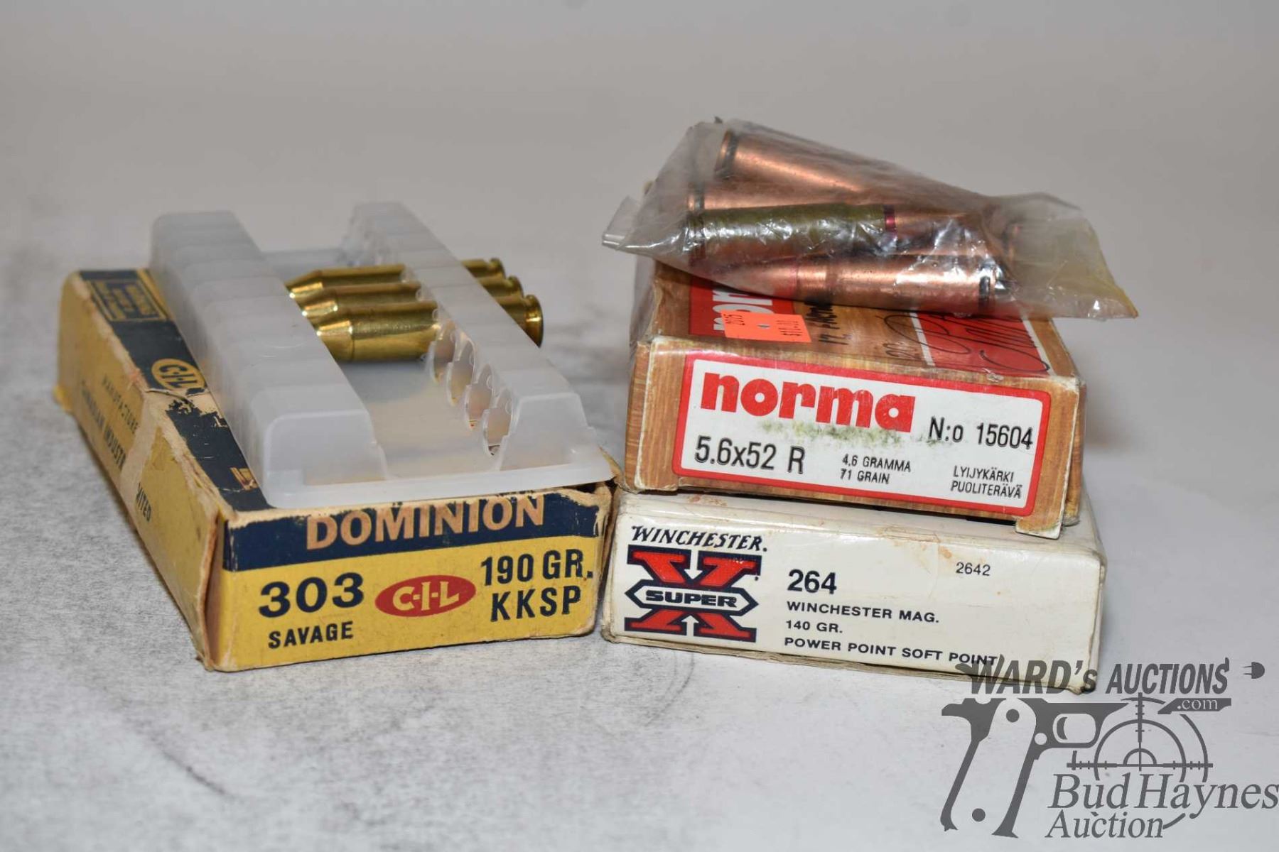 Selection of partial boxes of ammo including 12 count Norma 5.6 x 52R 71 gr, 7 count vintage Dominion .303 sav 190 gr KKSP, 4 count Winchester .264 win mag 140 gr PPSP, 3 count .243 and 8 count 7.62 x 39. All appear to be factory loads