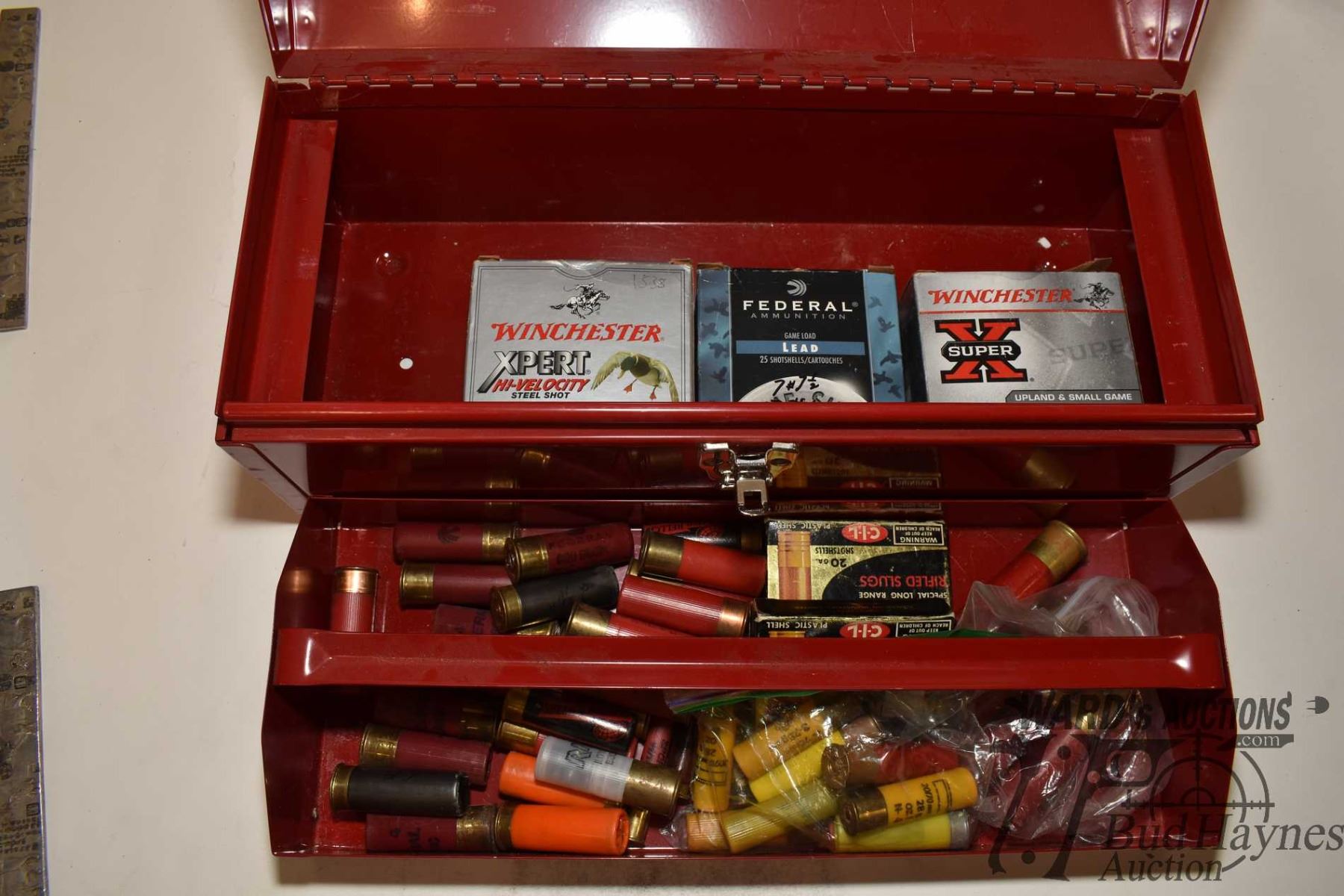 Selection of shotgun ammo including one 8 GA, four 10 GA, one full 25 count box of Winchester 12 GA 3" BB, 8 count box of Winchester 12 GA 2 3/4" #4, 25 count loose mixed 12 GA, partial 14 count box w/ seven 16 GA 2 3/4" and seven 16 GA 2 3/4" # 7 1/2, nine Imperial 20 GA rifled slugs, bag of 10 mixed 20 GA and two .410. All in red tool box